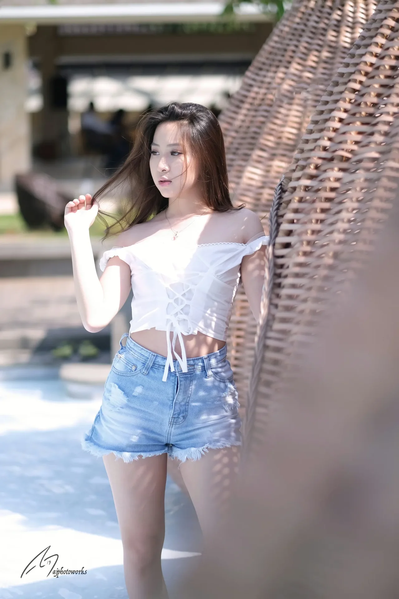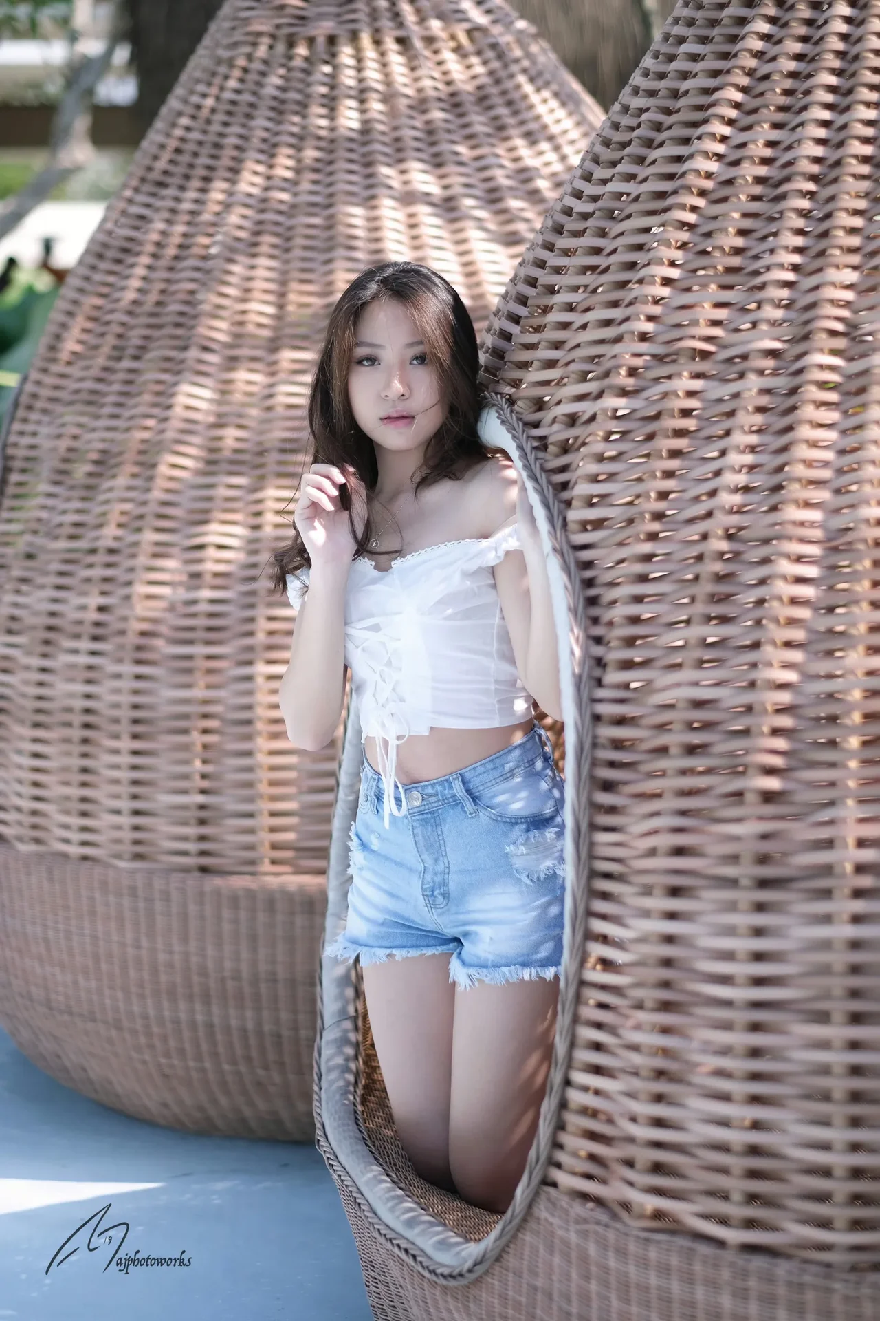 Effortless summer charm meets chic audacity in this sunlit portrait featuring a high-low denim top and distressed denim shorts, framed by woven wicker structures in a lively outdoor setting.