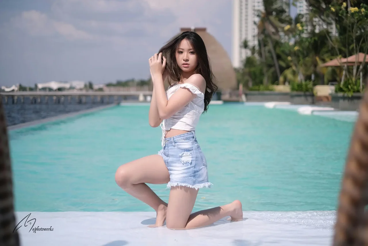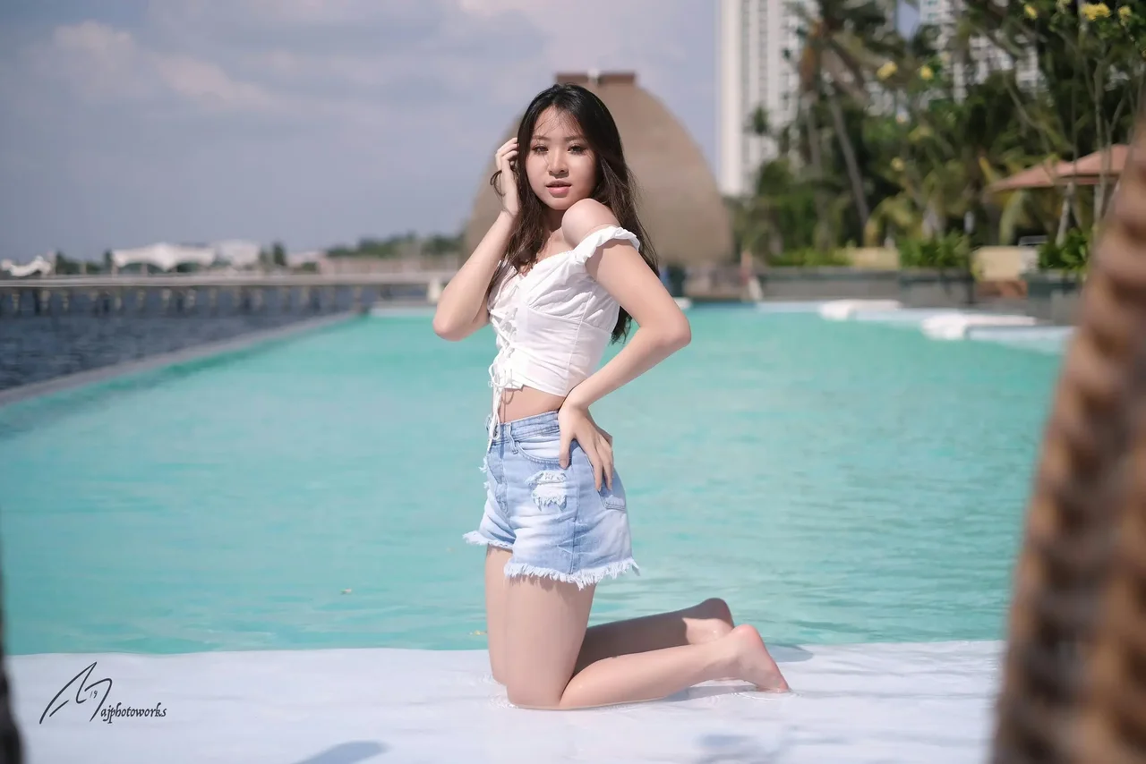 Casual elegance meets urban vibrancy by the poolside, where light dances on fabric and water.