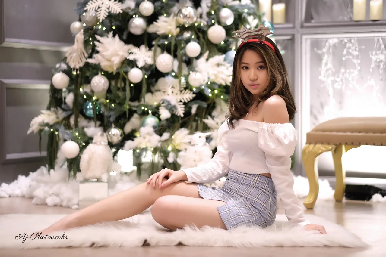 Festive Christmas vibes in a stylish indoor studio with a decorated tree and model.