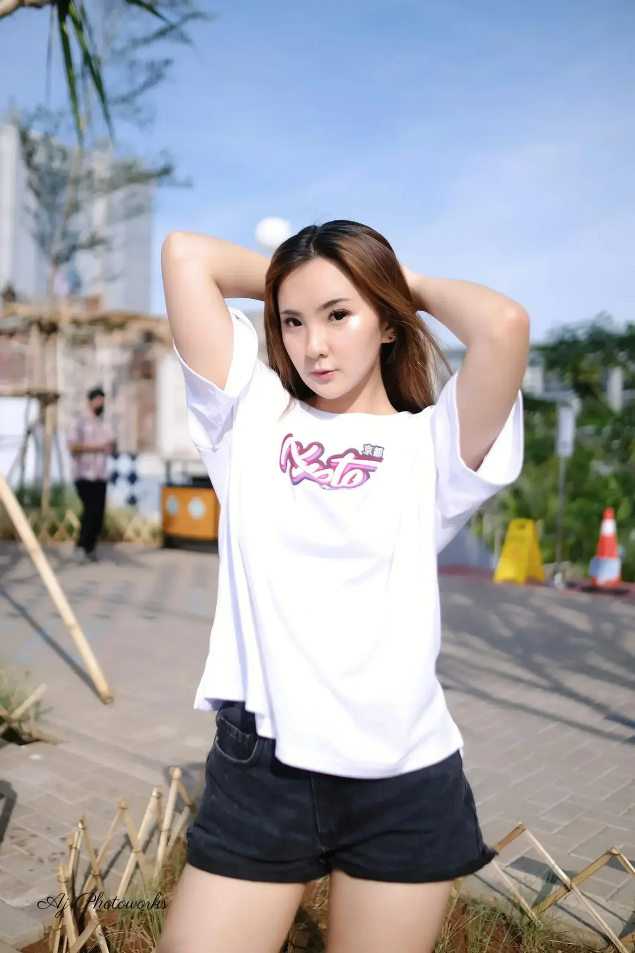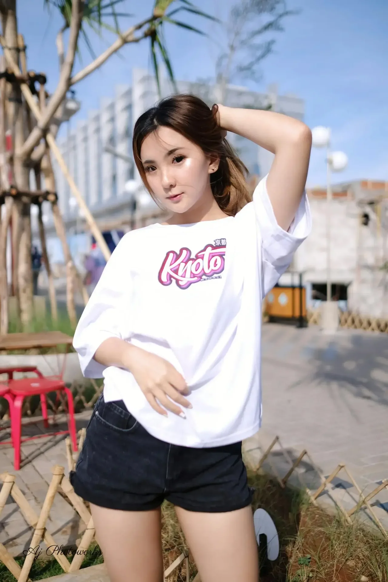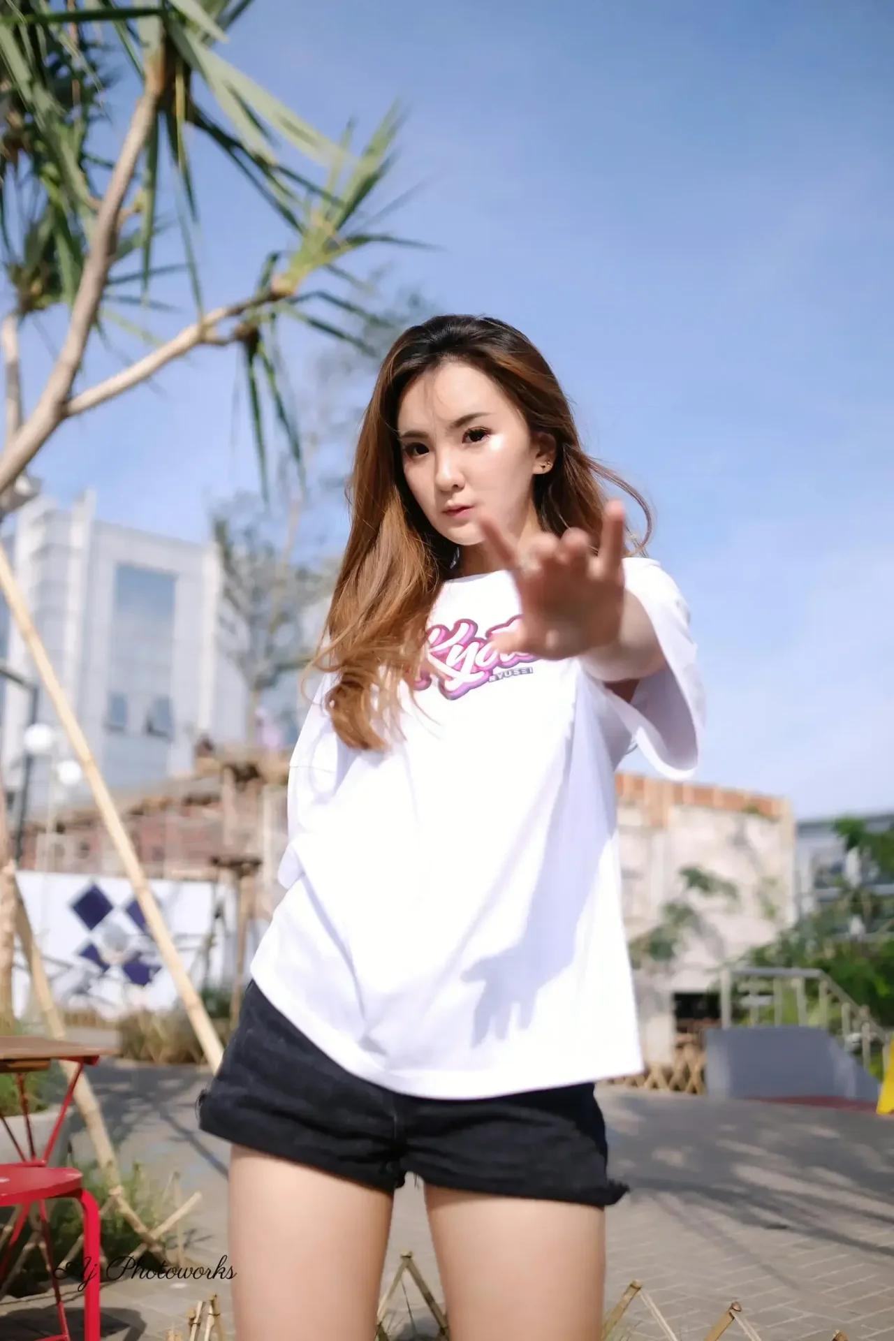 Street style meets casual urban charm under a bright tropical sky.