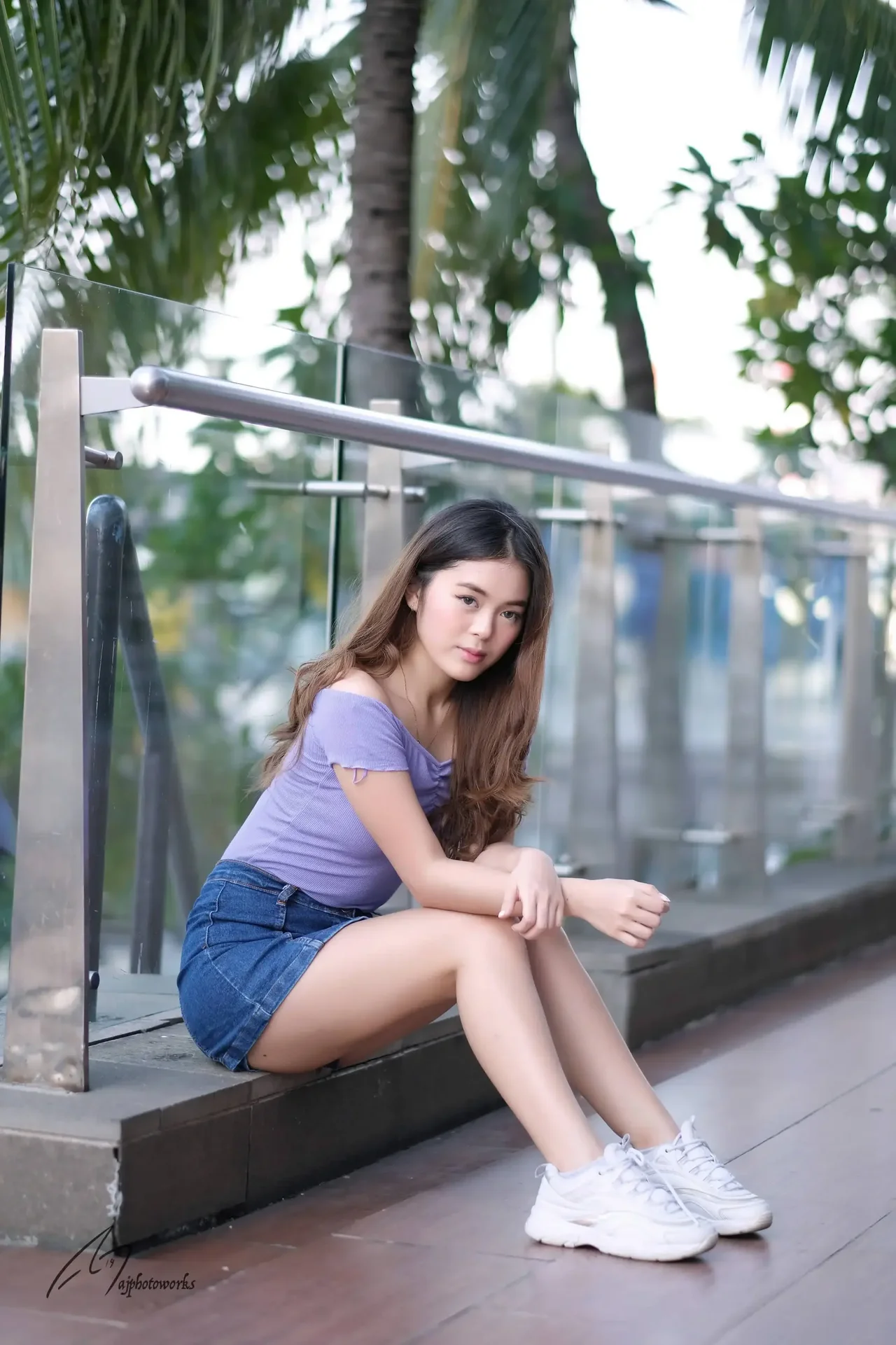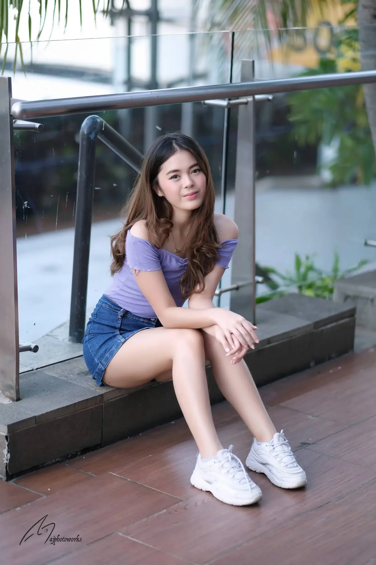 A poised young woman in a stylish ensemble of a purple off-the-shoulder top and denim skirt leans casually against a modern glass railing, showcasing a blend of casual elegance and contemporary fashion.