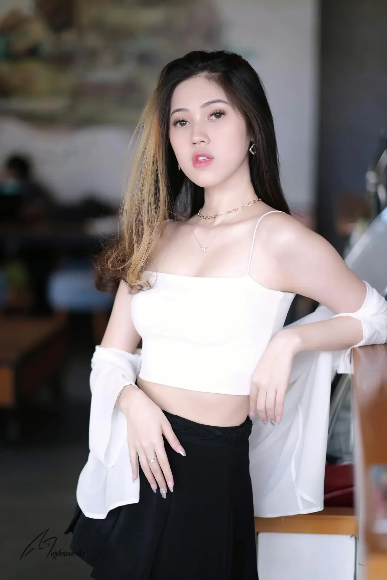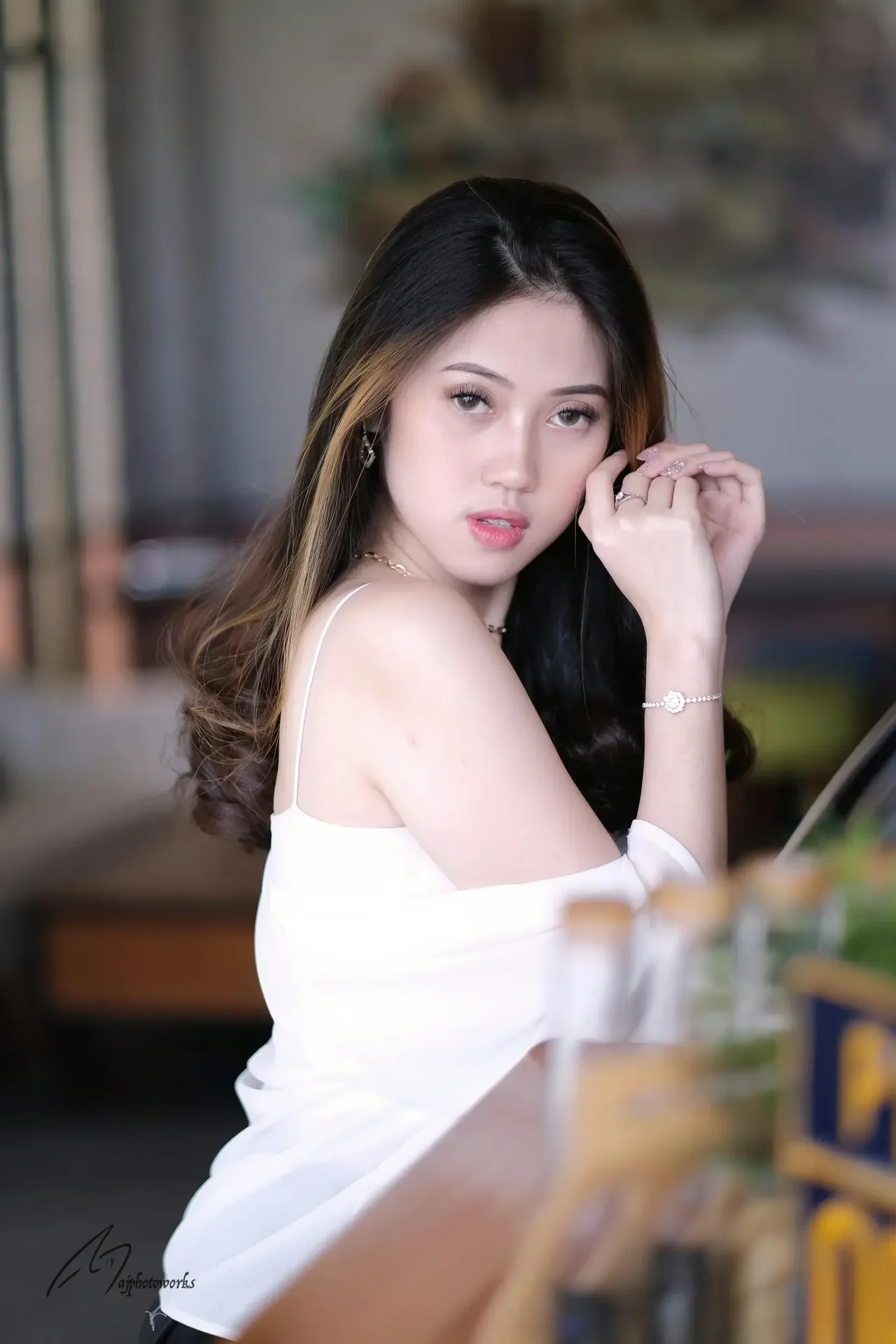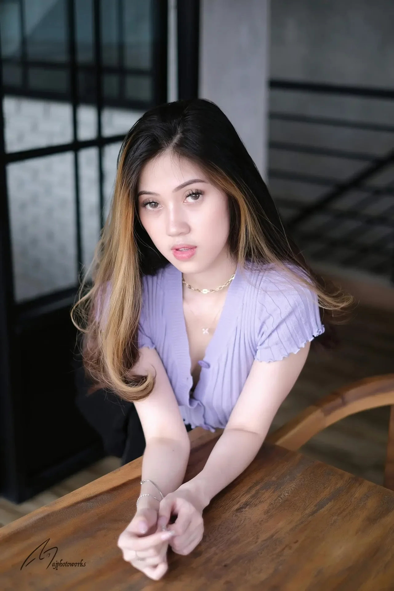 Modern casual fashion meets urban sophistication in a cozy café setting.