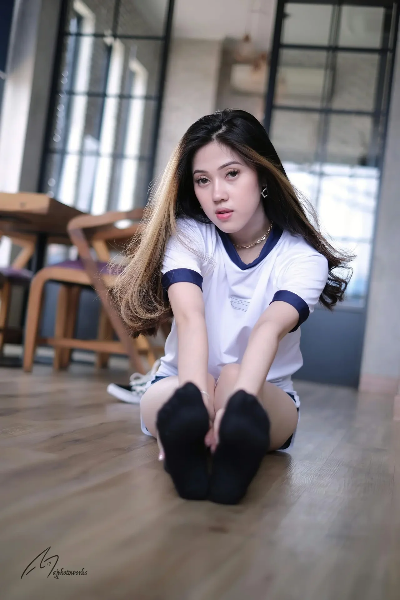 A modern fashion portrait showcasing a chic, casual-athleisure ensemble in a bright, industrial-chic interior.