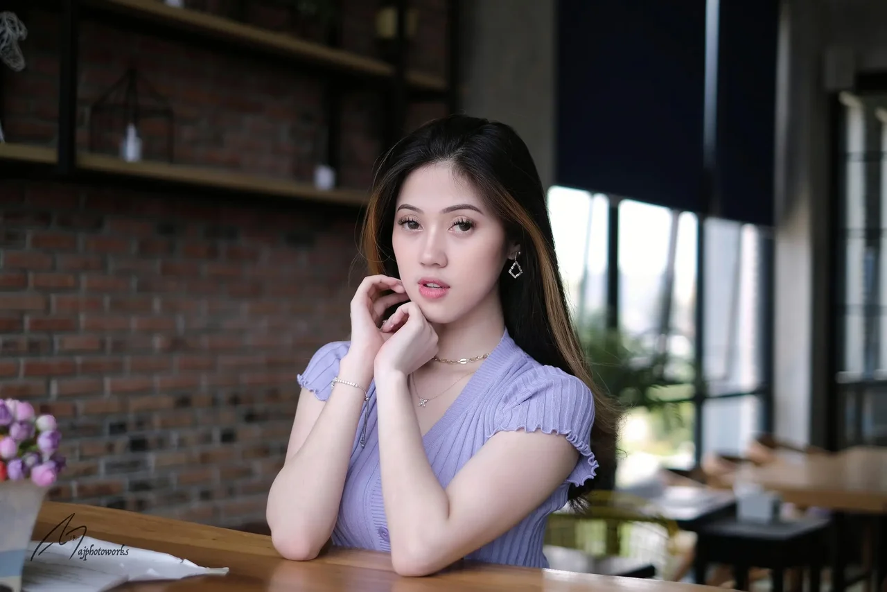 A modern portrait capturing a blend of elegance and casual style in an urban cafe setting.