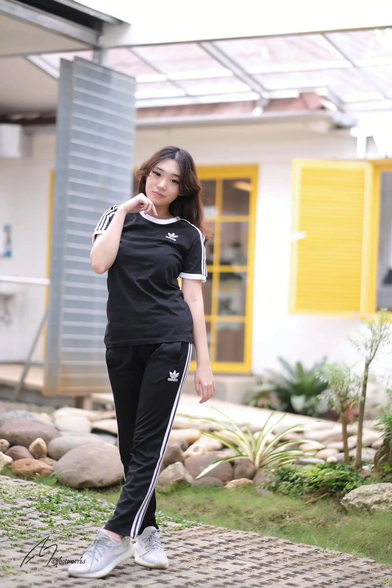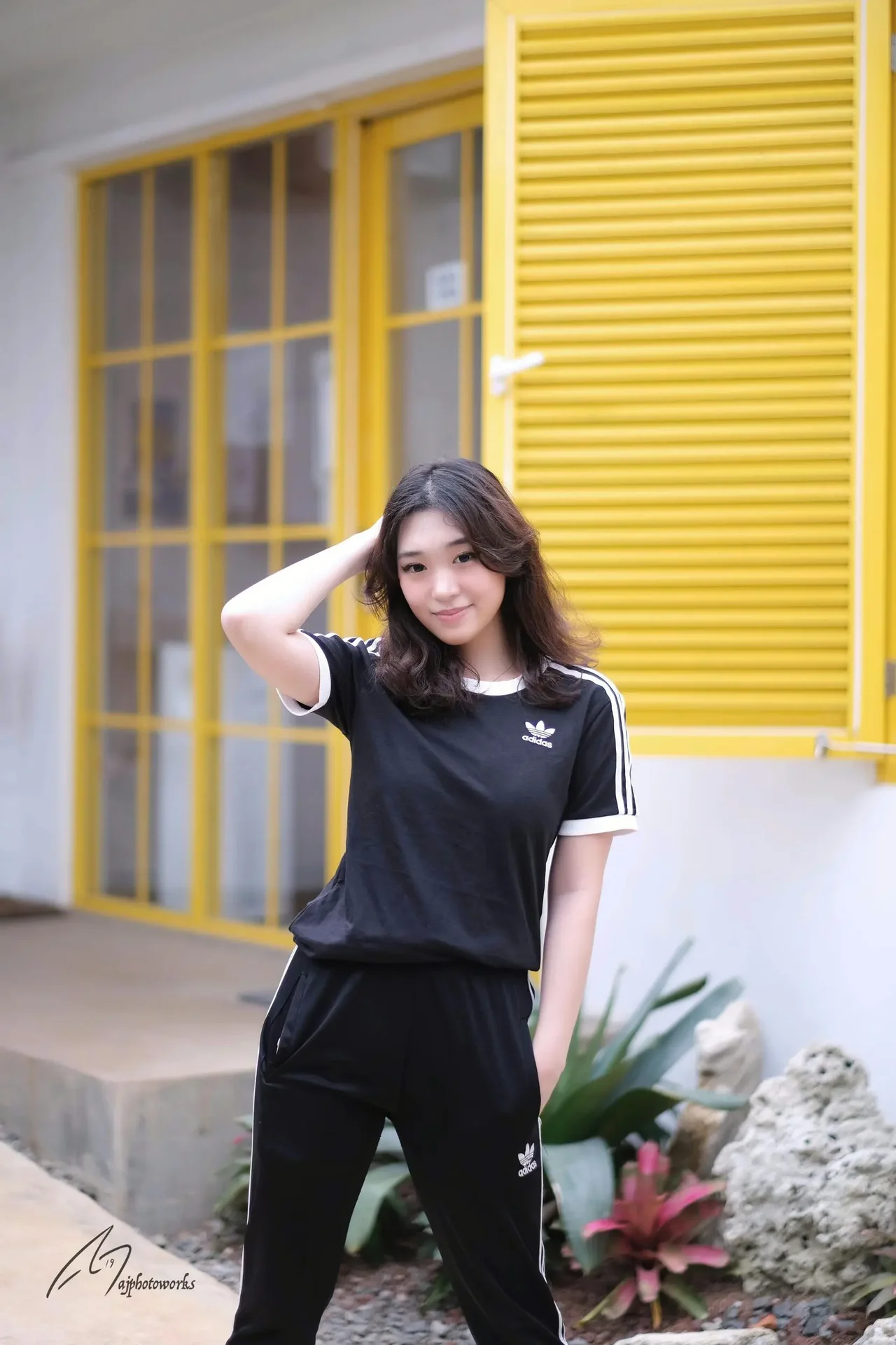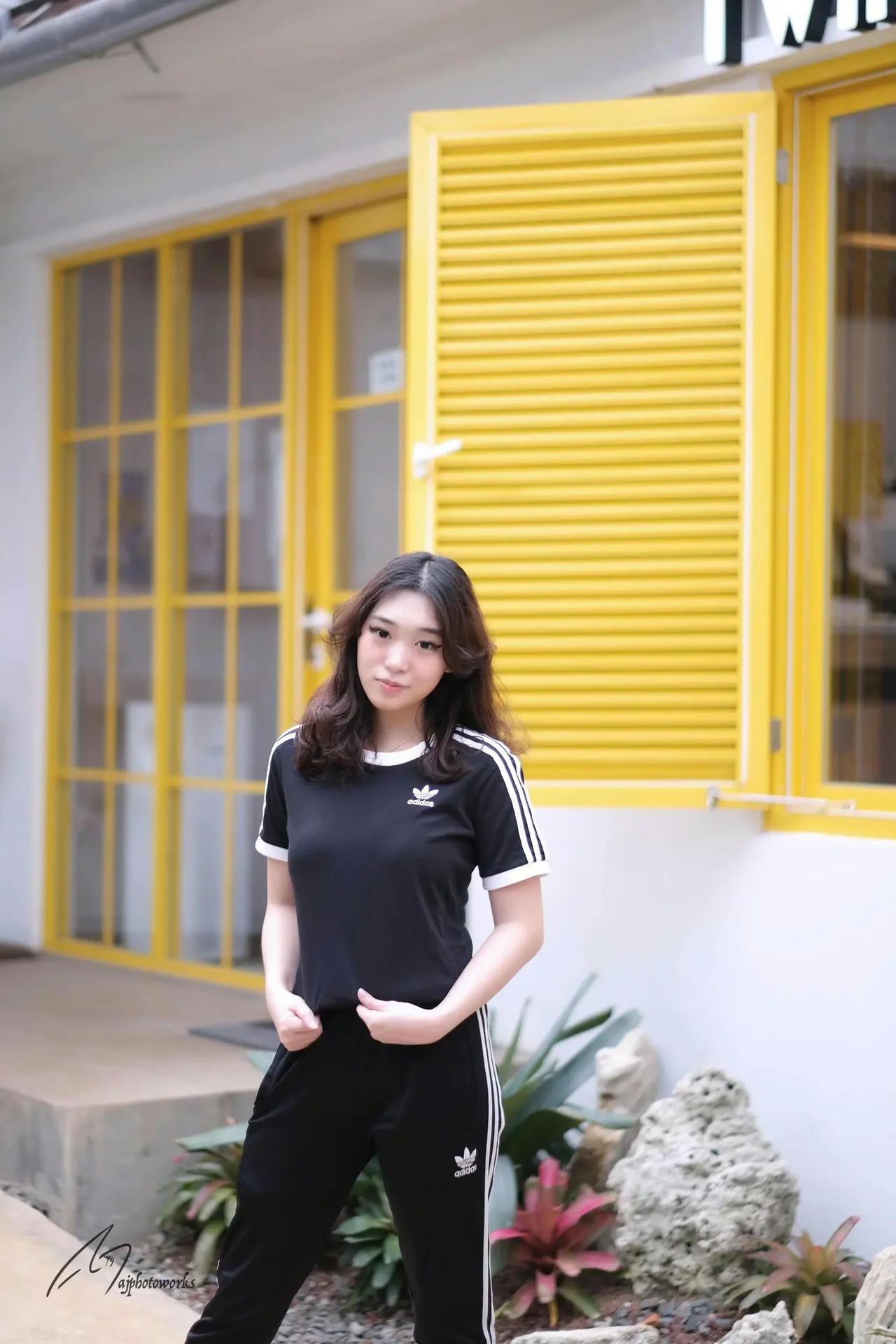 Stylish black and white Adidas track wear against a vibrant yellow architectural backdrop, blending modernity with casual elegance.