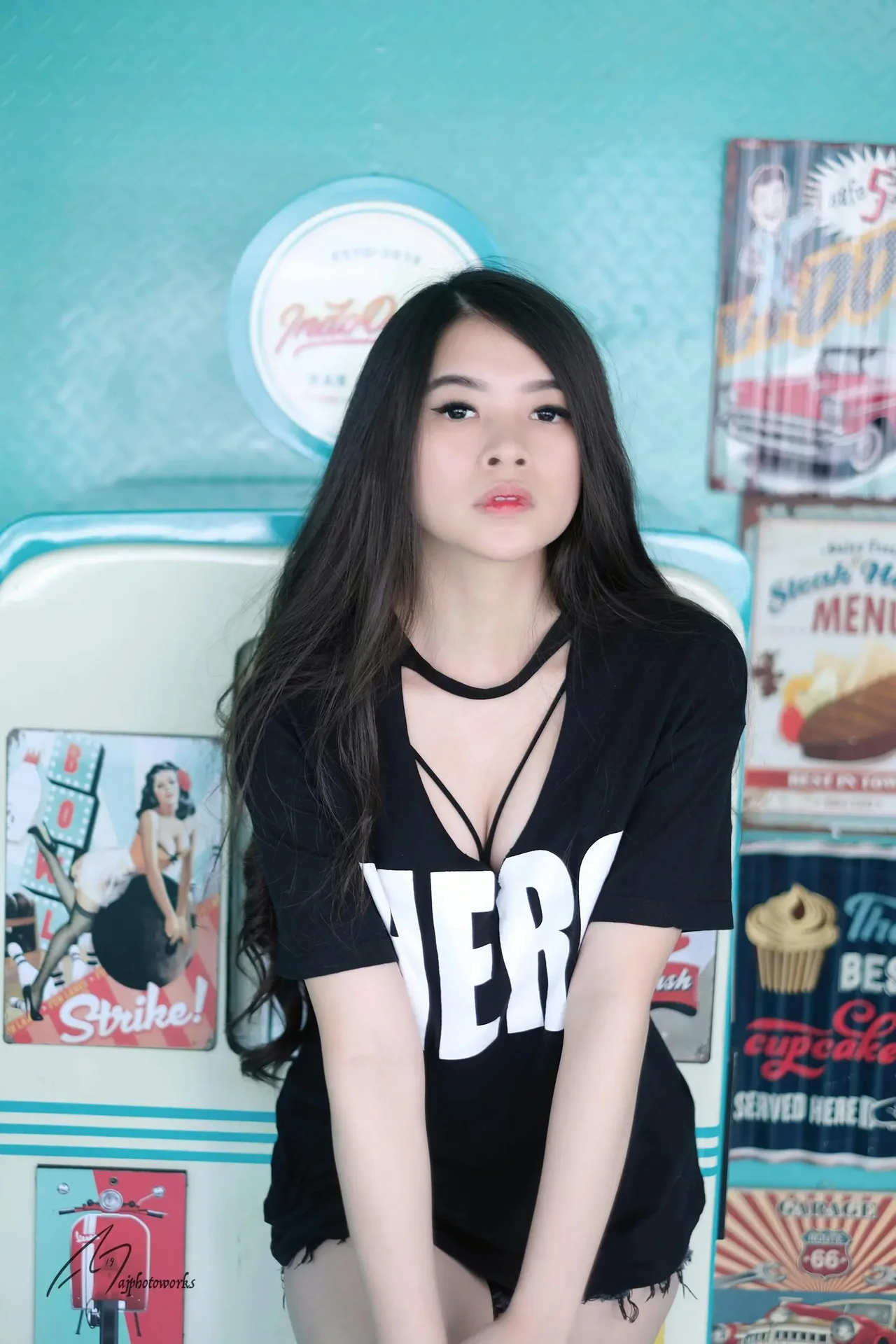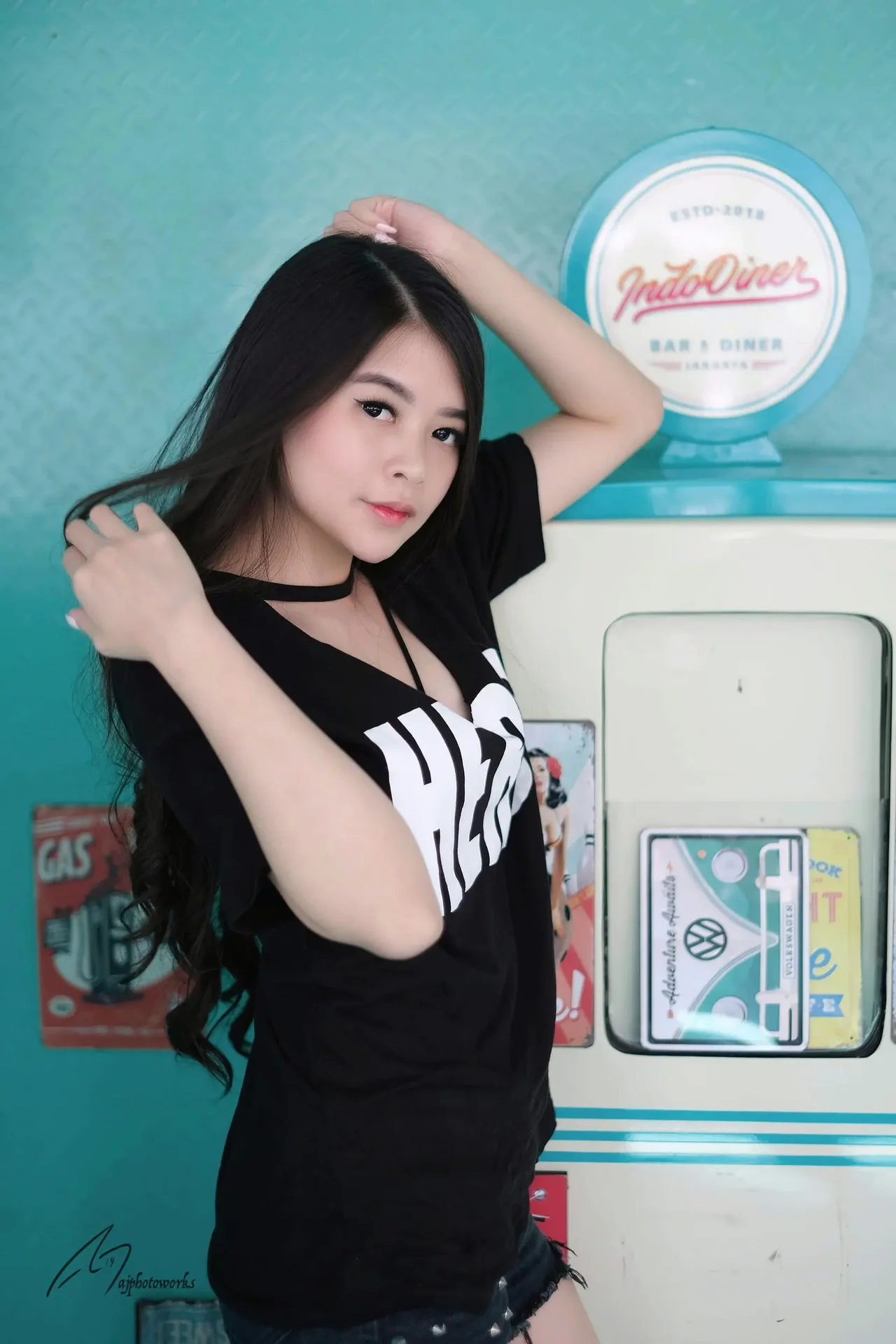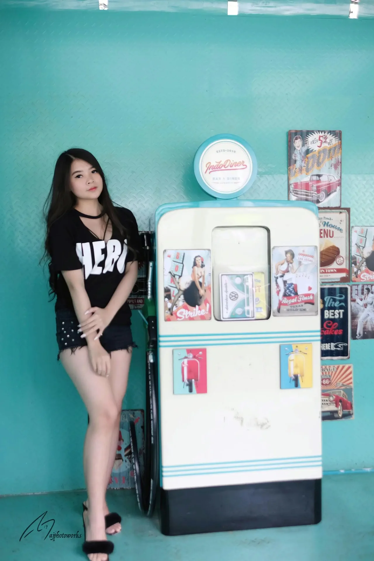 Retro-style indoor shoot with a confident model in a black lace dress and denim shorts, set against vibrant teal walls adorned with vintage diner posters, evoking a nostalgic cinematic mood.