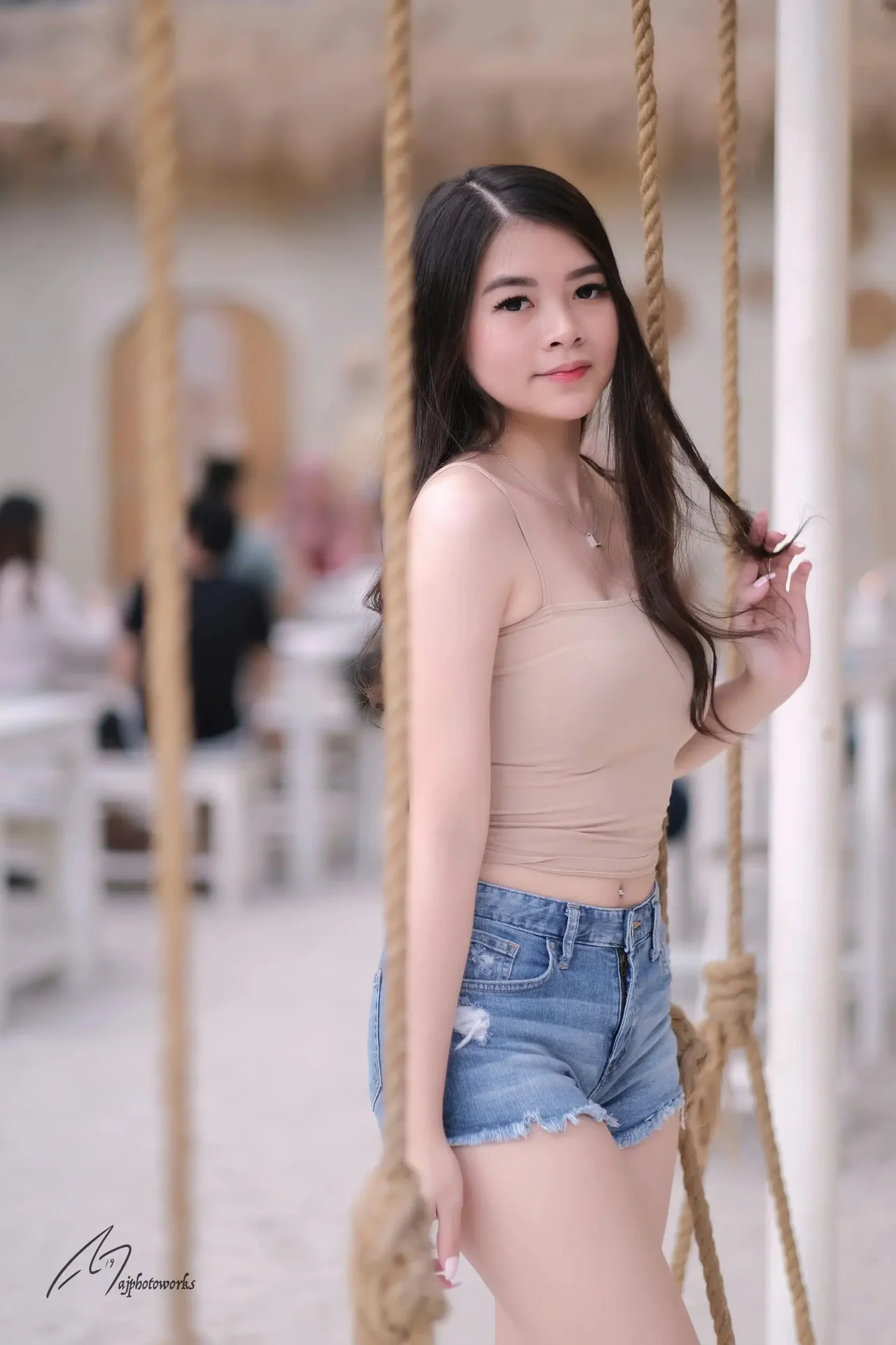 A stunning portrait of a young woman exuding effortless style, blending vibrant settings with chic casualwear. Her confident poses against a poolside backdrop and modern patio area highlight the versatility of her outfits, from playful daywear to edgy night-inspired looks.