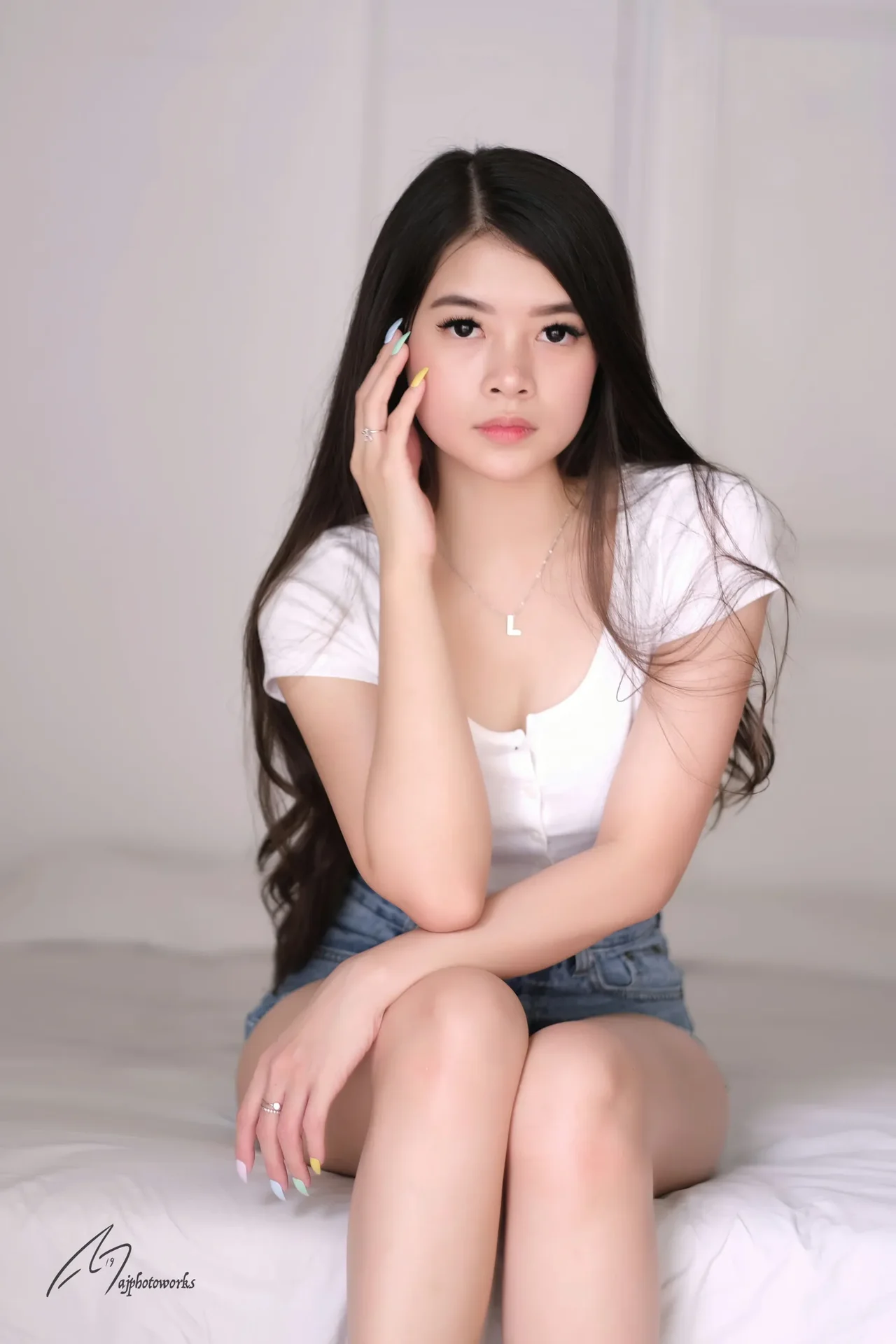 A modern portrait of a young woman in a white crop top and distressed denim shorts with colorful nail polish, showcasing various poses on a white bed in a minimalist studio setting.