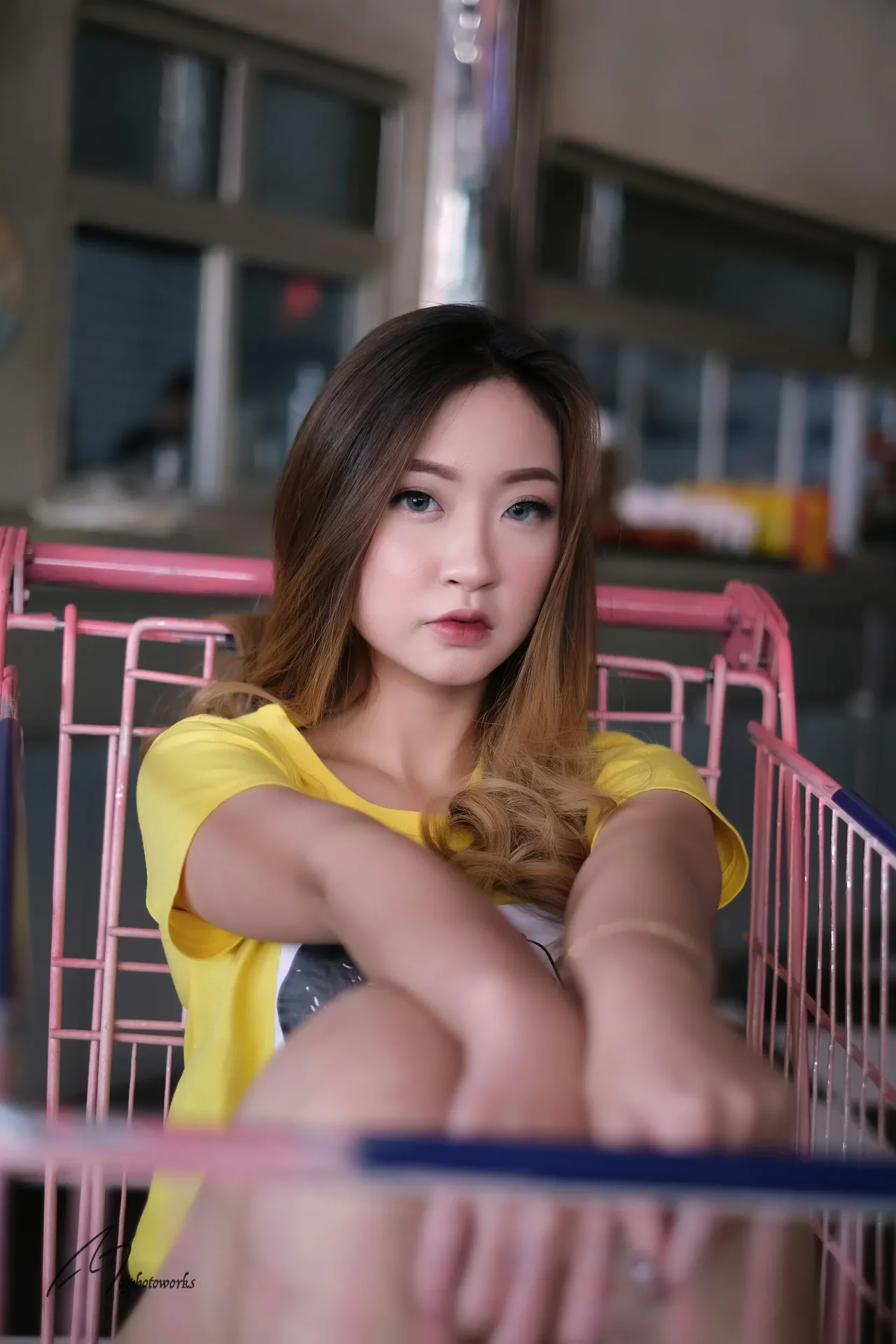 A young woman lounges in a pink shopping cart, wearing a yellow graphic tee, with soft natural lighting and blurred kitchen/café surroundings. Her relaxed pose and warm tones evoke a candid editorial portrait.