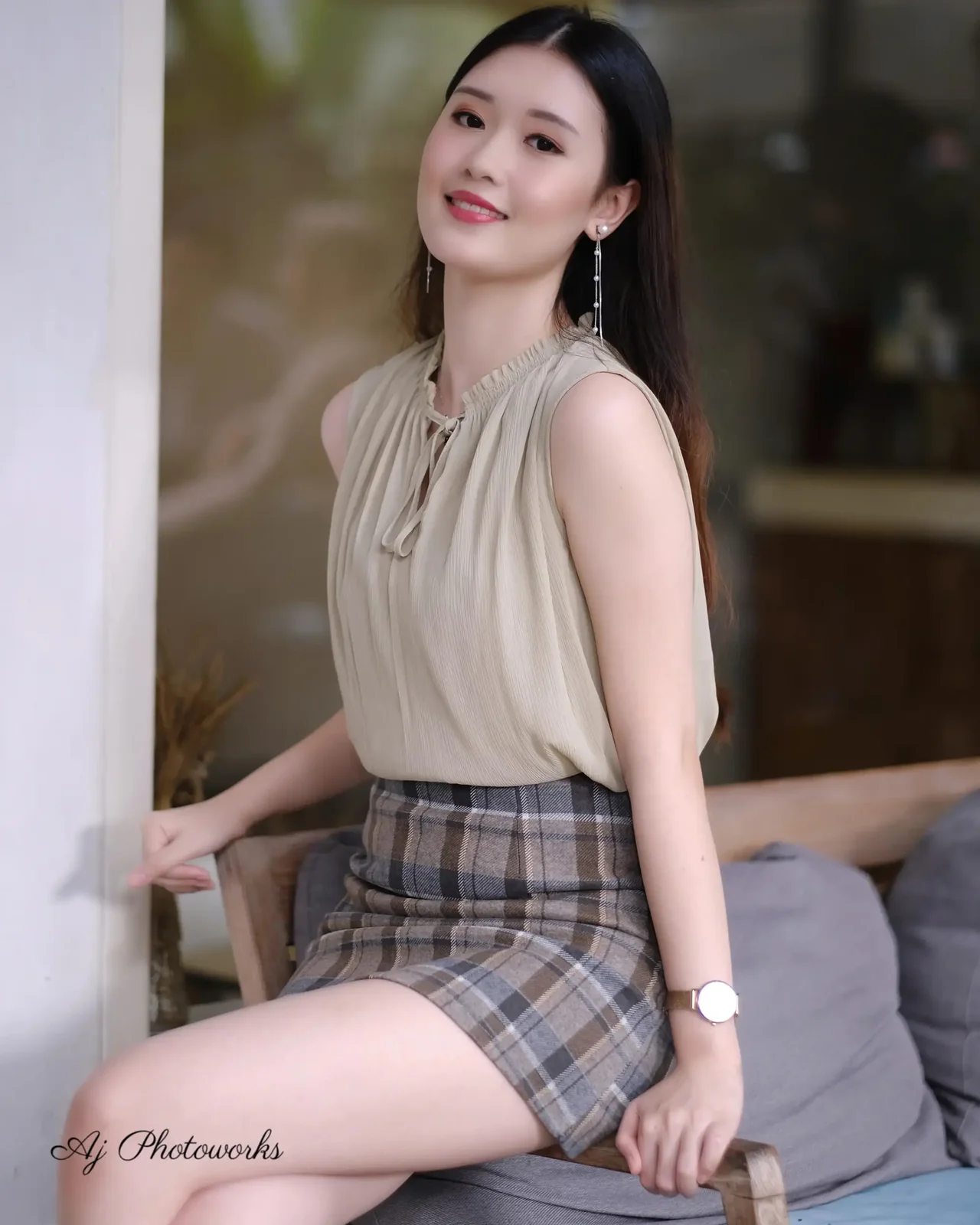 Elegance meets casual charm in a series of dynamic portraits. The woman transitions from seated grace to poised movement, highlighted by natural warmth and textured backdrops.