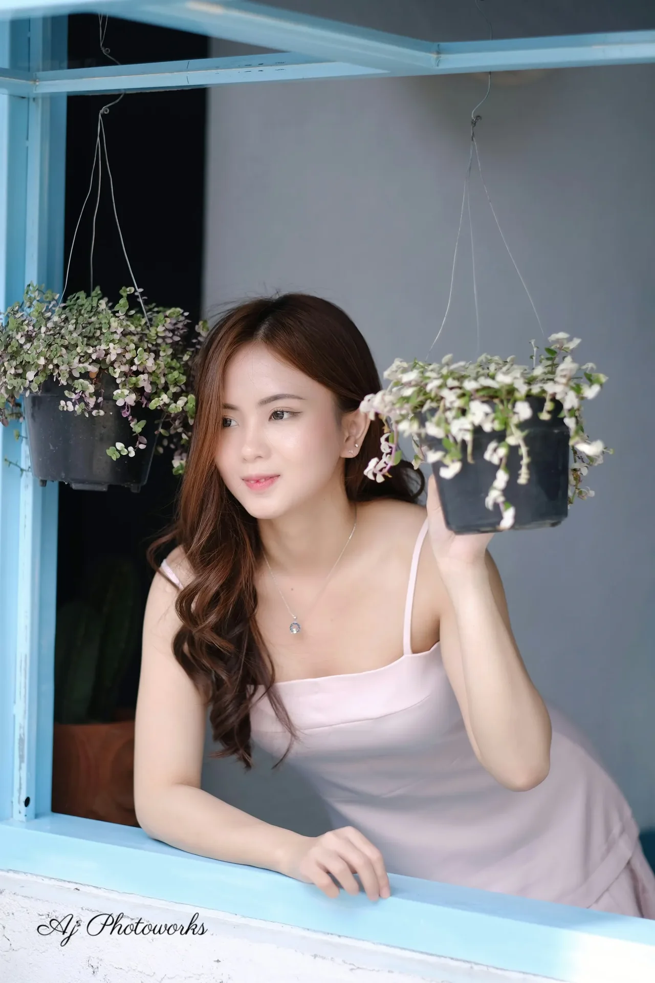 A woman in a light pink dress poses by a blue-framed window with hanging plants, exuding a serene and fresh atmosphere.