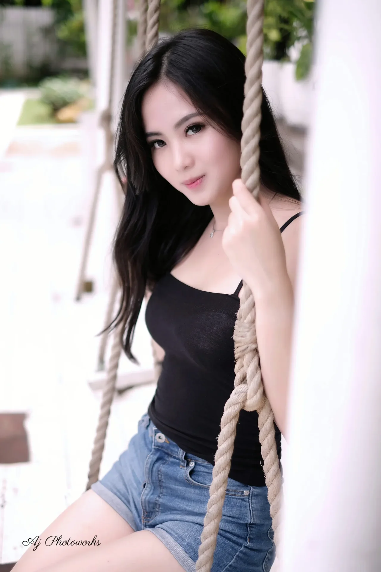 A moment of whimsy captured on a sunlit swing, blending casual style and serene surroundings.