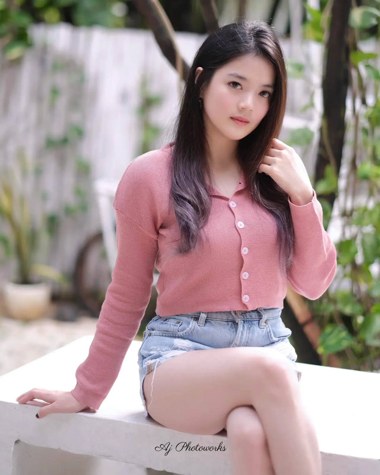 A young woman in a blush pink knit top and white denim shorts sits relaxed on a white cubic block, surrounded by lush greenery and gentle lighting, capturing a serene outdoor café ambiance.