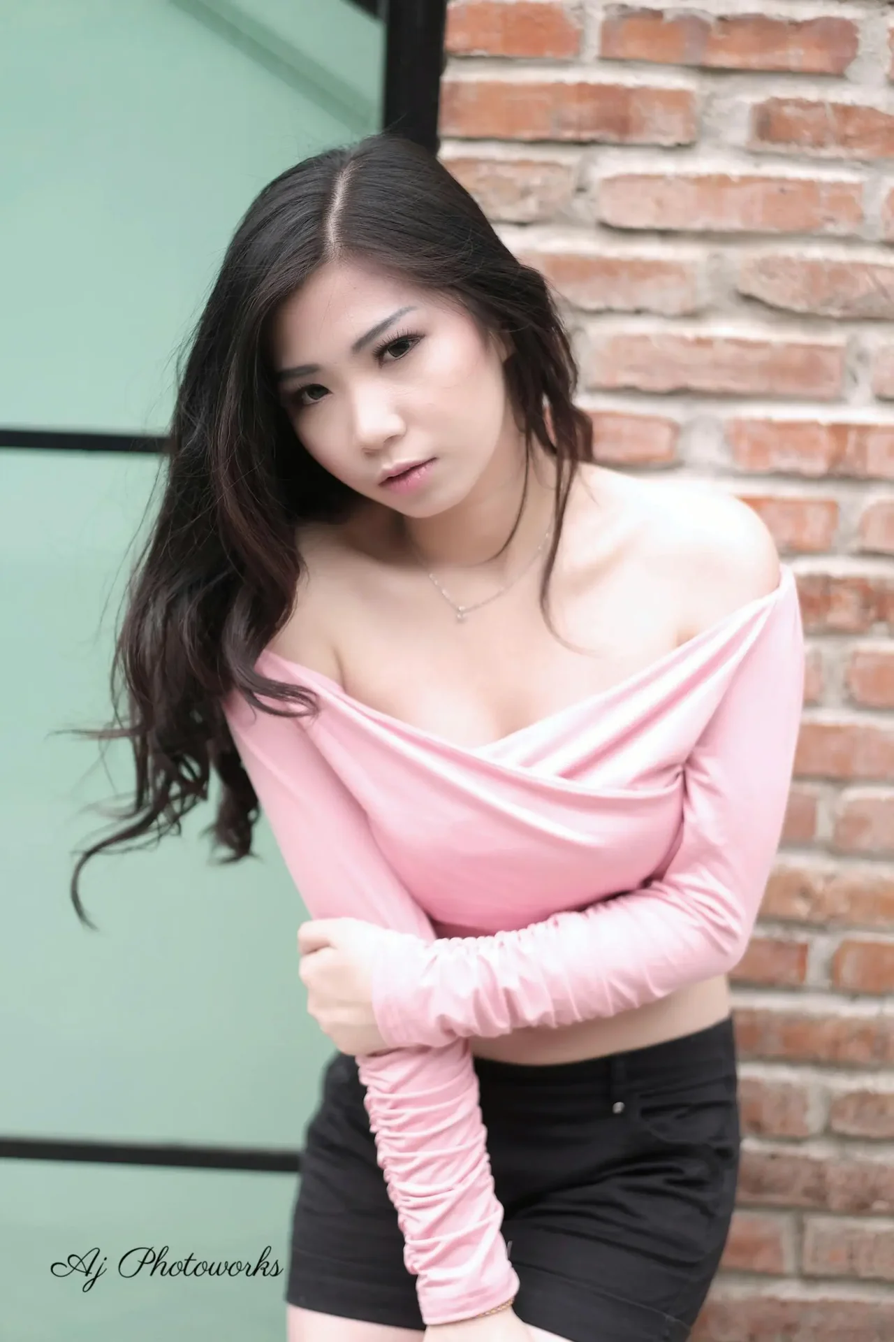 The captured portrait exudes a cinematic allure, with the model's off-shoulder pink top and black shorts blending fashion and elegance in an urban backdrop.