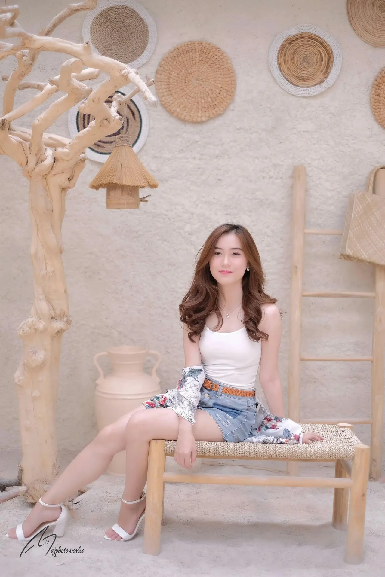 A bohemian-inspired fashion portrait set in a rustic outdoor studio with warm tones and natural textures.