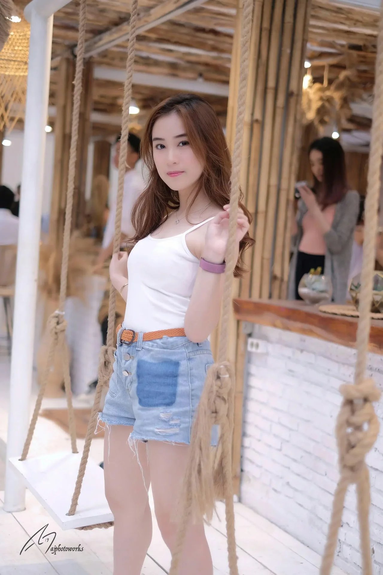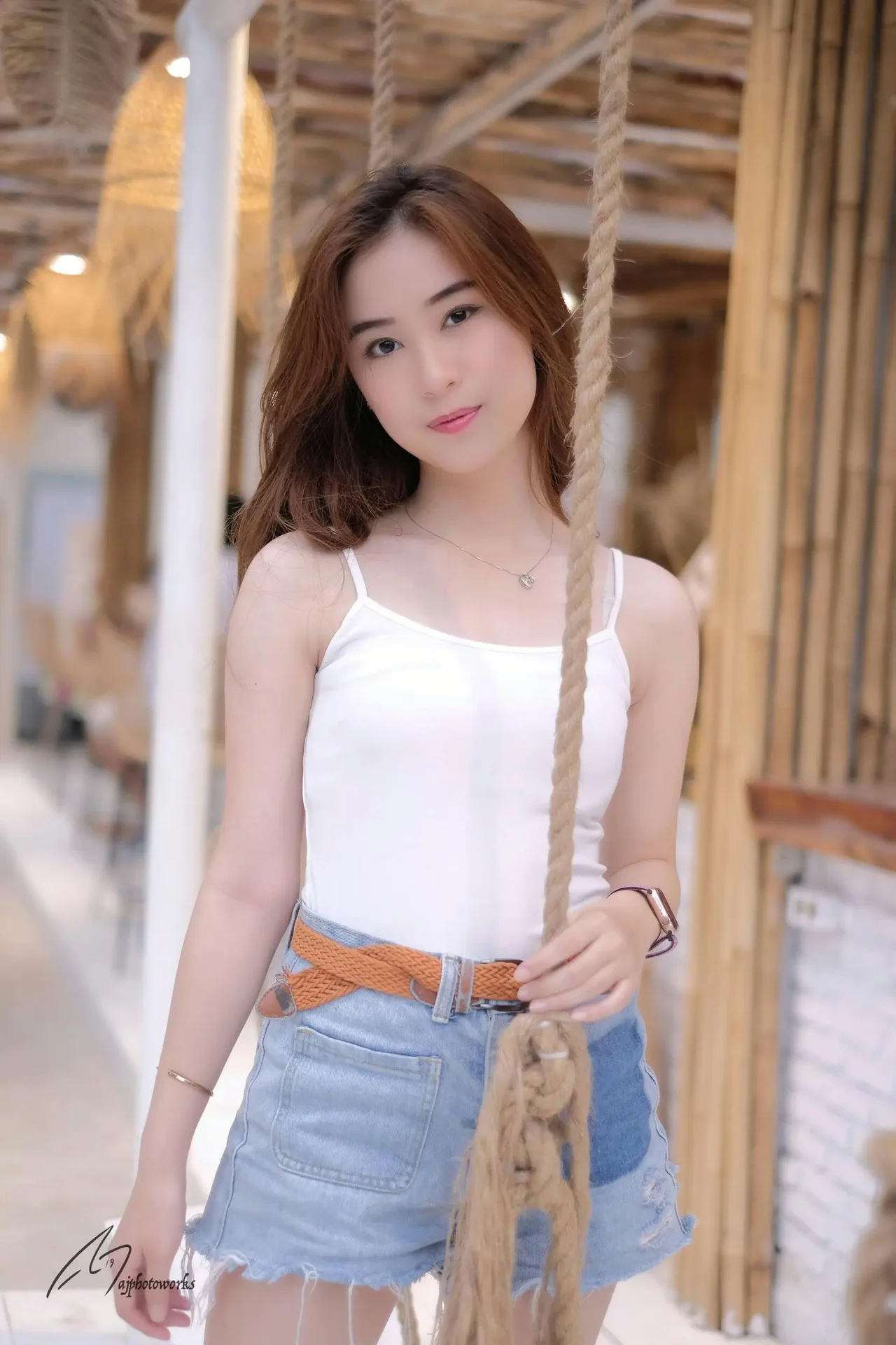 A woman in a white tank top and distressed denim shorts sits on a rope swing with bamboo decor and lanterns in the background.