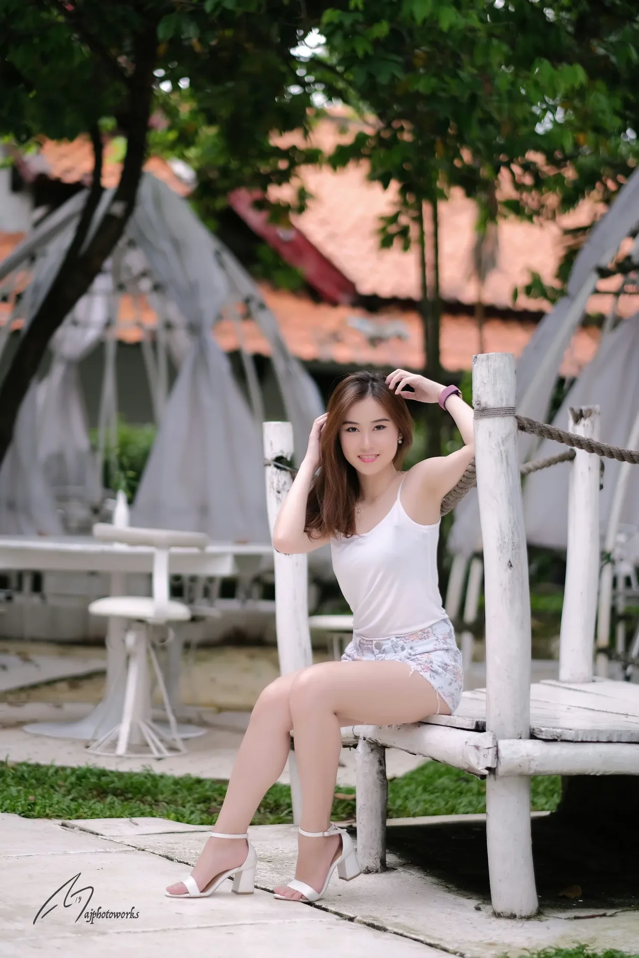 Soft natural light highlights a woman's effortless style in a garden setting, blending portrait elegance with candid charm.
