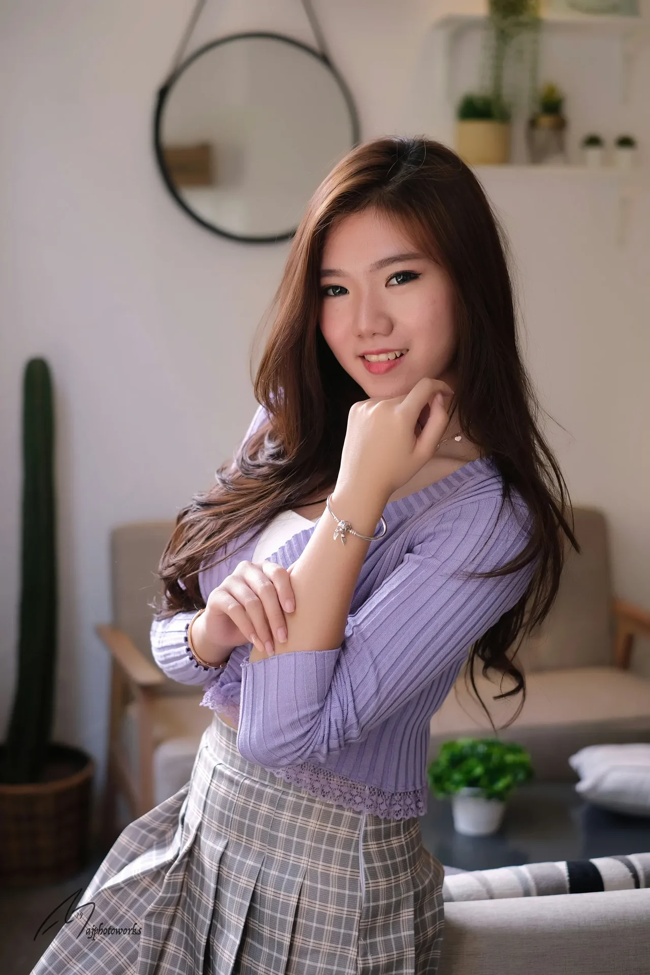 A stylish indoor fashion portrait featuring a model in a lavender lace-blend crop top and plaid skirt, posing gracefully in a modern living room with soft natural light highlighting the cozy ambiance.