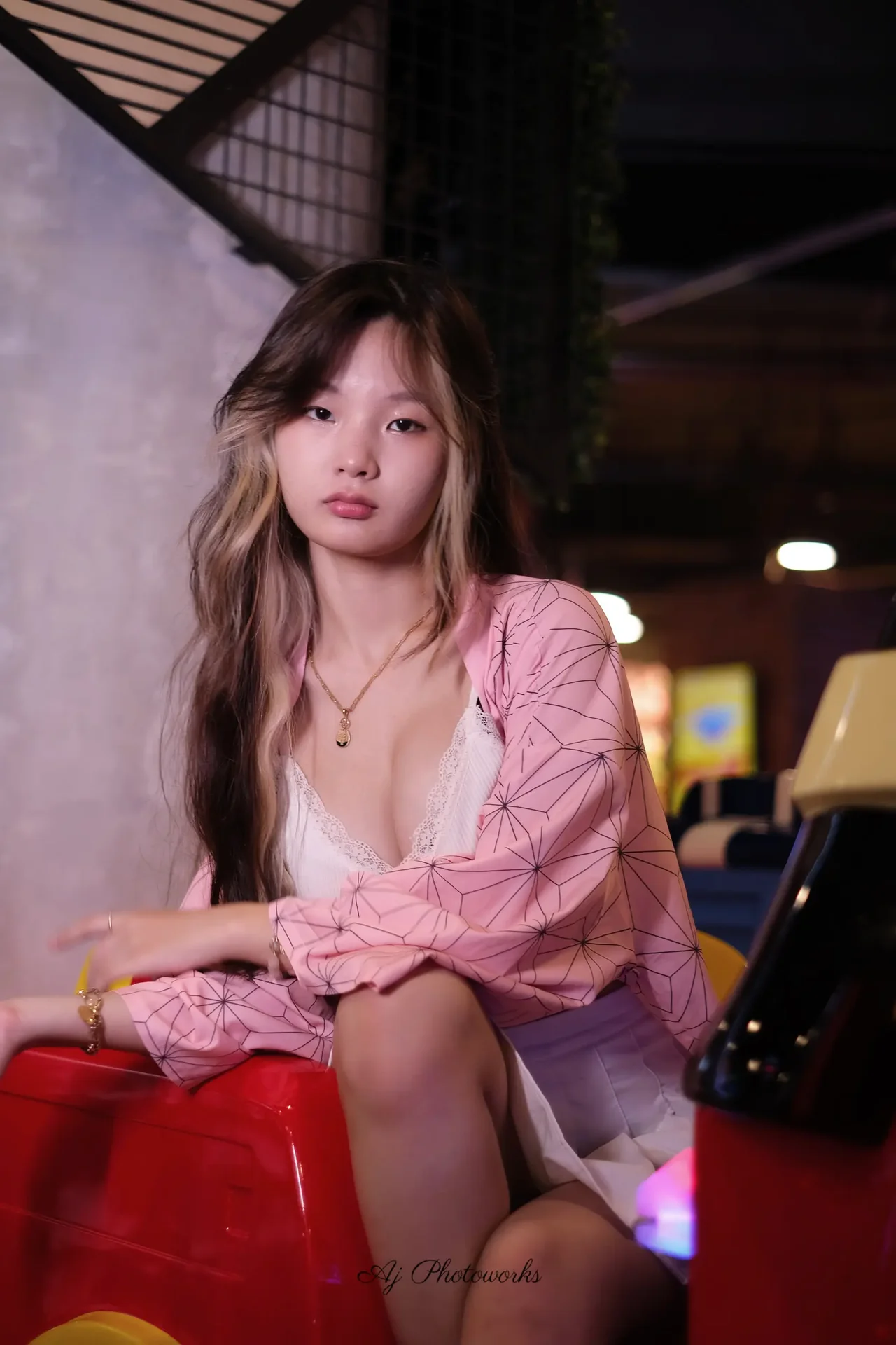 A woman in a bright pink geometric pattern kimono over a white lace top sits confidently in a neon-lit indoor arcade, blending playful cosplay and modern fashion.
