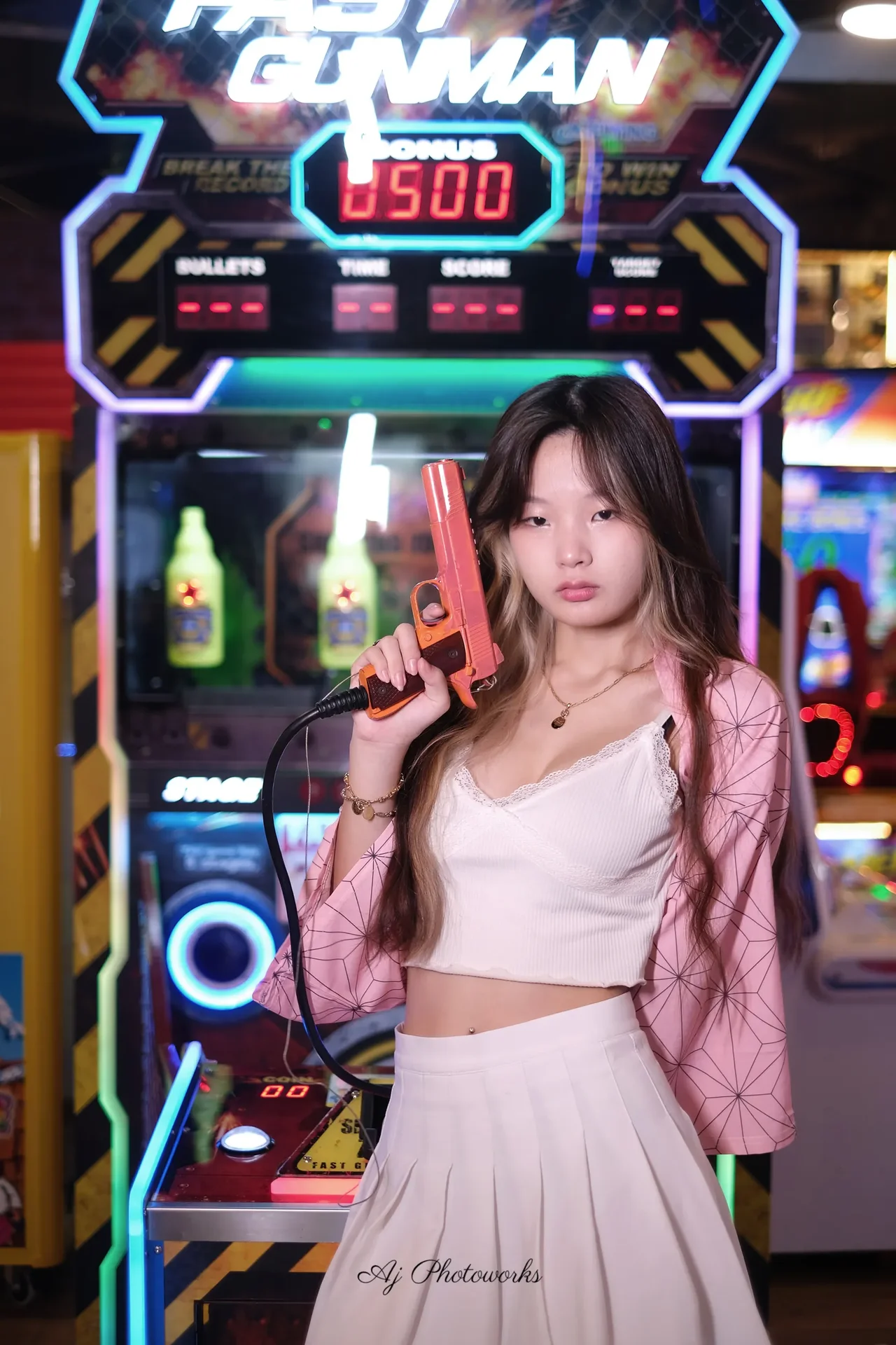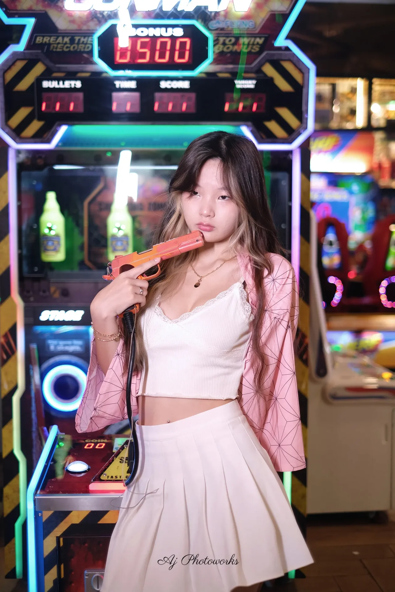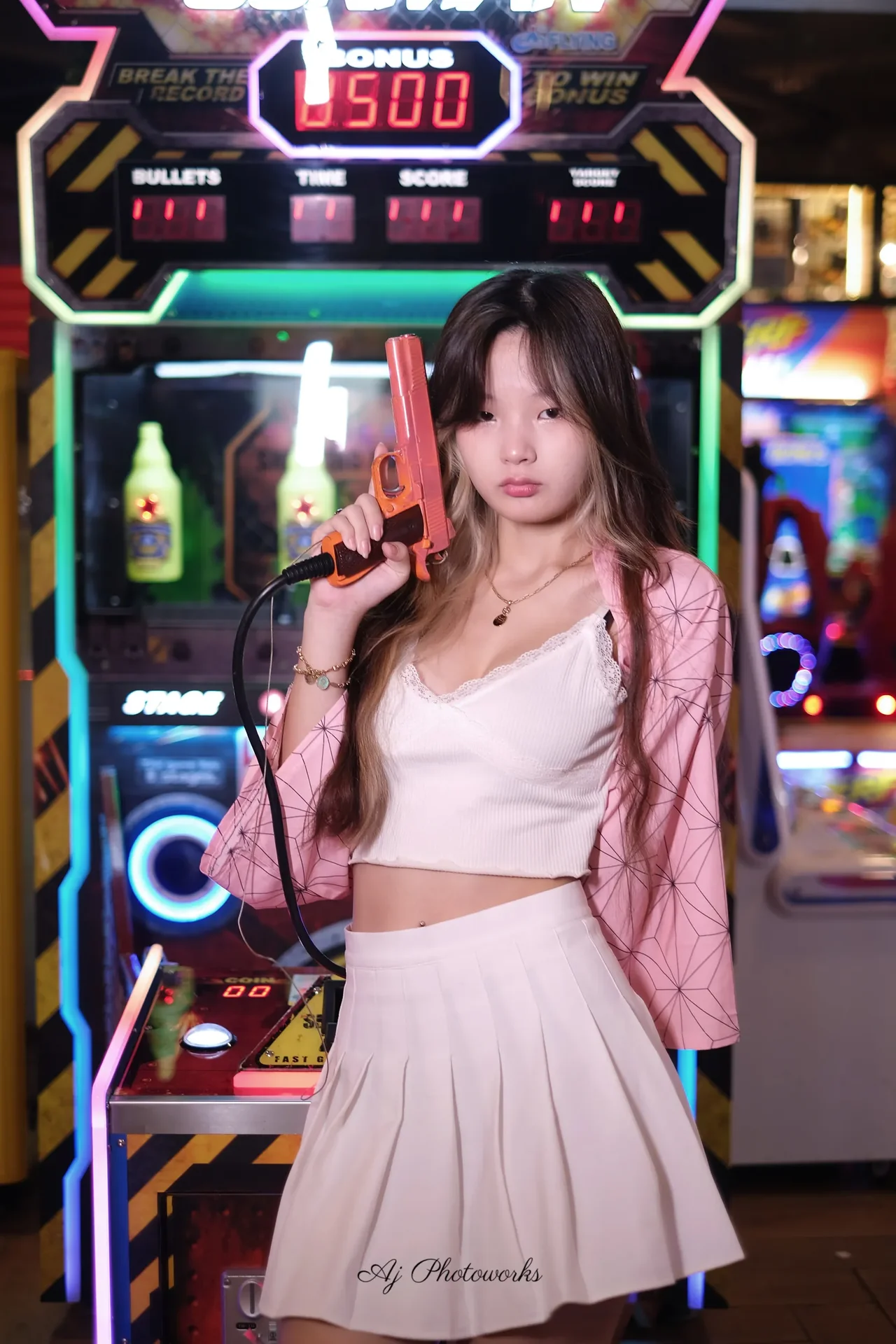 A blend of playful elegance and retro arcade energy with vibrant neon backdrops.