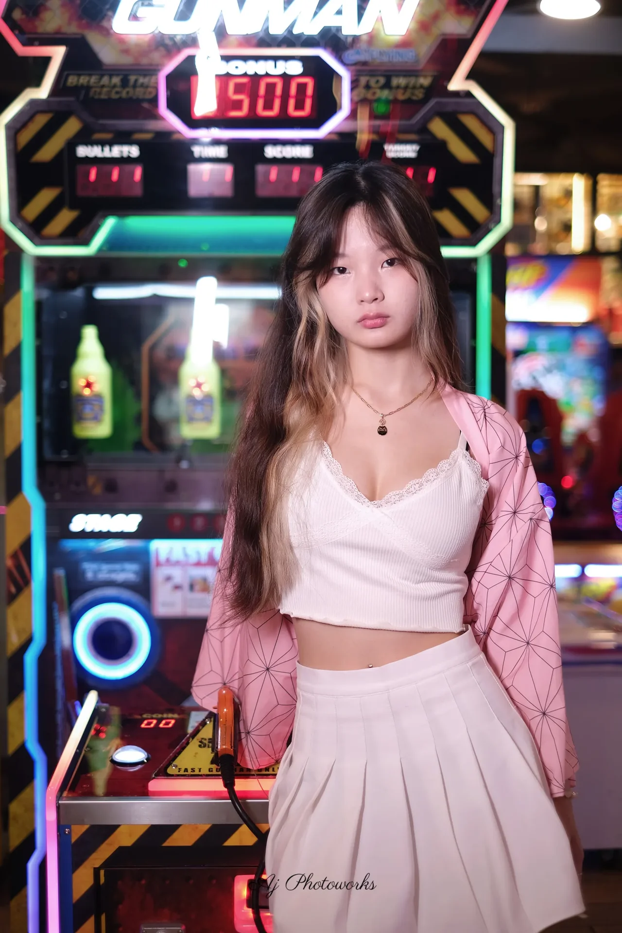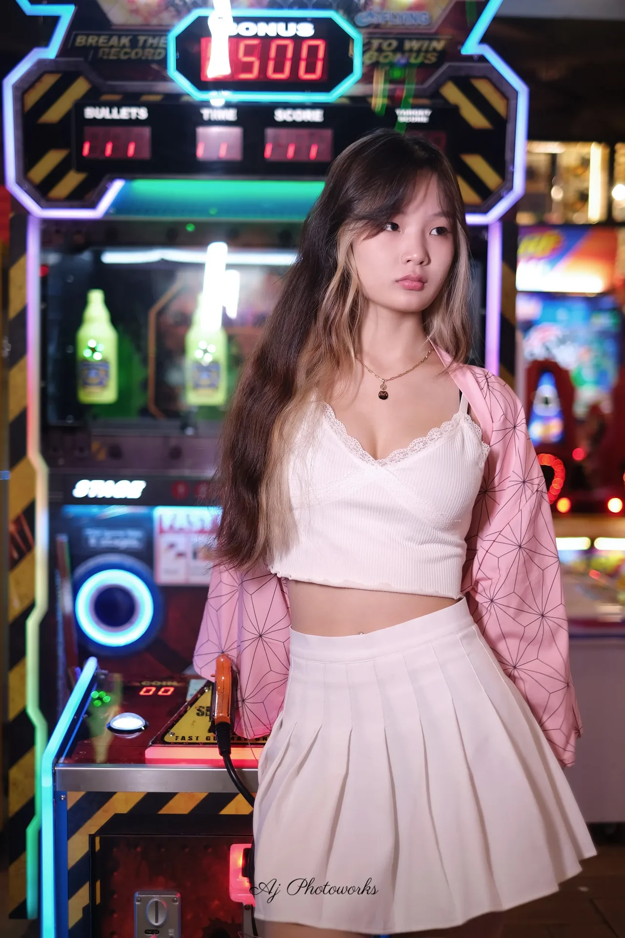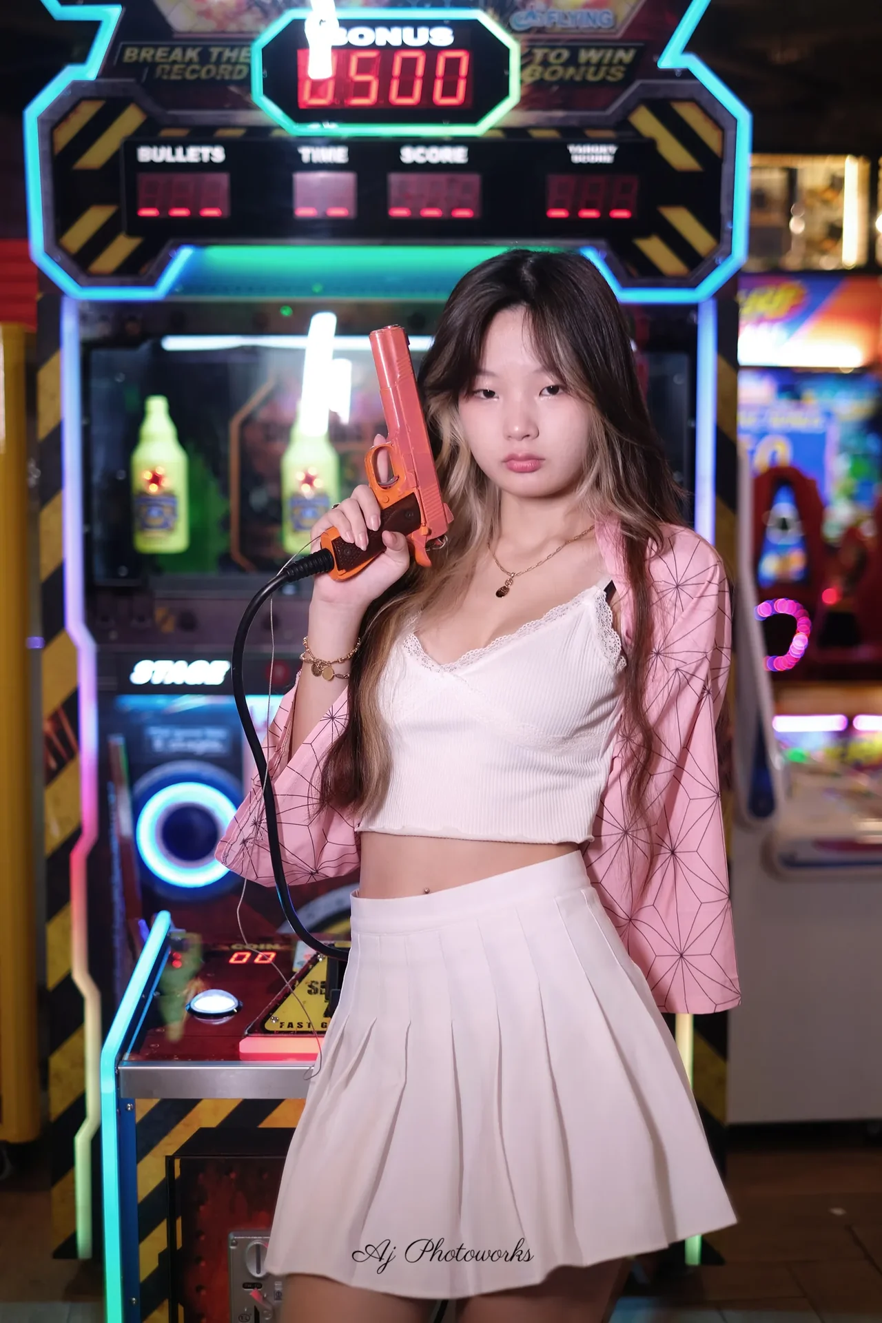 A blend of playful elegance and retro arcade energy with vibrant neon backdrops.