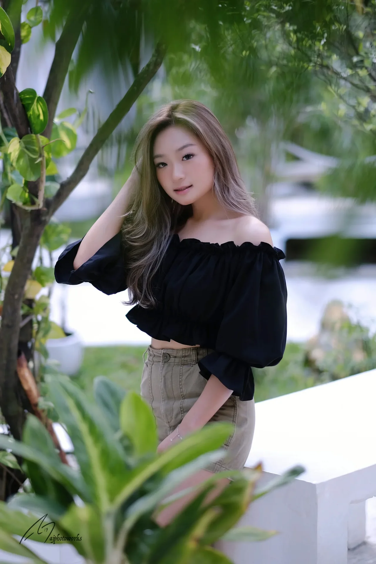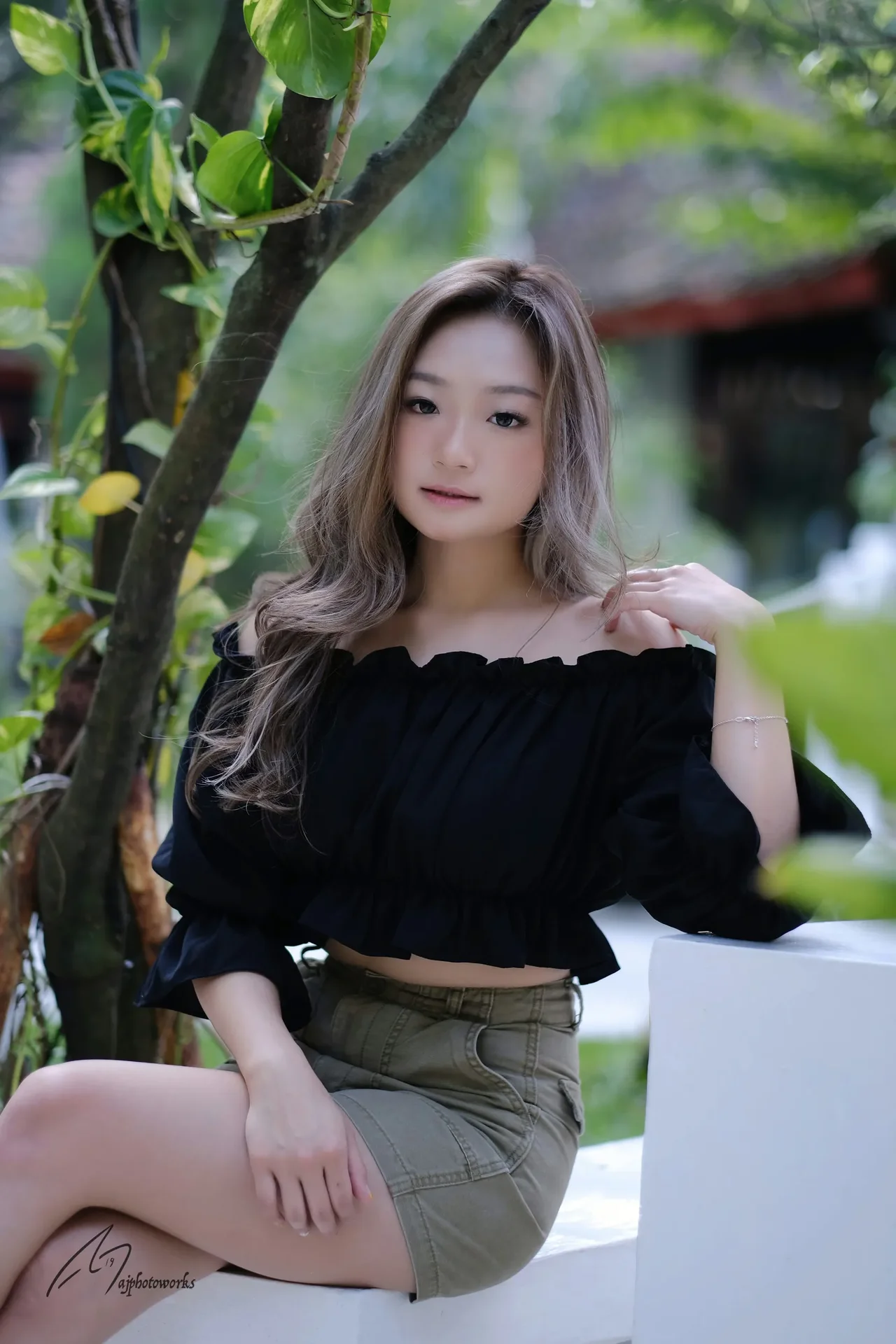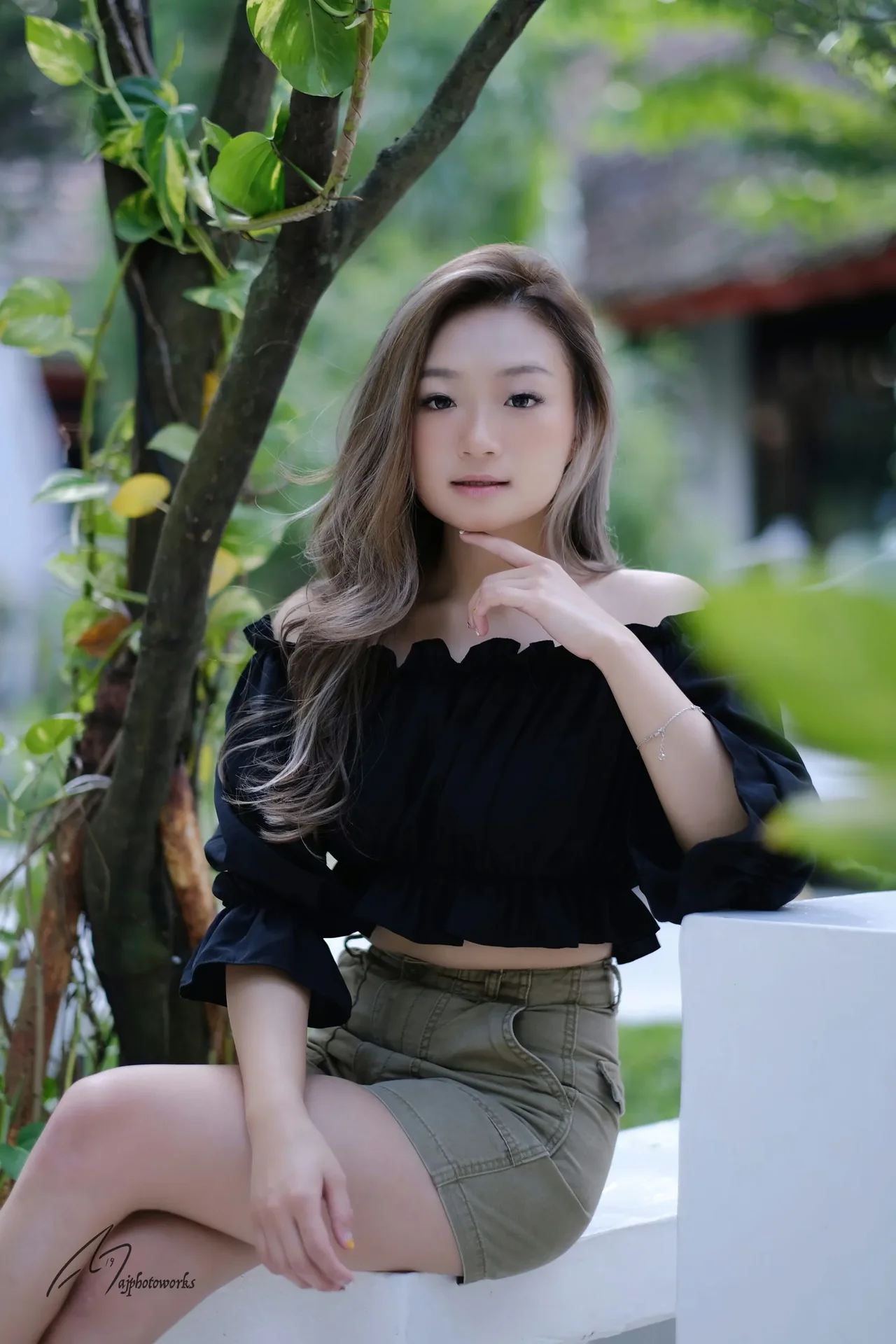 Elegant portrait in a lush tropical setting, blending casual chic with serene warmth.