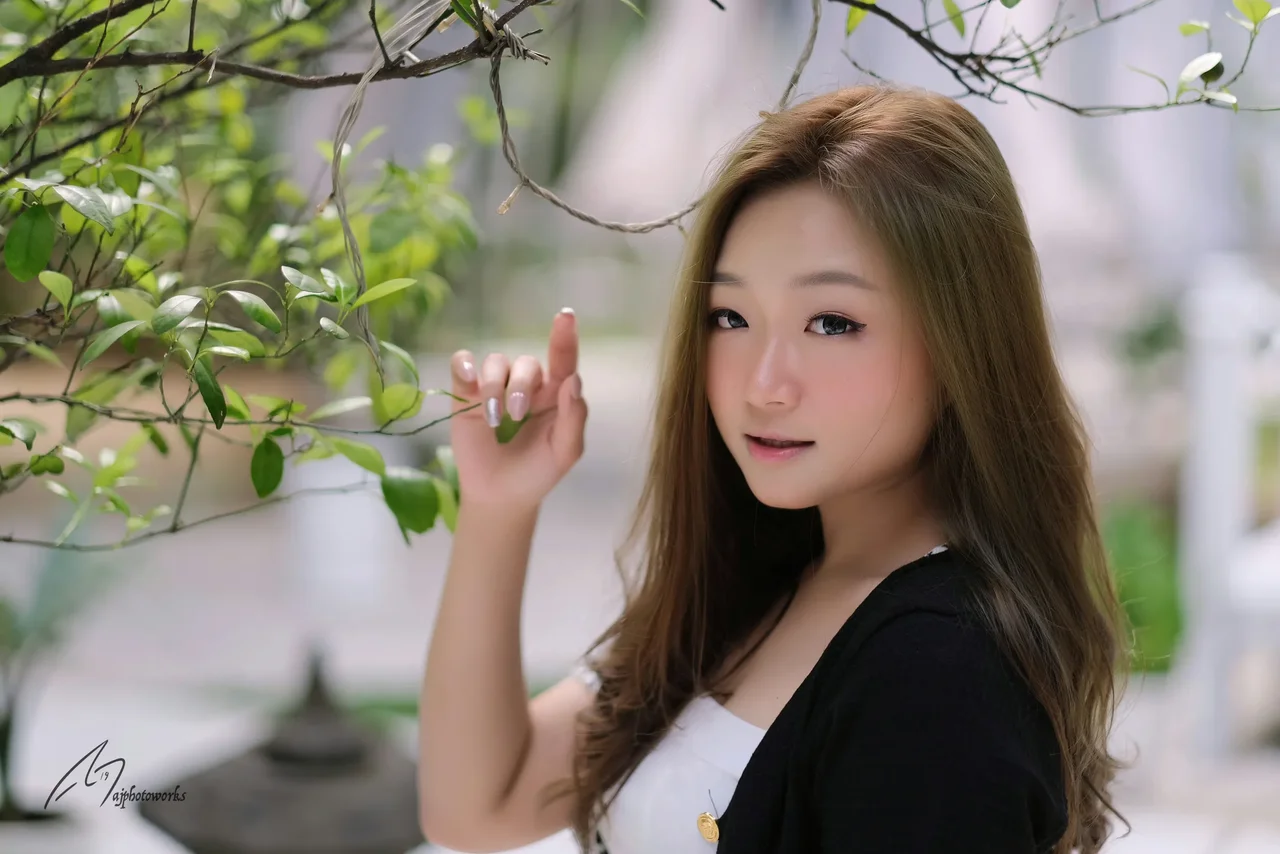 A serene portrait of a woman in a black and white ensemble, framed by lush greenery and soft natural light, evoking tranquility and elegance in an editorial style.
