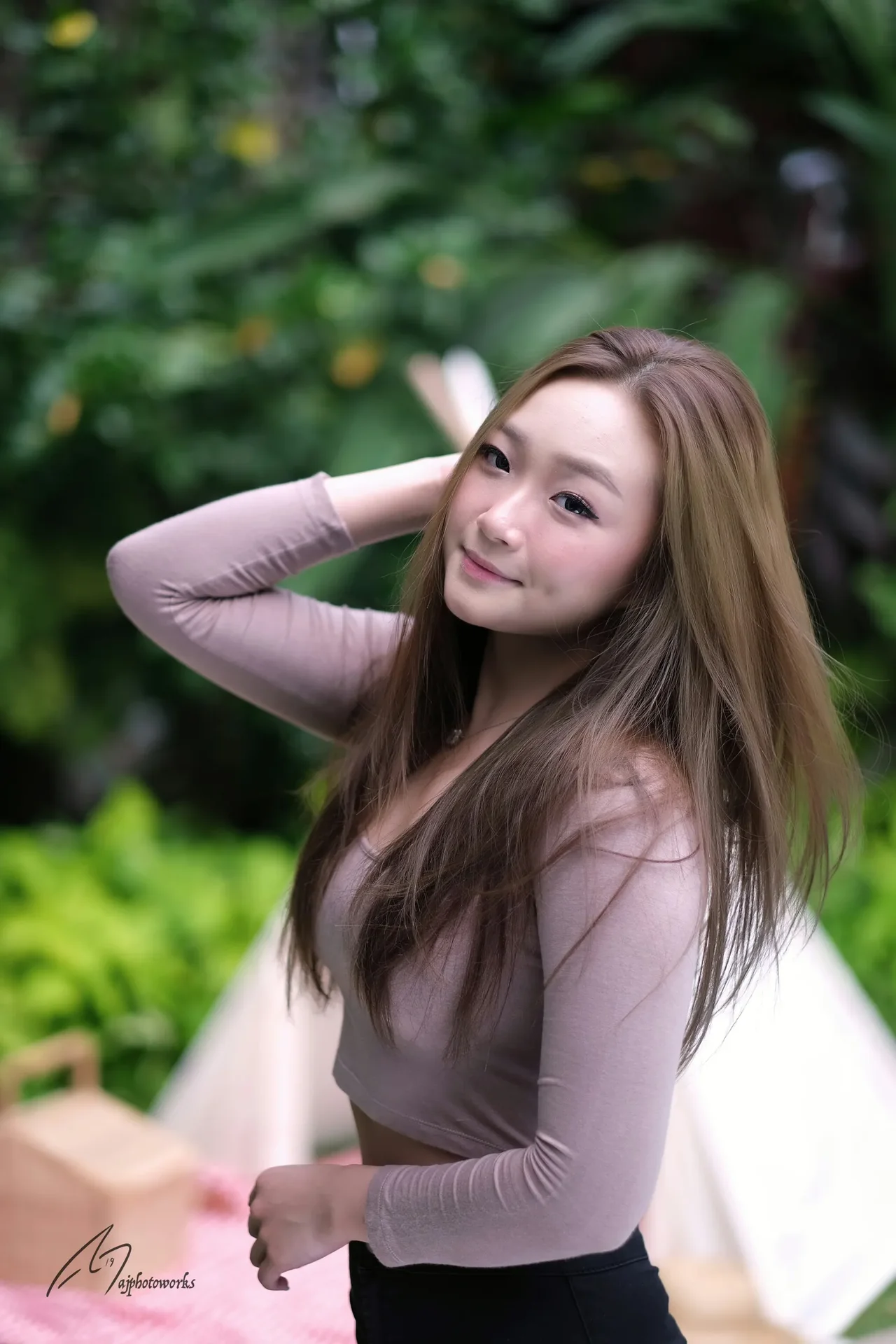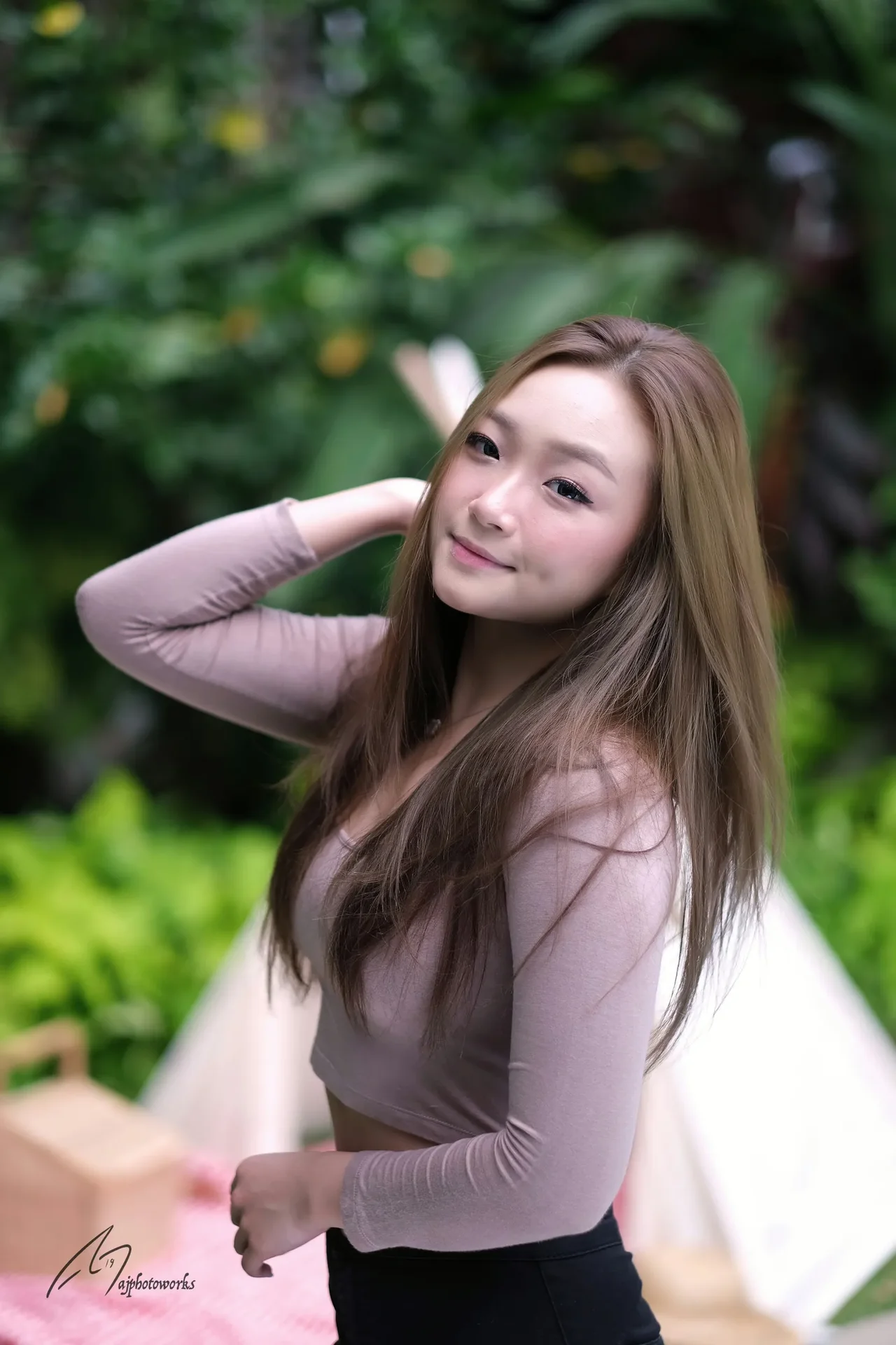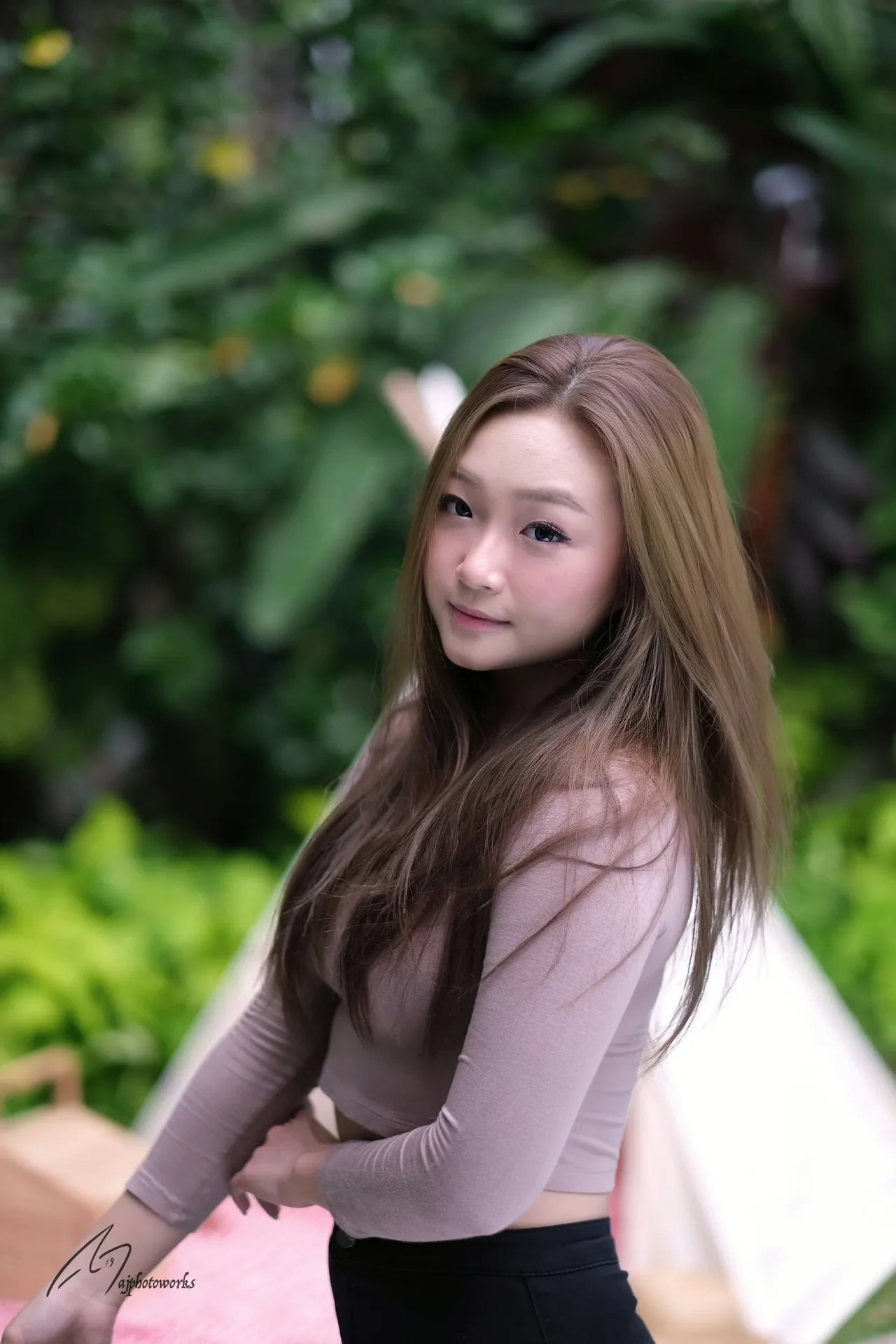 A serene tropical portrait showcasing natural elegance in neutral tones and lush greenery.