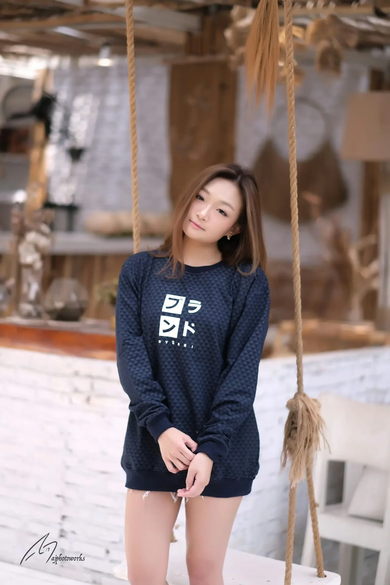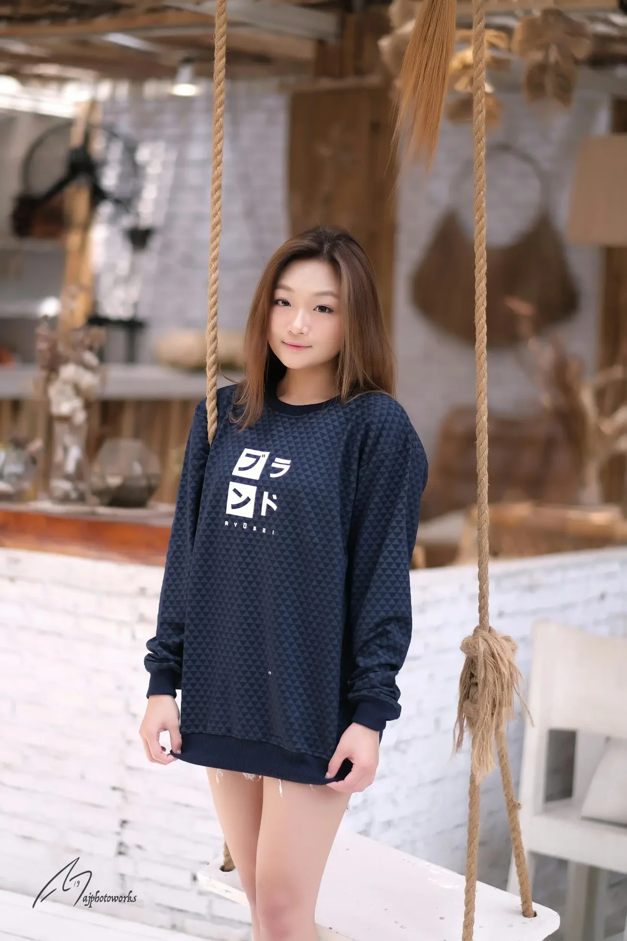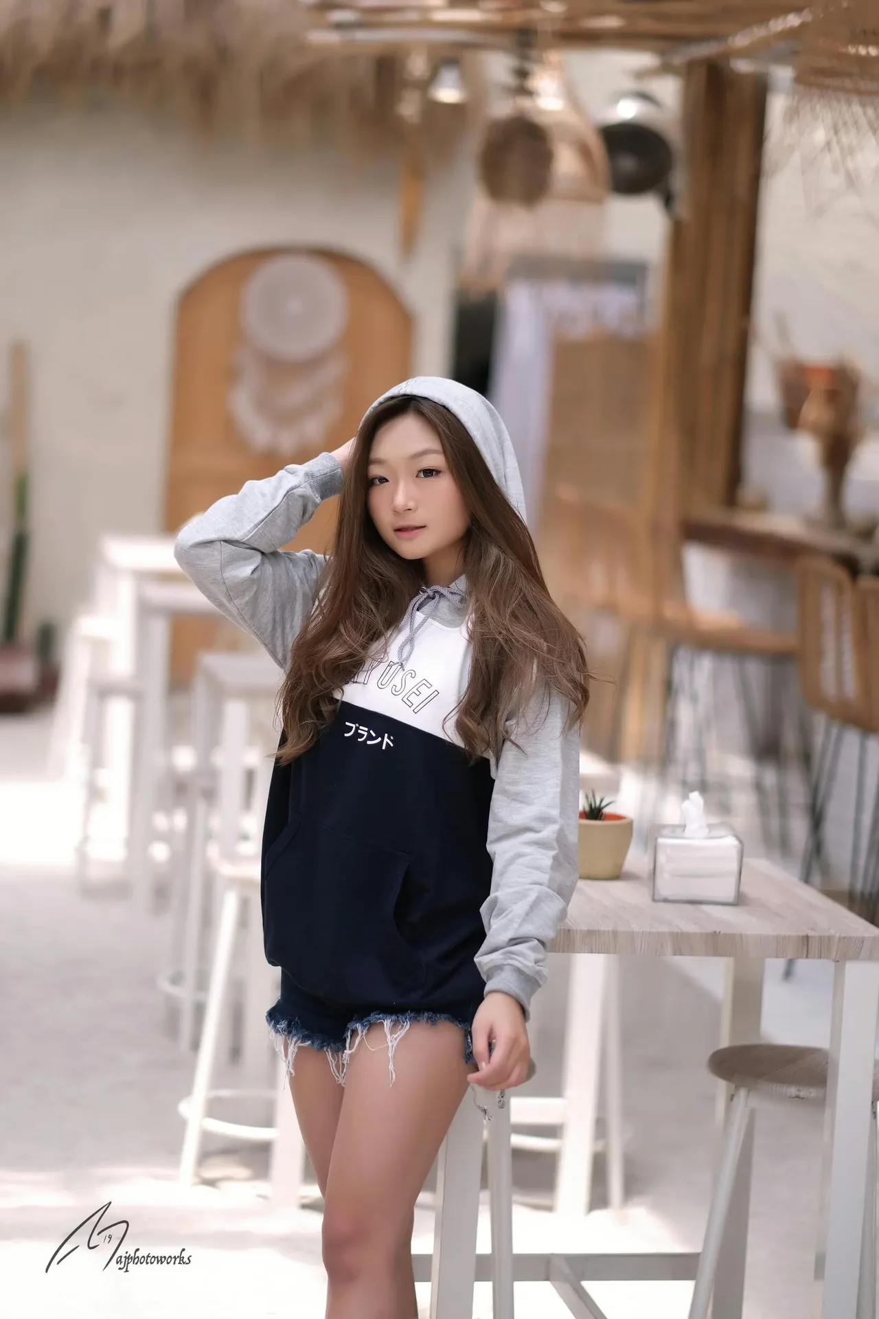 Casual yet stylish, the frayed denim skirt and text-adorned hoodies blend seamlessly with the modern, airy backdrop of a trendy cafe-studio hybrid.