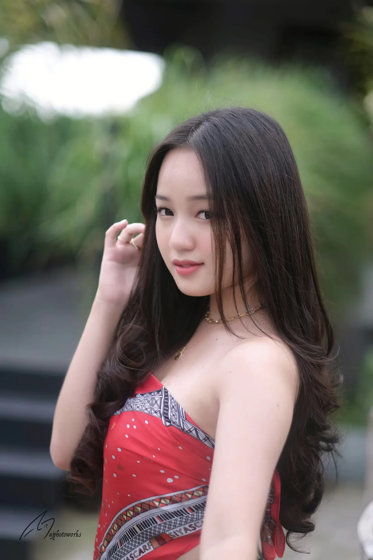 A modern fashion portrait of a woman in a red scarf and black leather skirt, posed outdoors amidst lush greenery and textured wooden structures.