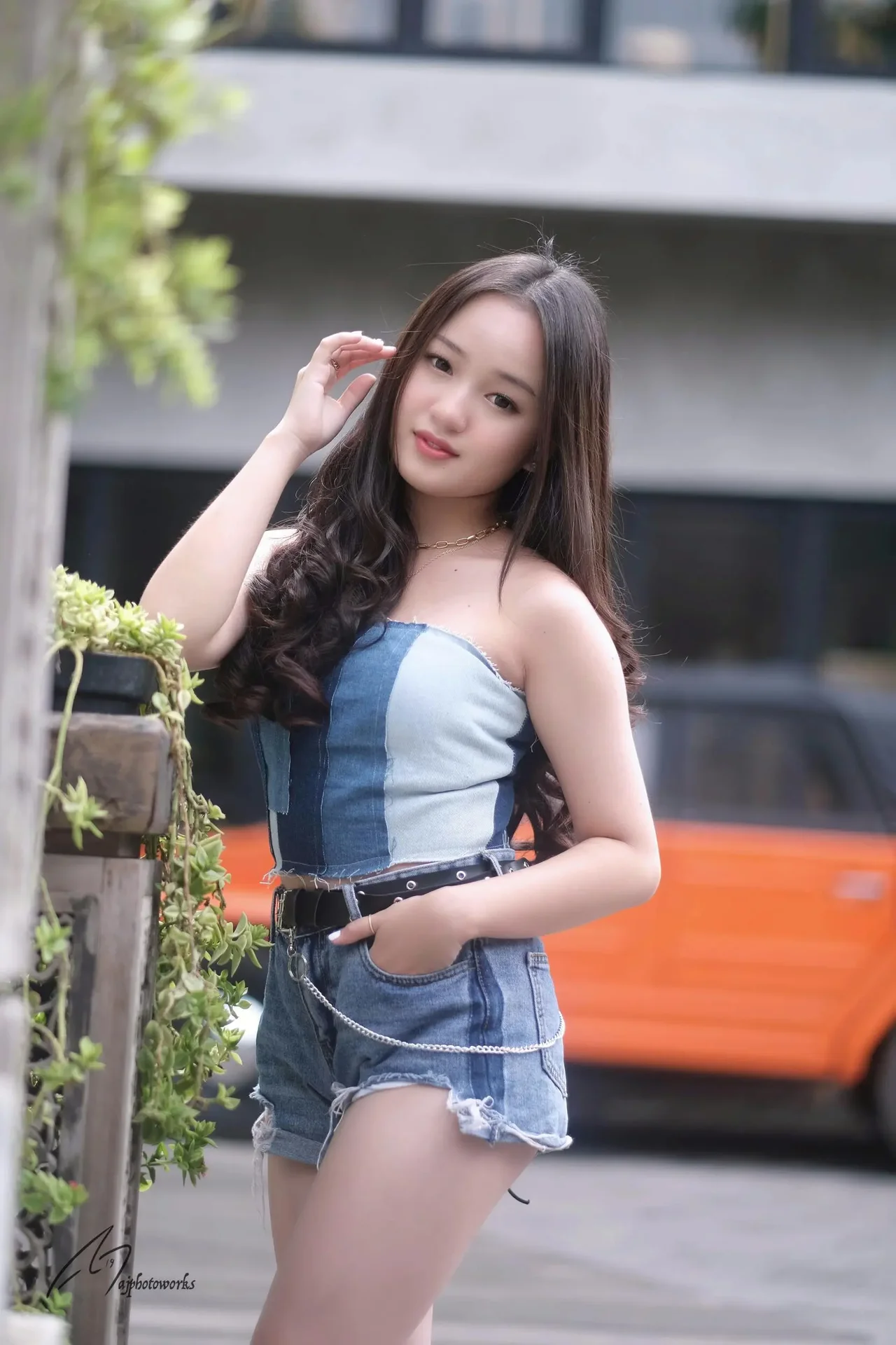 A young woman strolls down a sunlit street, her denim outfit blending casual chic with urban energy. Framed by vintage cars and vibrant greenery, the scene captures a moment of relaxed confidence.