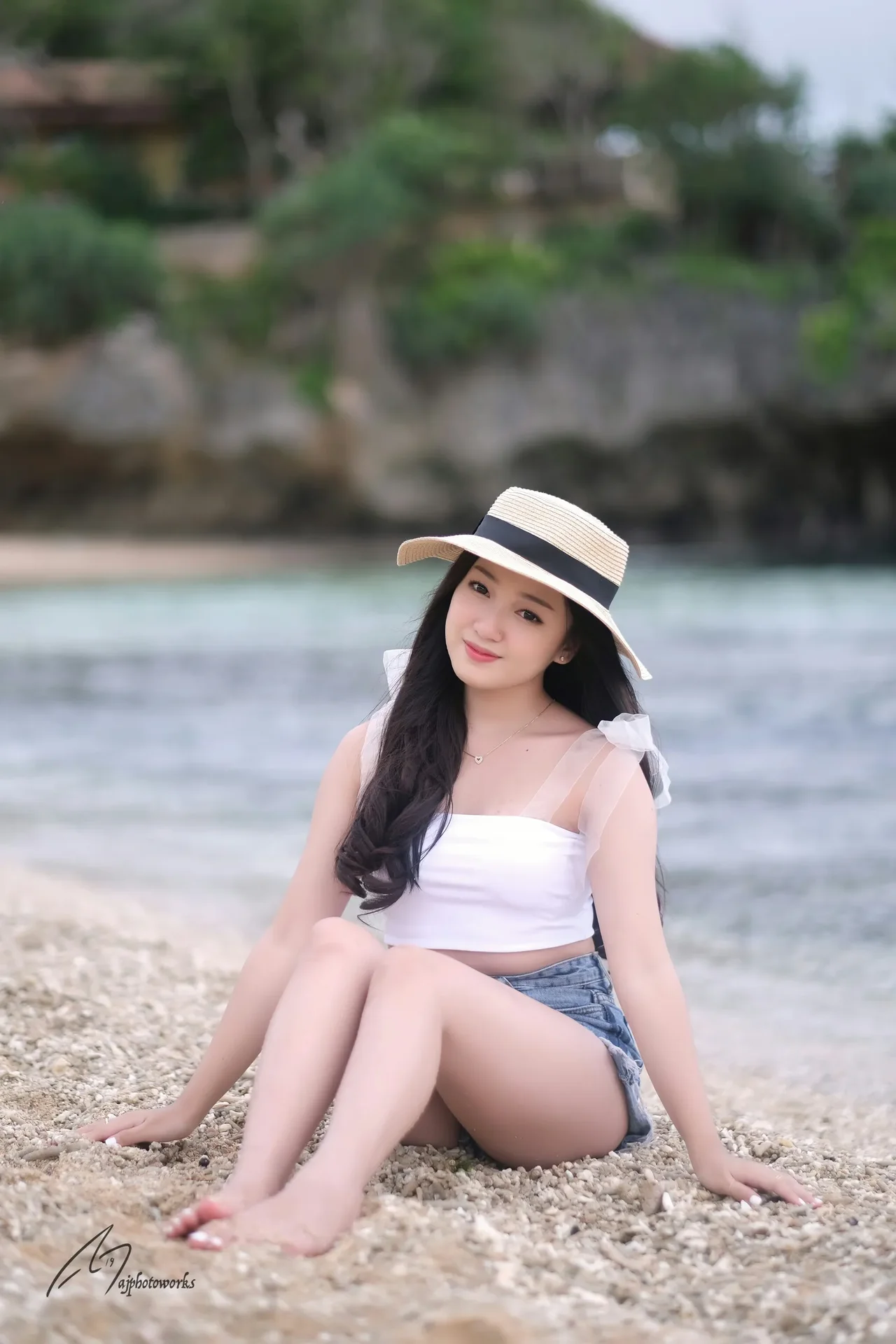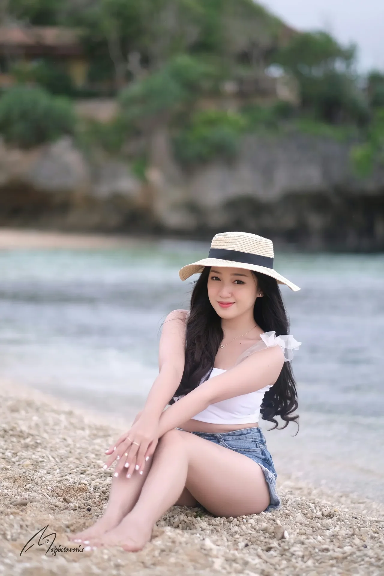 A serene beach portrait of a woman in a white crop top and denim shorts, capturing coastal fashion with natural warmth.