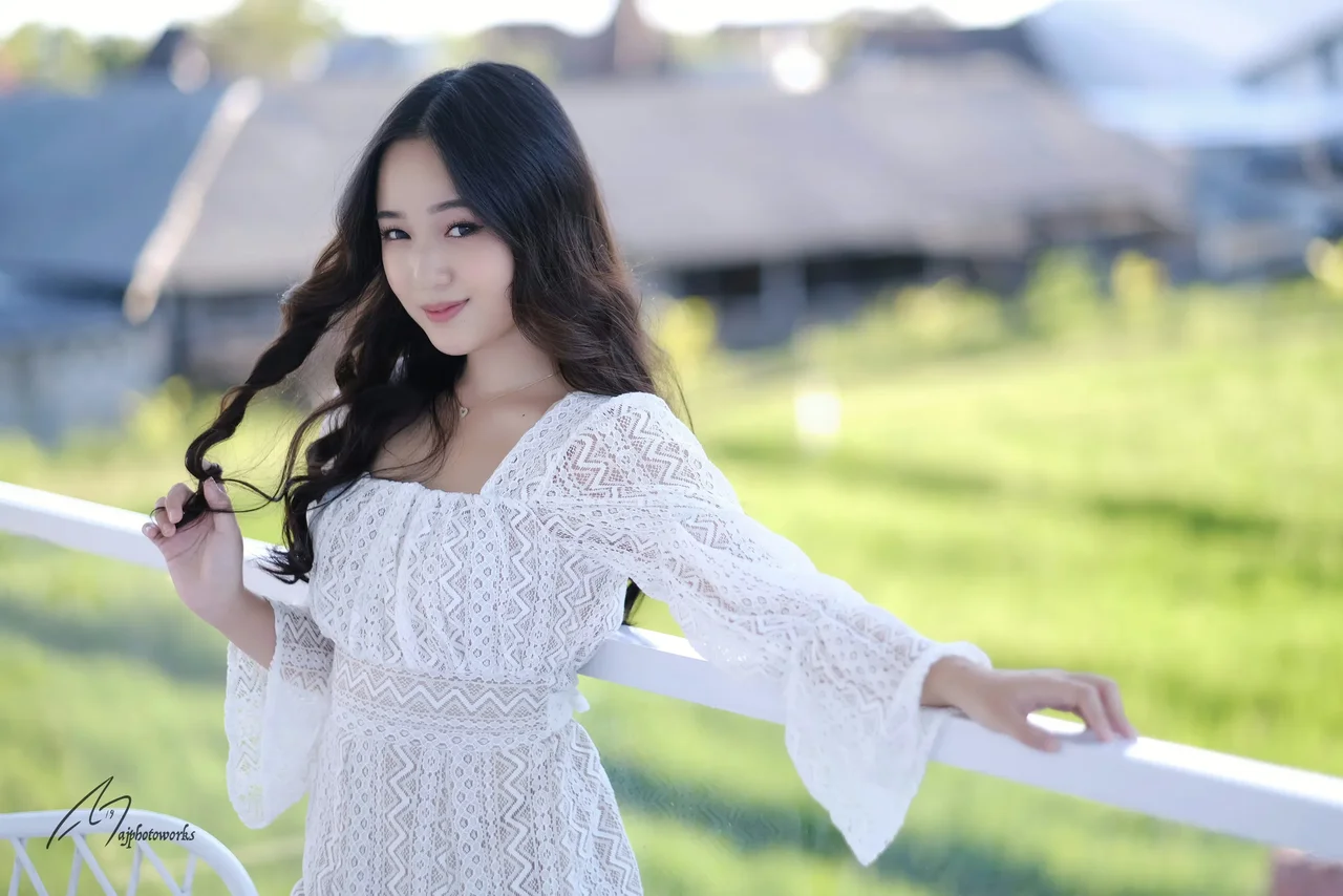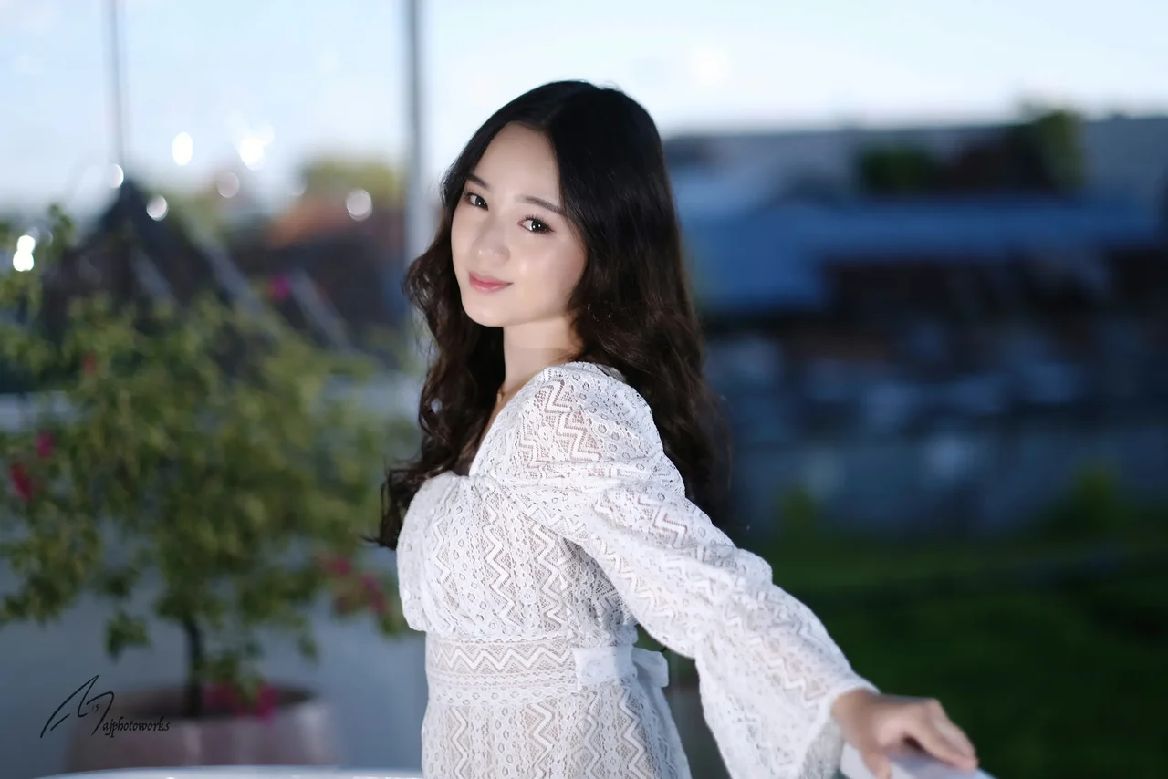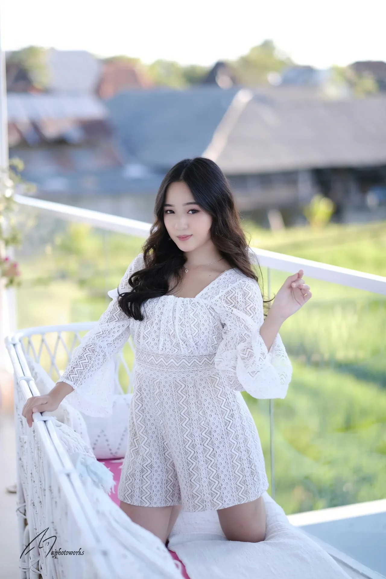 A serene moment captured in soft light, featuring an elegant white lace dress on a balcony surrounded by greenery and warm hues.