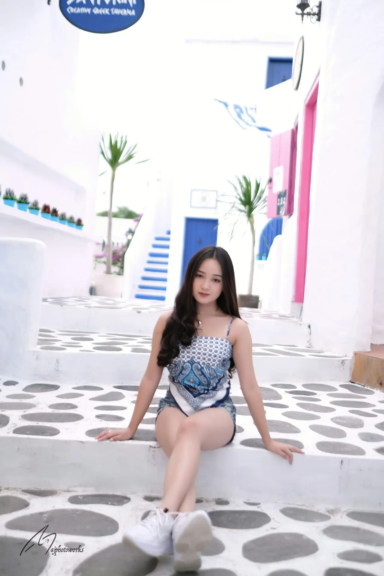 Vibrant blue and white attire blending cultural and fashion elements in a picturesque Greek-inspired setting.