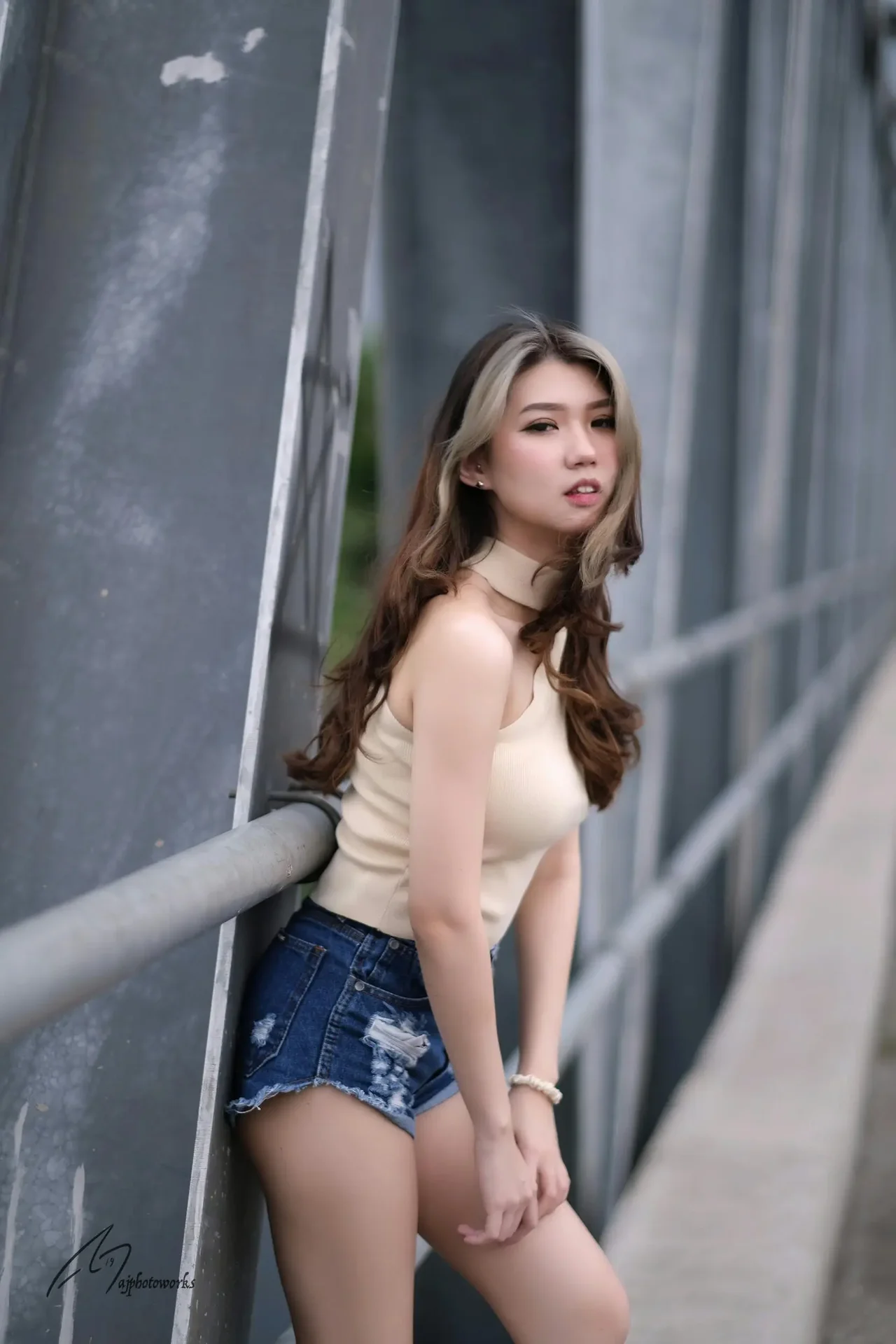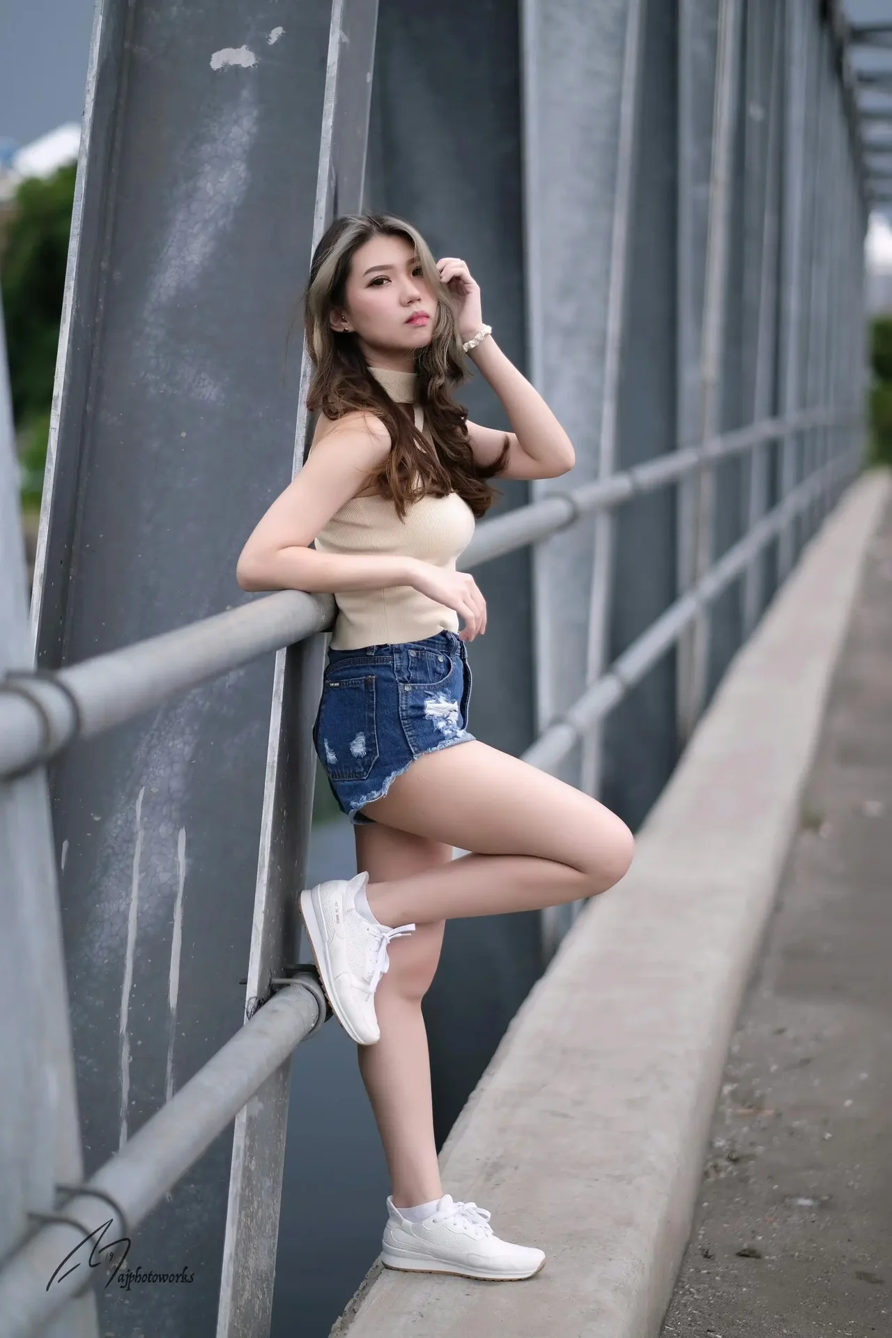 Urban confidence meets casual elegance by the bridge.