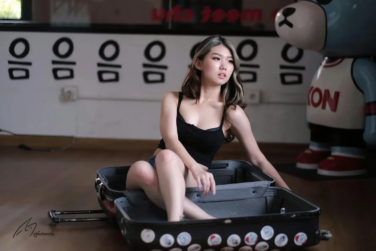 A young woman sits sultrily atop a sticker-covered suitcase in a themed indoor setting, blending playful elements with a sense of anticipation.
