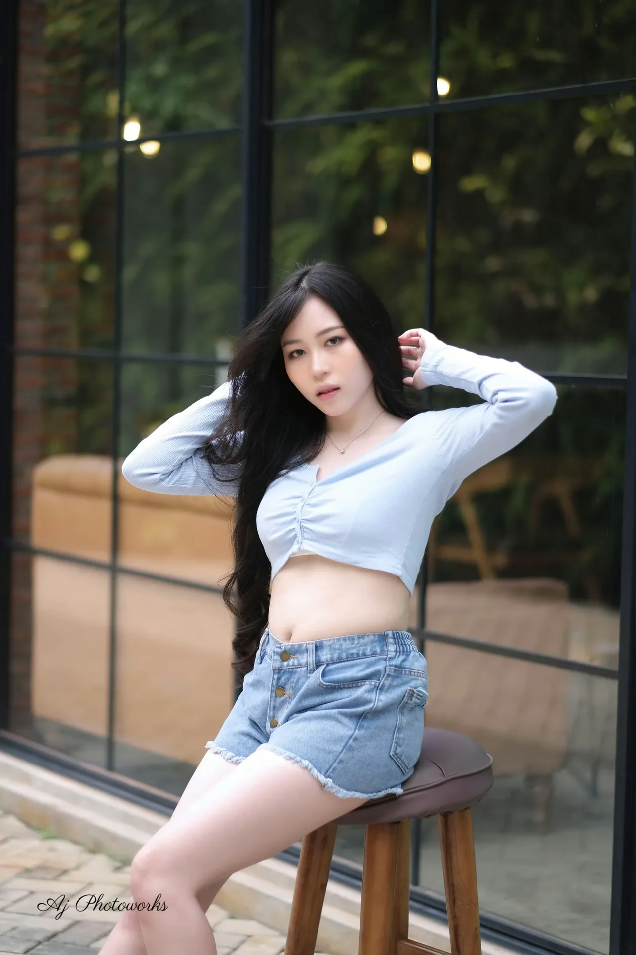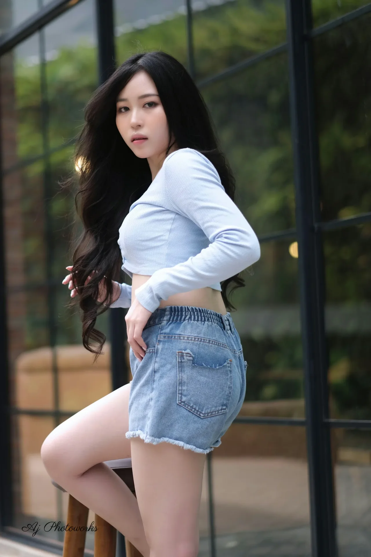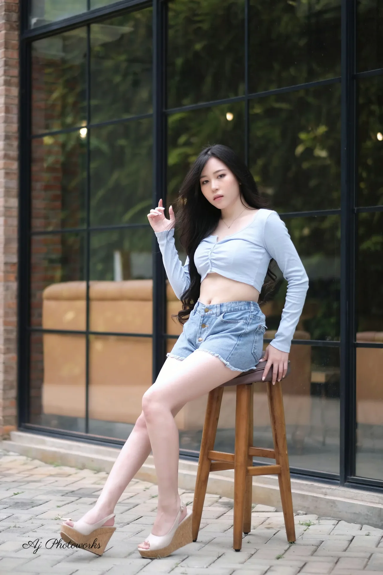 Casual sophistication meets urban textures in a portrait blending soft denim tones, structured transparency, and organic movement against a modern industrial backdrop.
