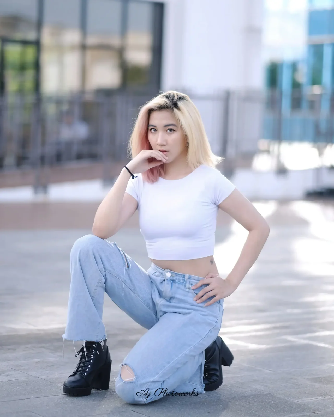 Contrasting pastel and urban aesthetics in a dynamic, confident pose against a blurred metropolitan backdrop.