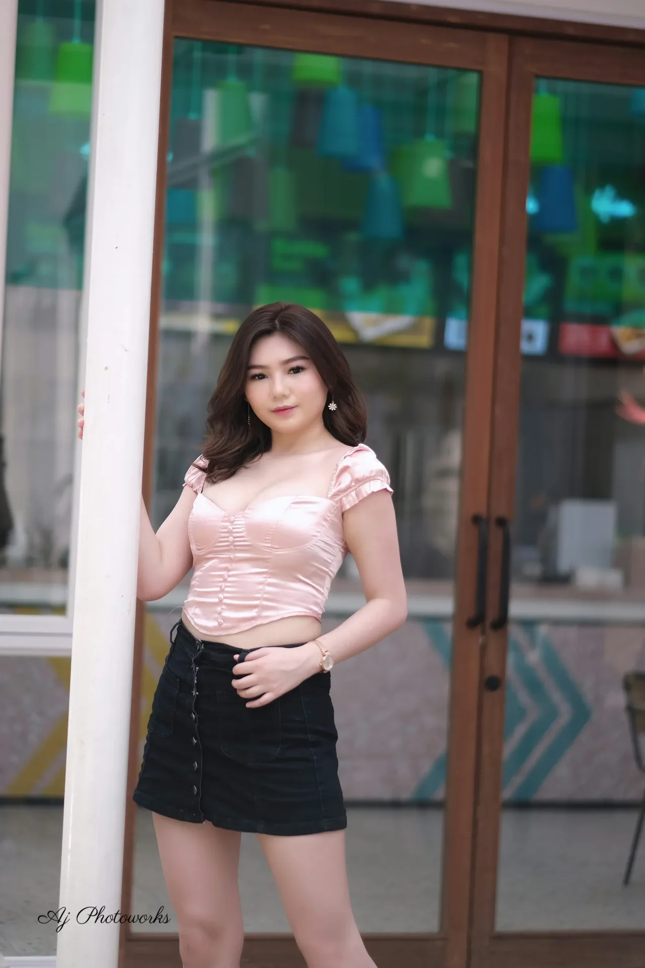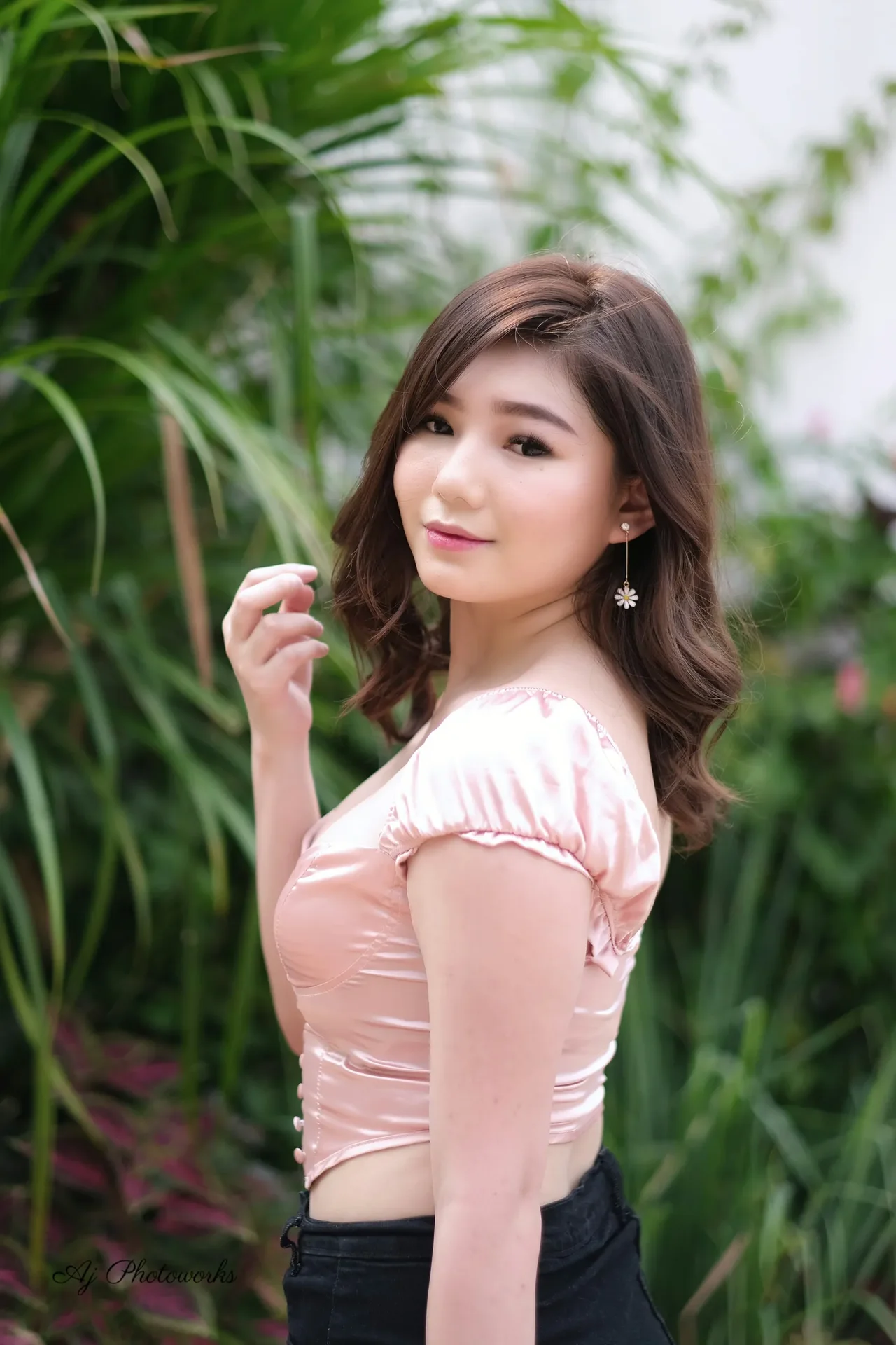 A stylish portrait of a woman in elegant pink satin top and black denim shorts, captured in vibrant outdoor settings with natural light and lush greenery.