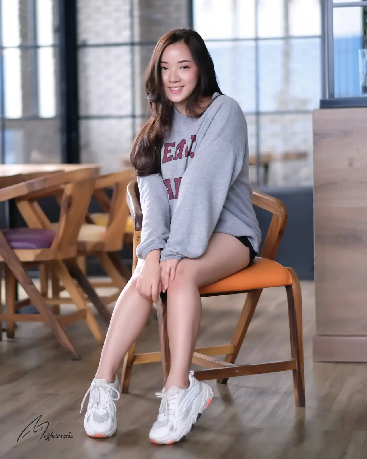 Effortless style meets urban comfort in a serene café setting. The subject exudes confidence with her relaxed posture and stylish casual ensemble.
