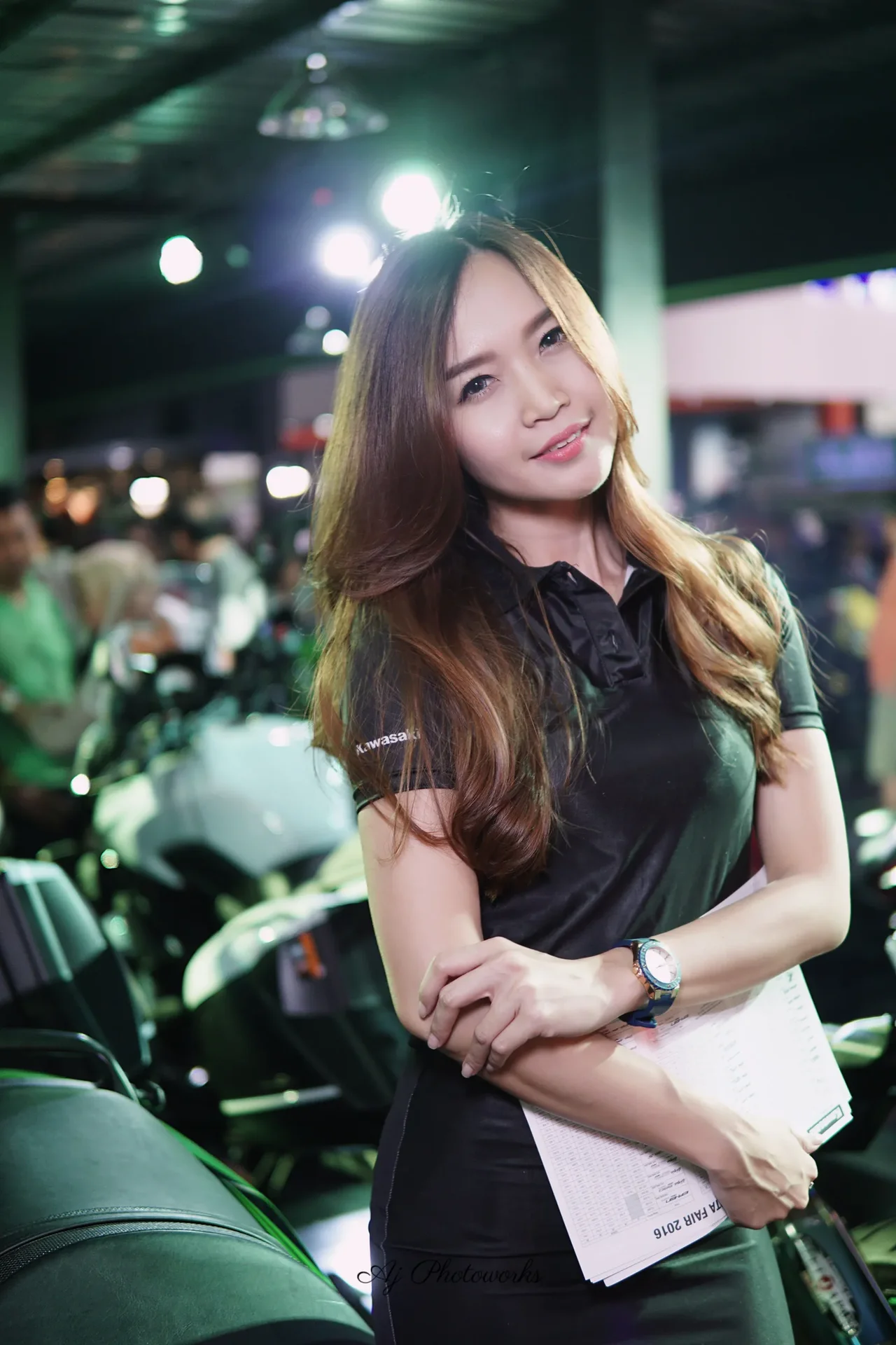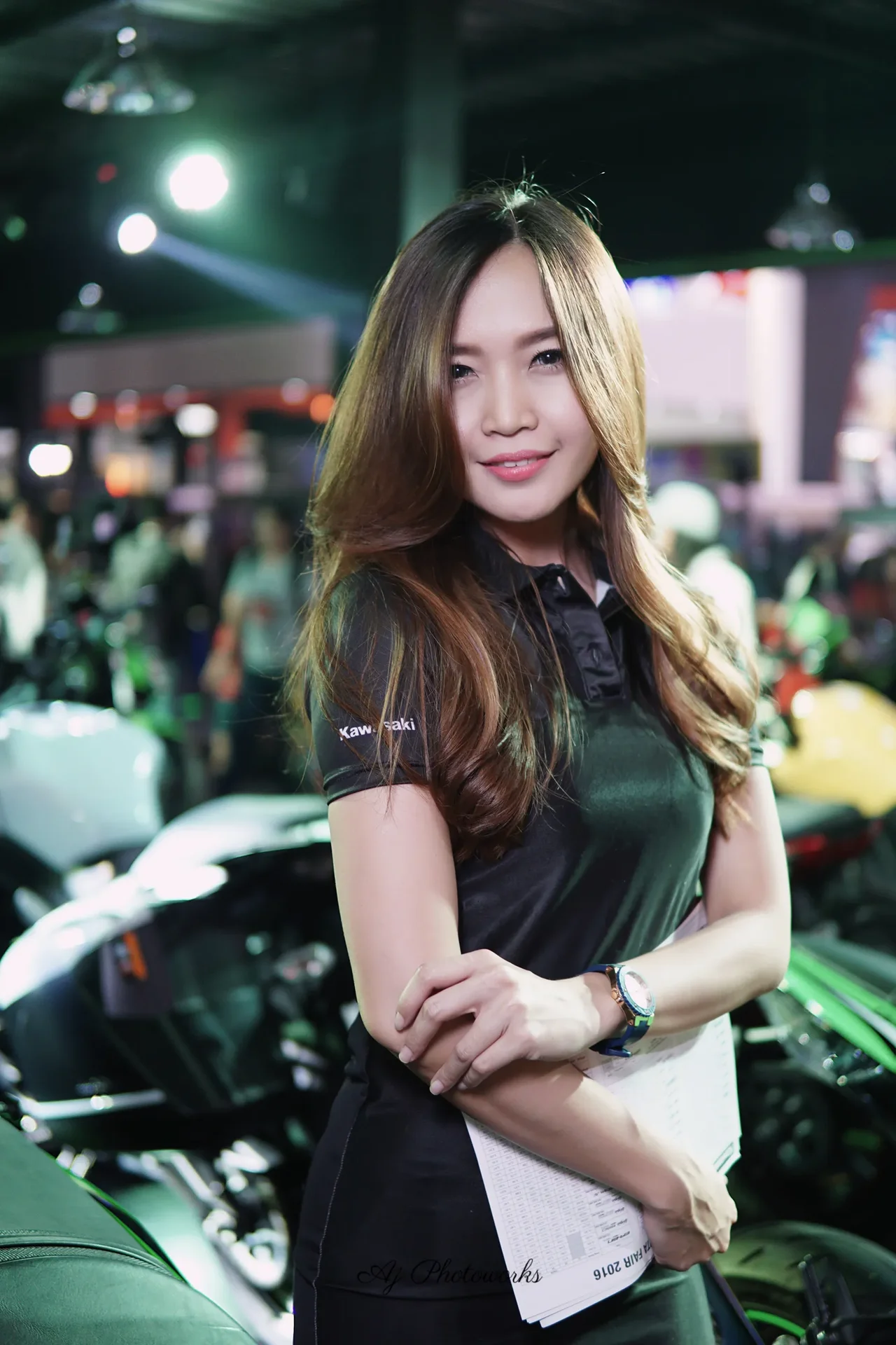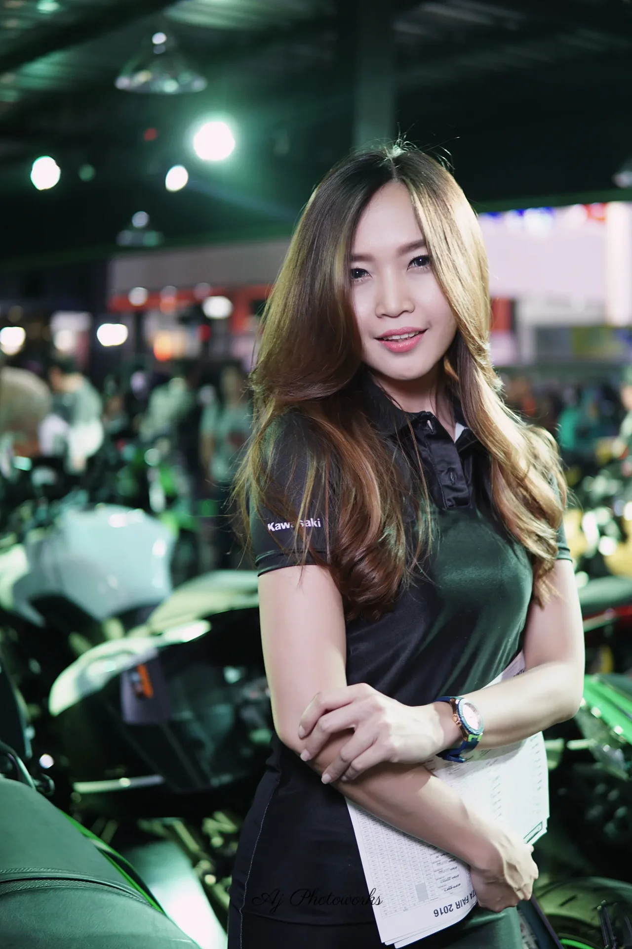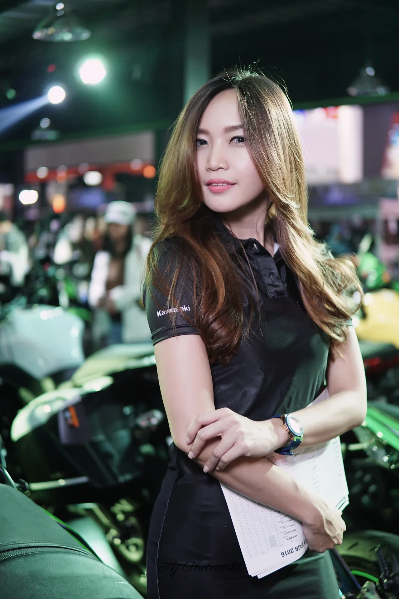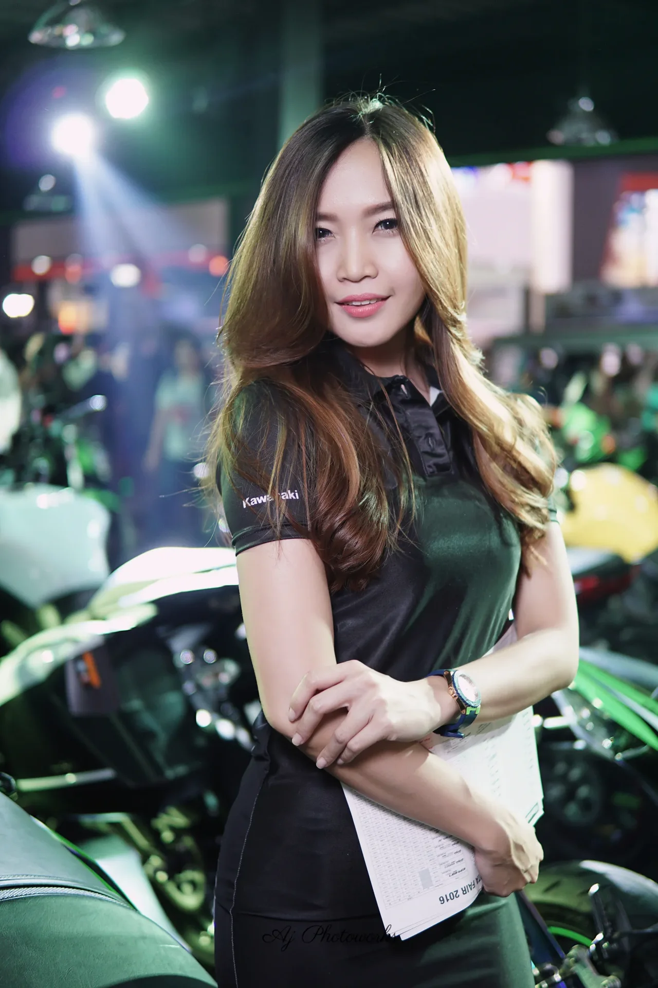 A confident young woman showcases a Kawasaki-branded ensemble at a vibrant motorcycle exhibition, where sleek bikes and strategic lighting highlight her attire and poised demeanor.