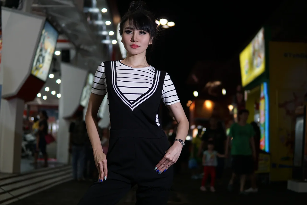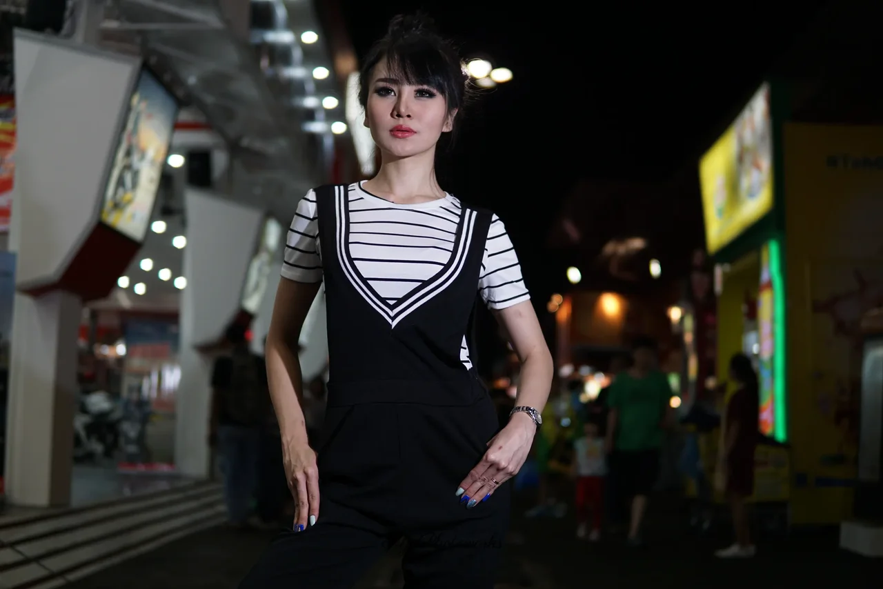 A woman exudes confidence in a striking black and white outfit, blending modern fashion with dynamic urban energy.