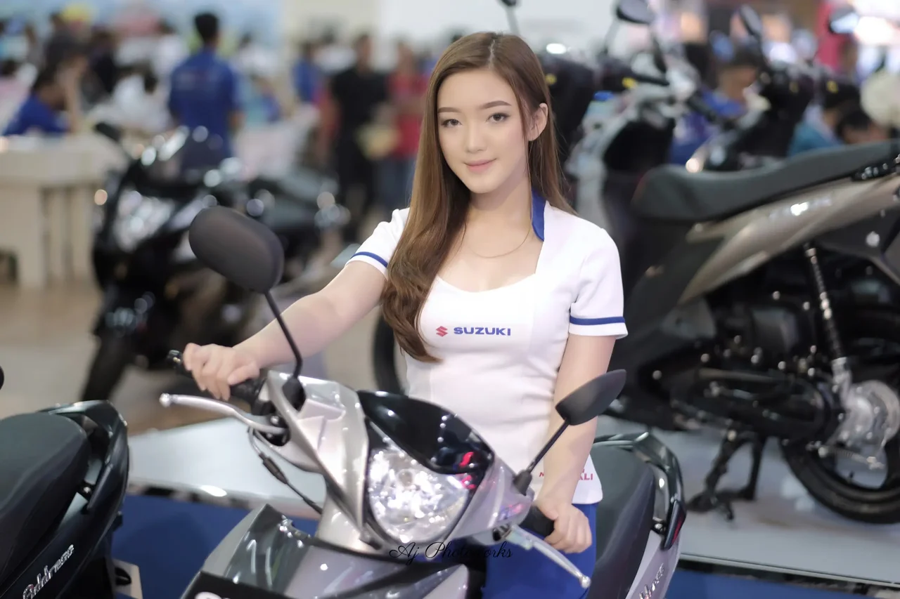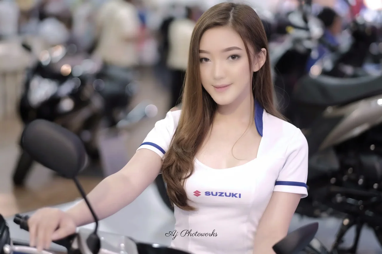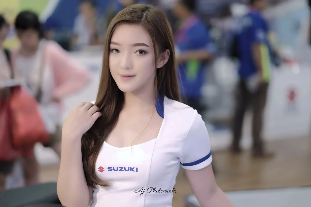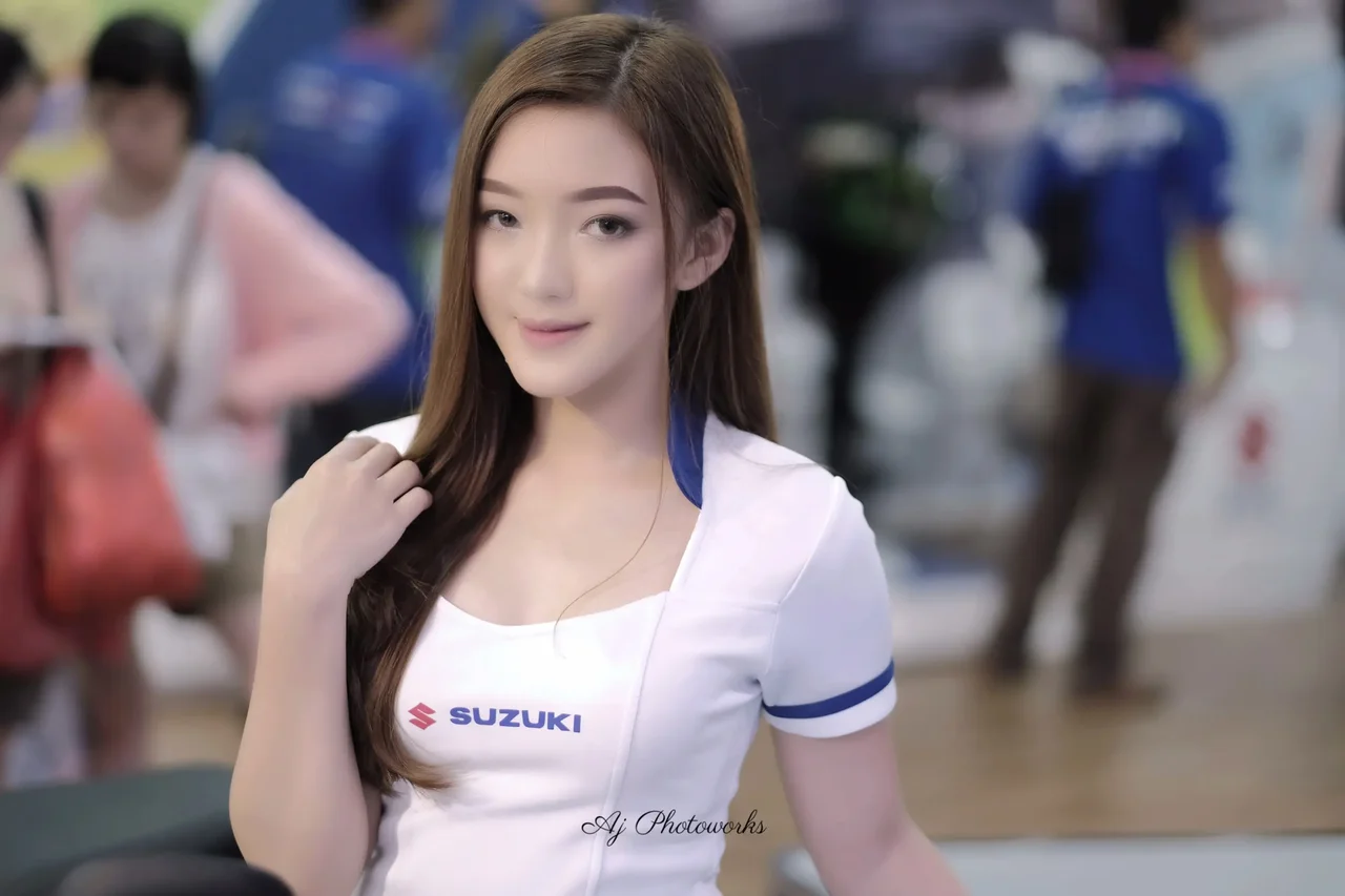 A professional model posed confidently in a white Suzuki-branded uniform at a bustling indoor exhibition, radiating promotional energy and polished professionalism.