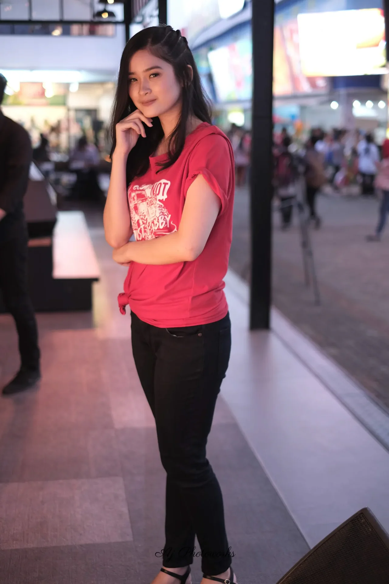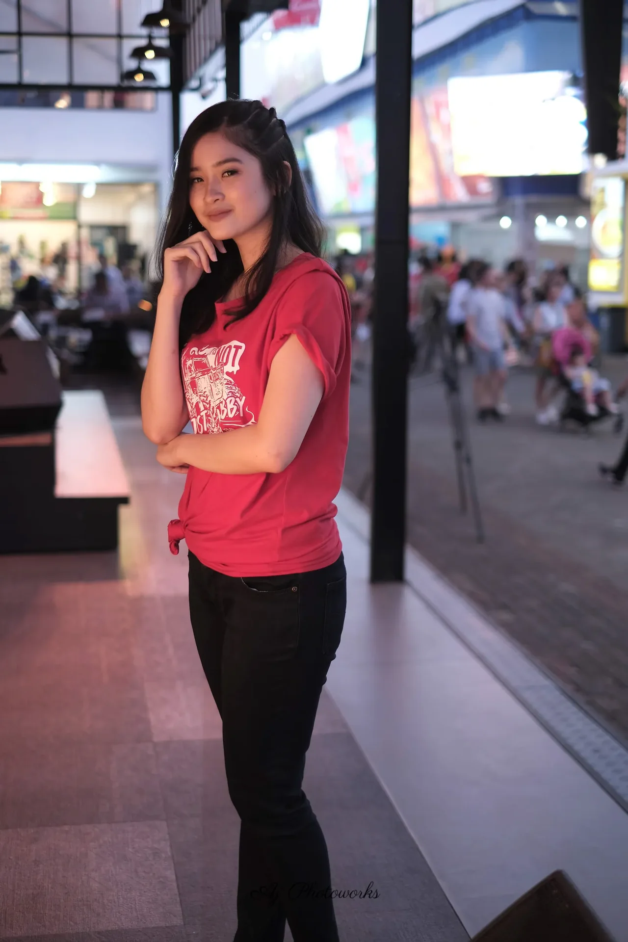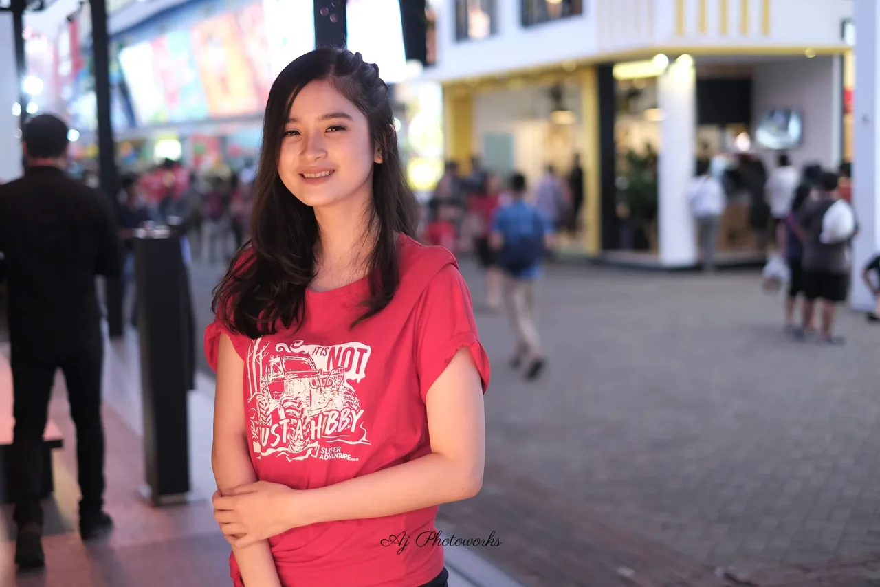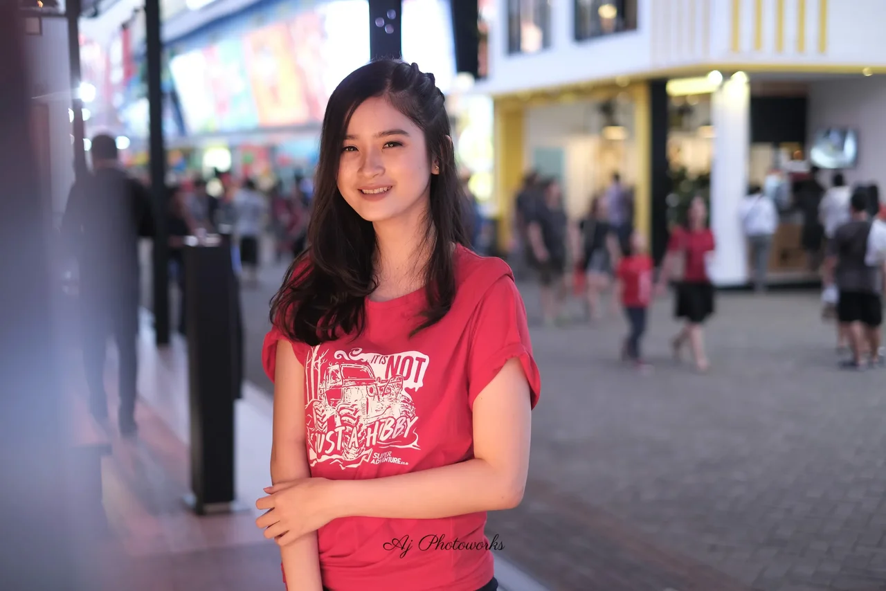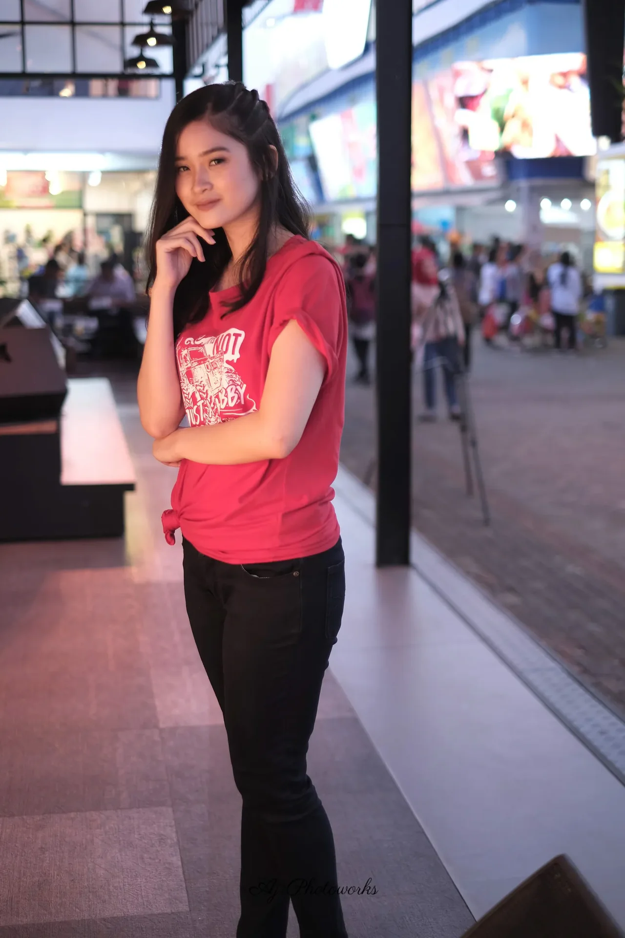A young woman in a red graphic tee stands confidently in a bustling modern mall, blending casual style with the vibrant energy of urban nightlife.