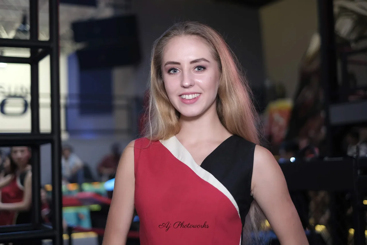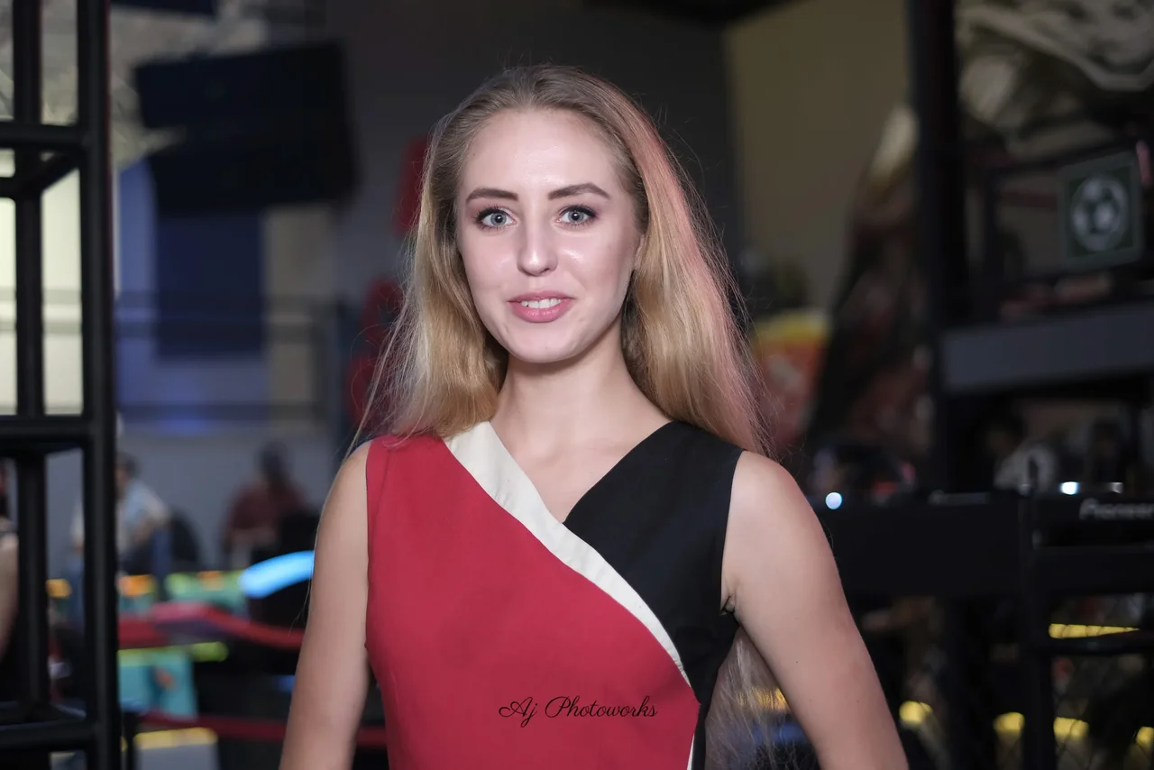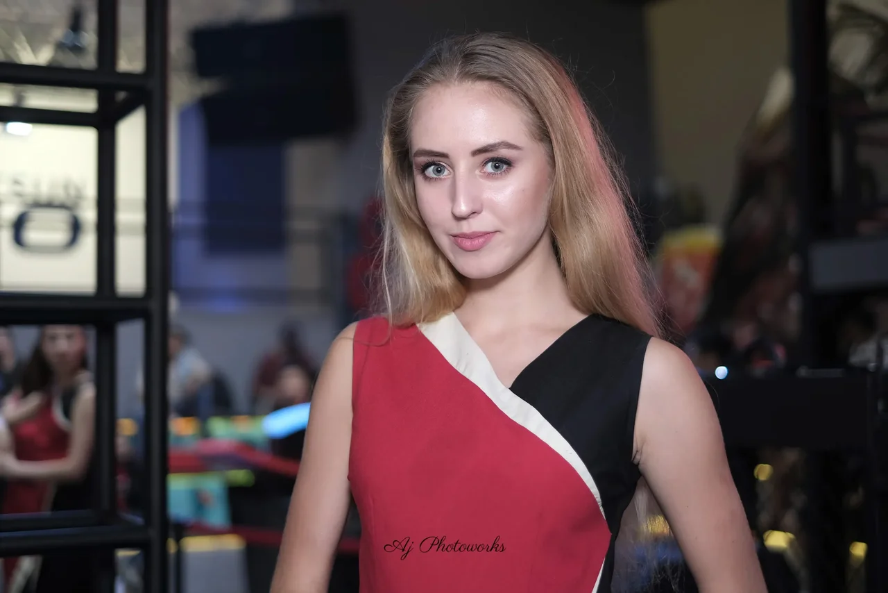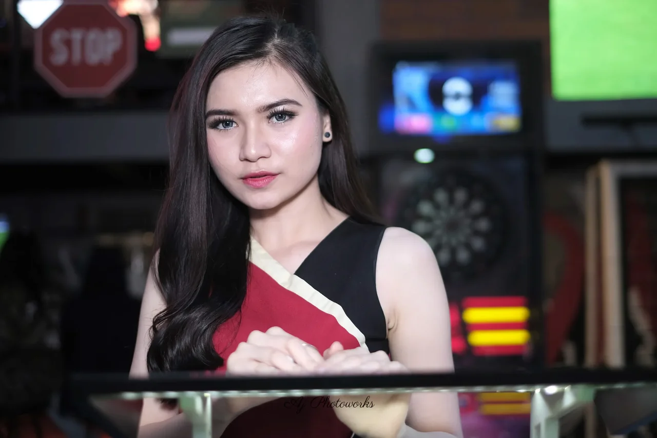 A striking portrait of elegance captured against the vibrant energy of a neon-lit venue.