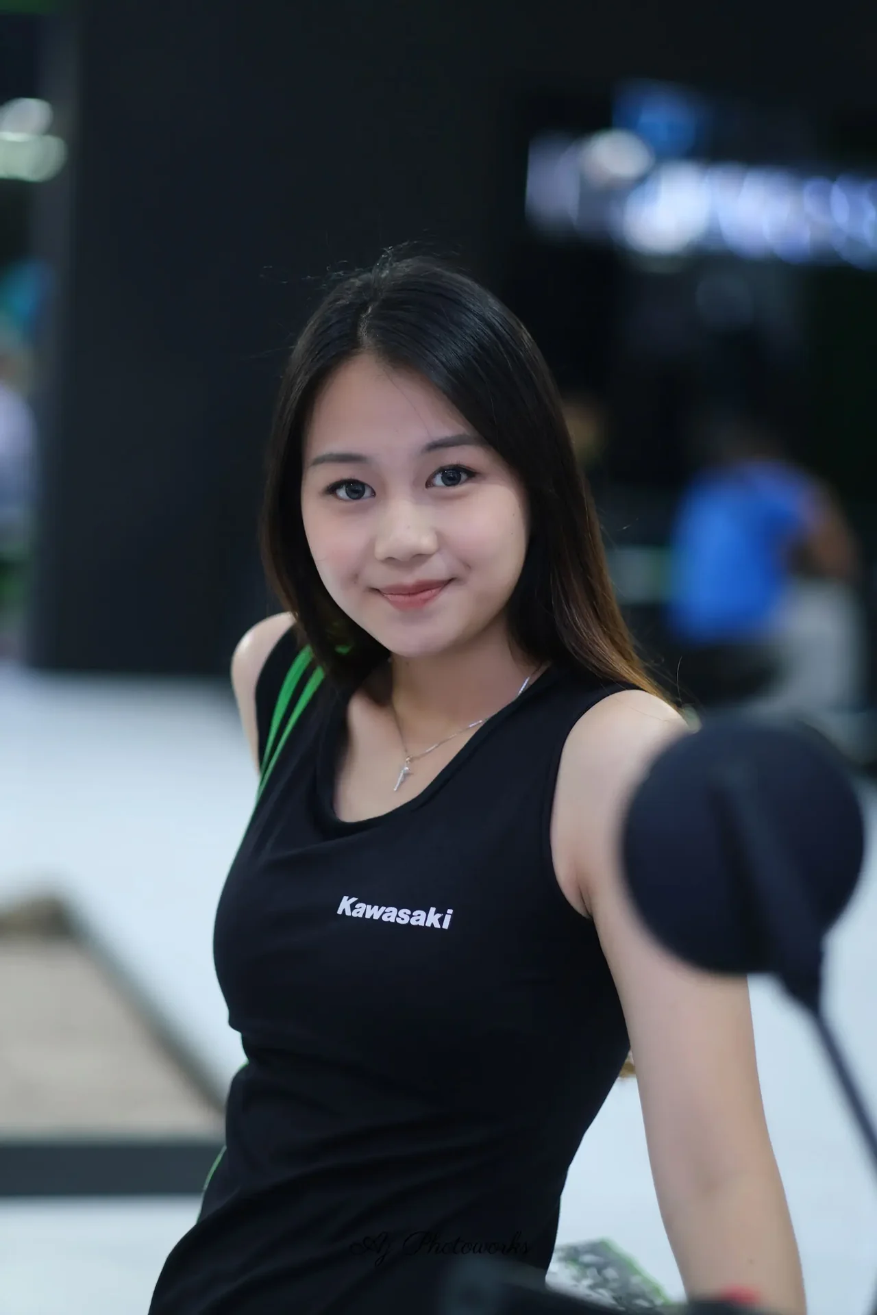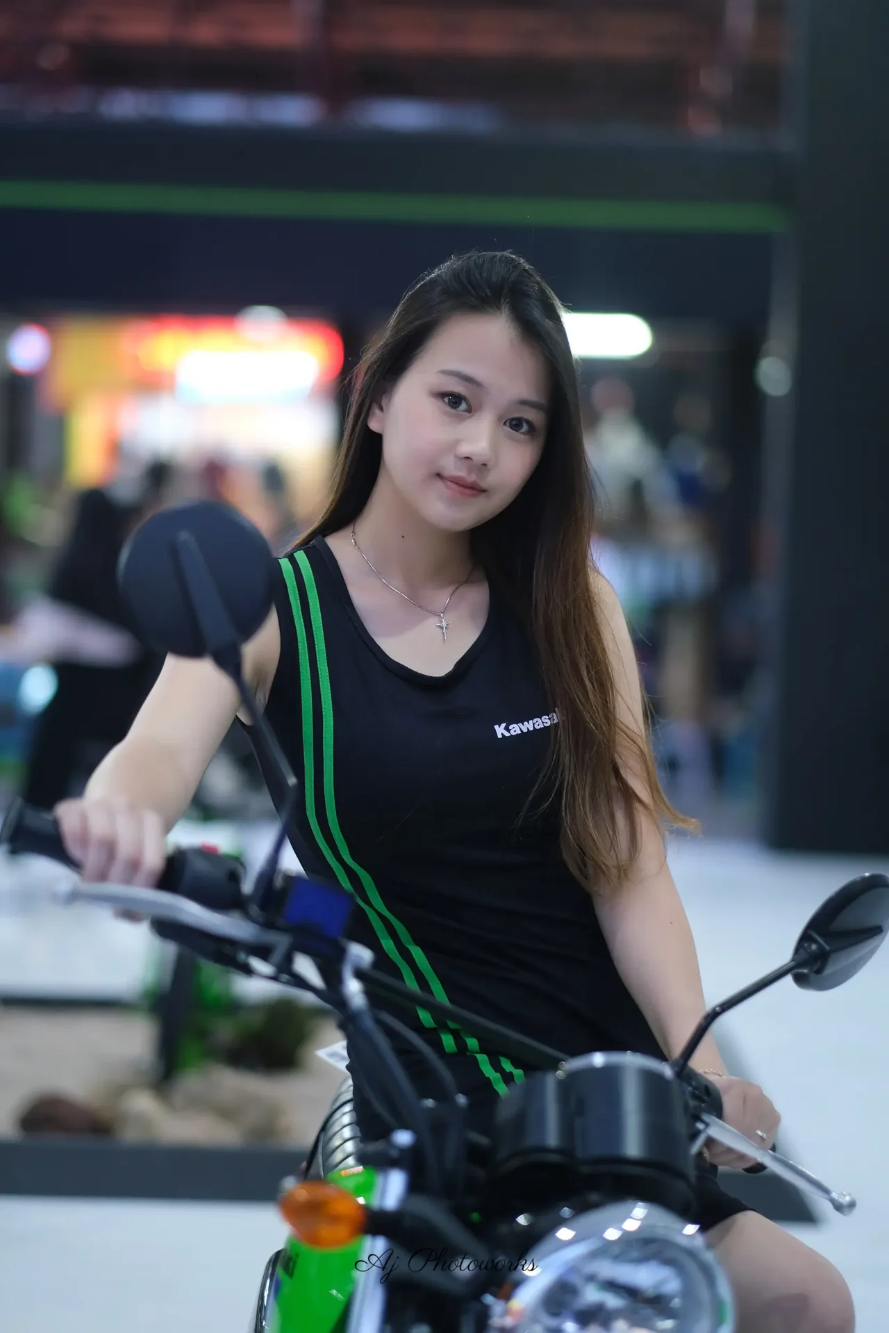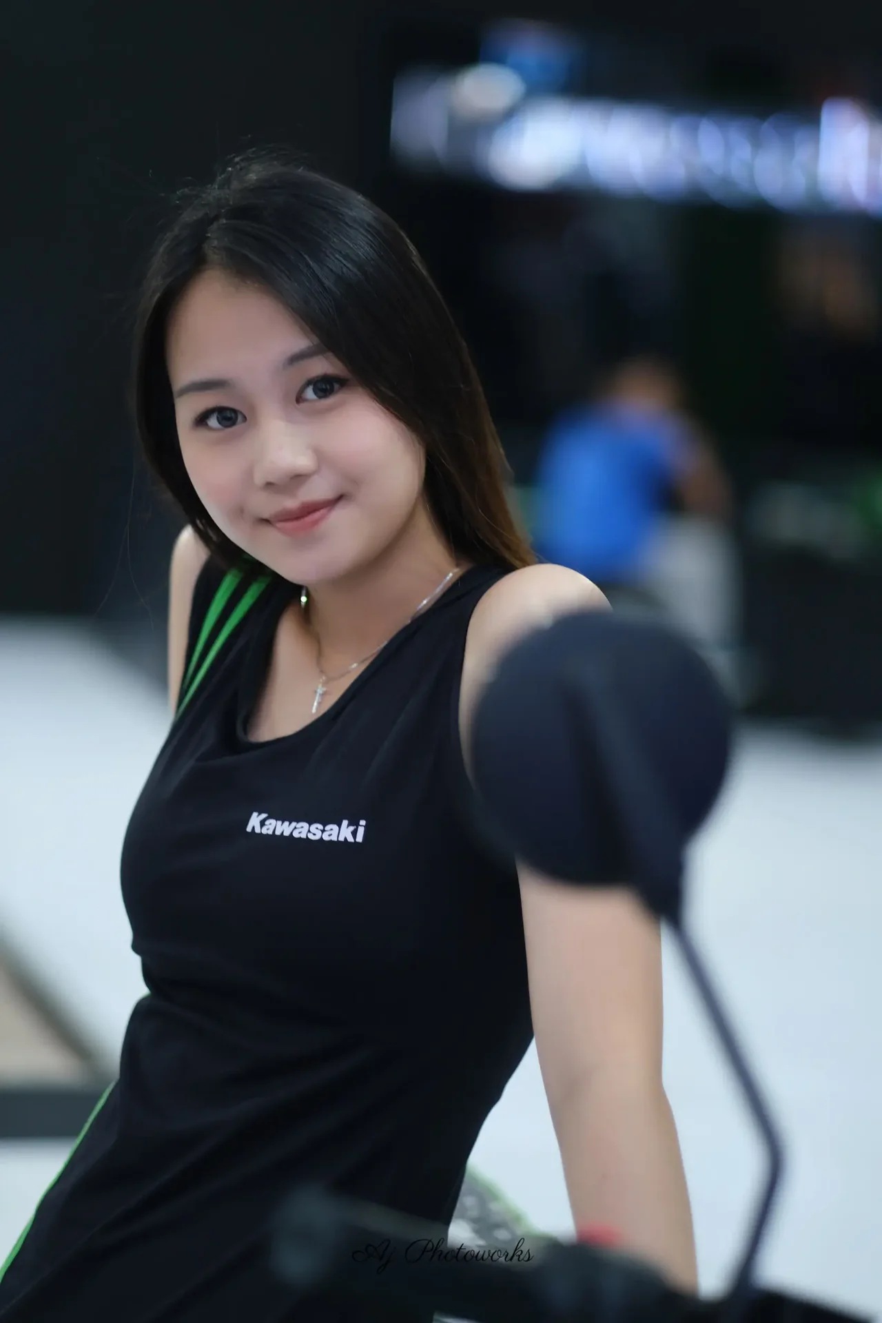 Sleek Kawasaki brand ambassador posing confidently at an indoor motorsport exhibition.