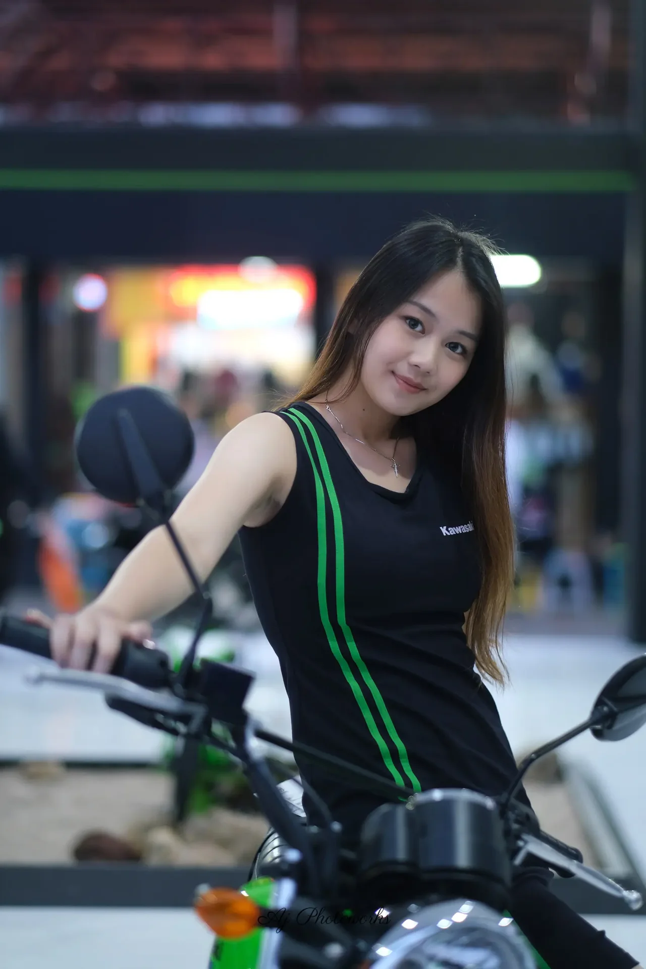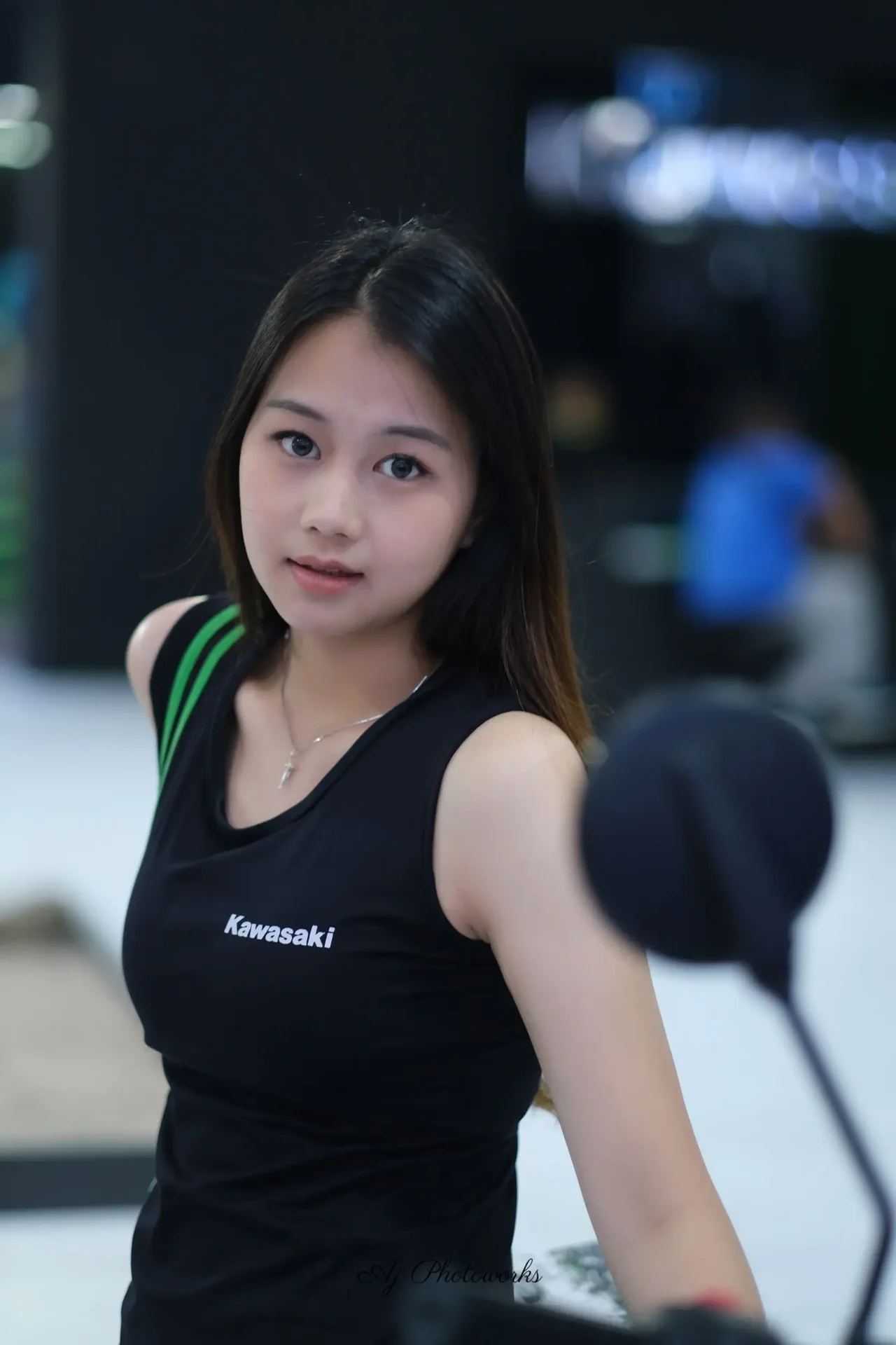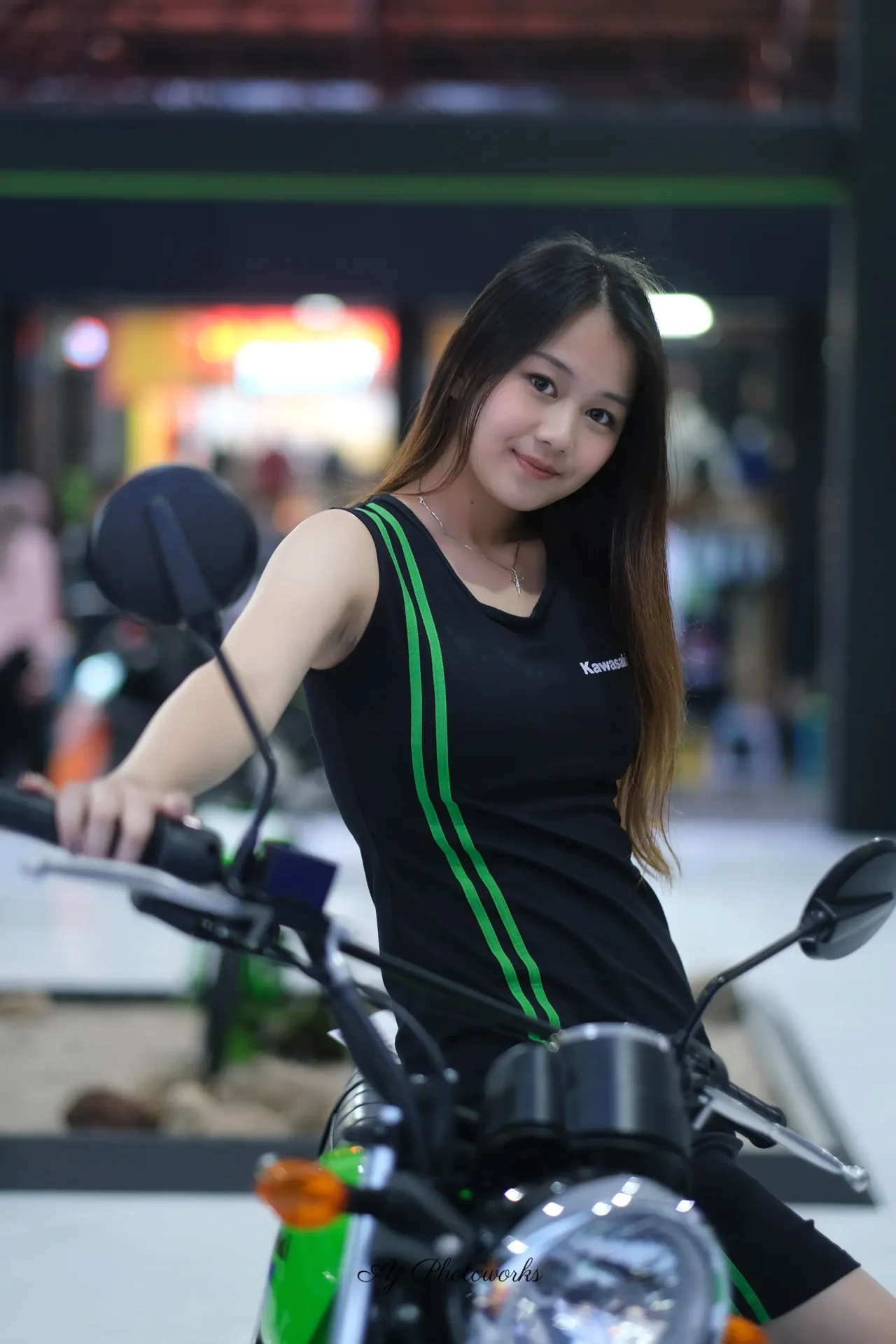 Sleek Kawasaki brand ambassador posing confidently at an indoor motorsport exhibition.