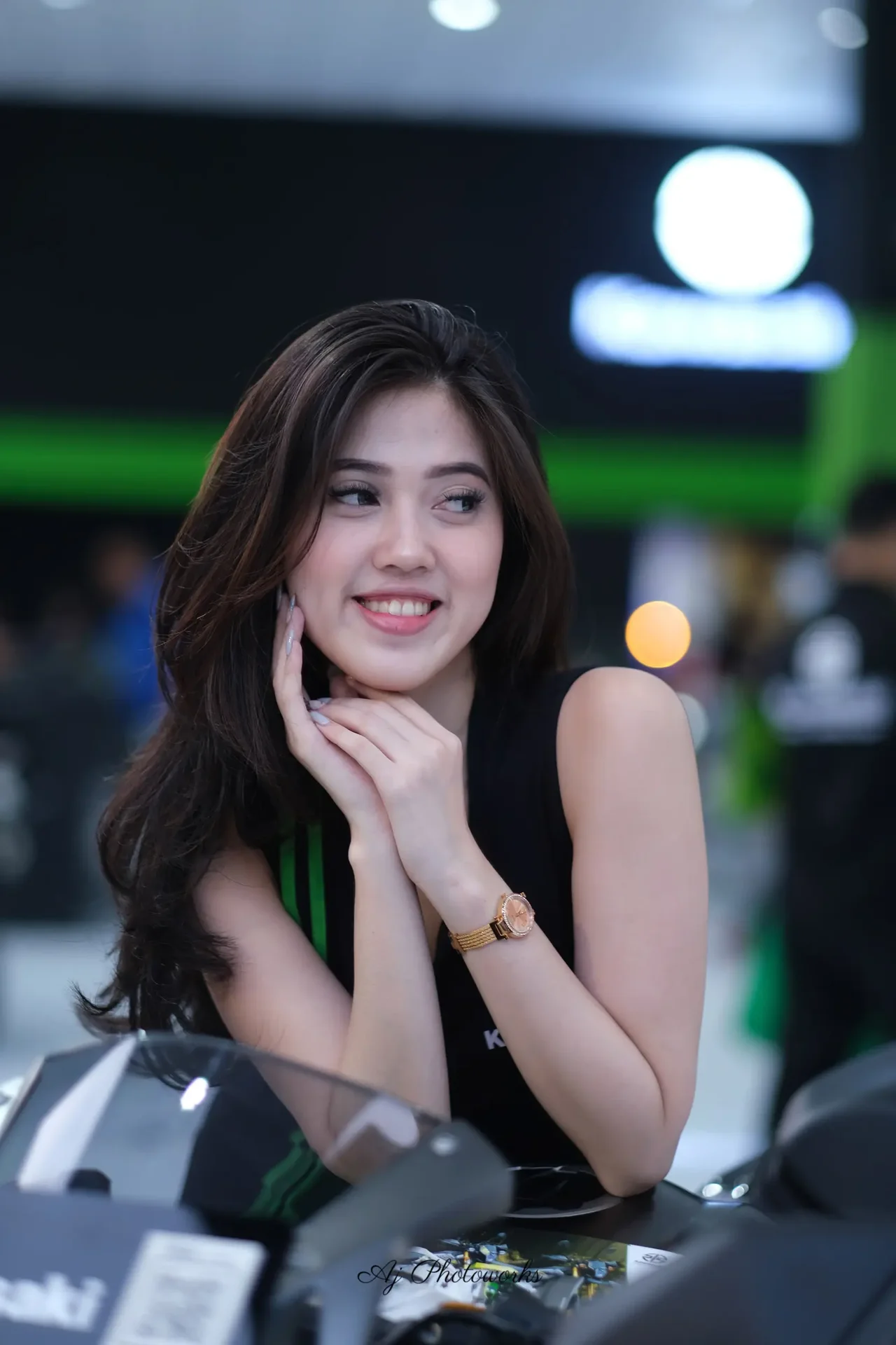 Graceful poise at the Kawasaki show unveils style meets mechanics in a vibrant, industrial-lit portrait.