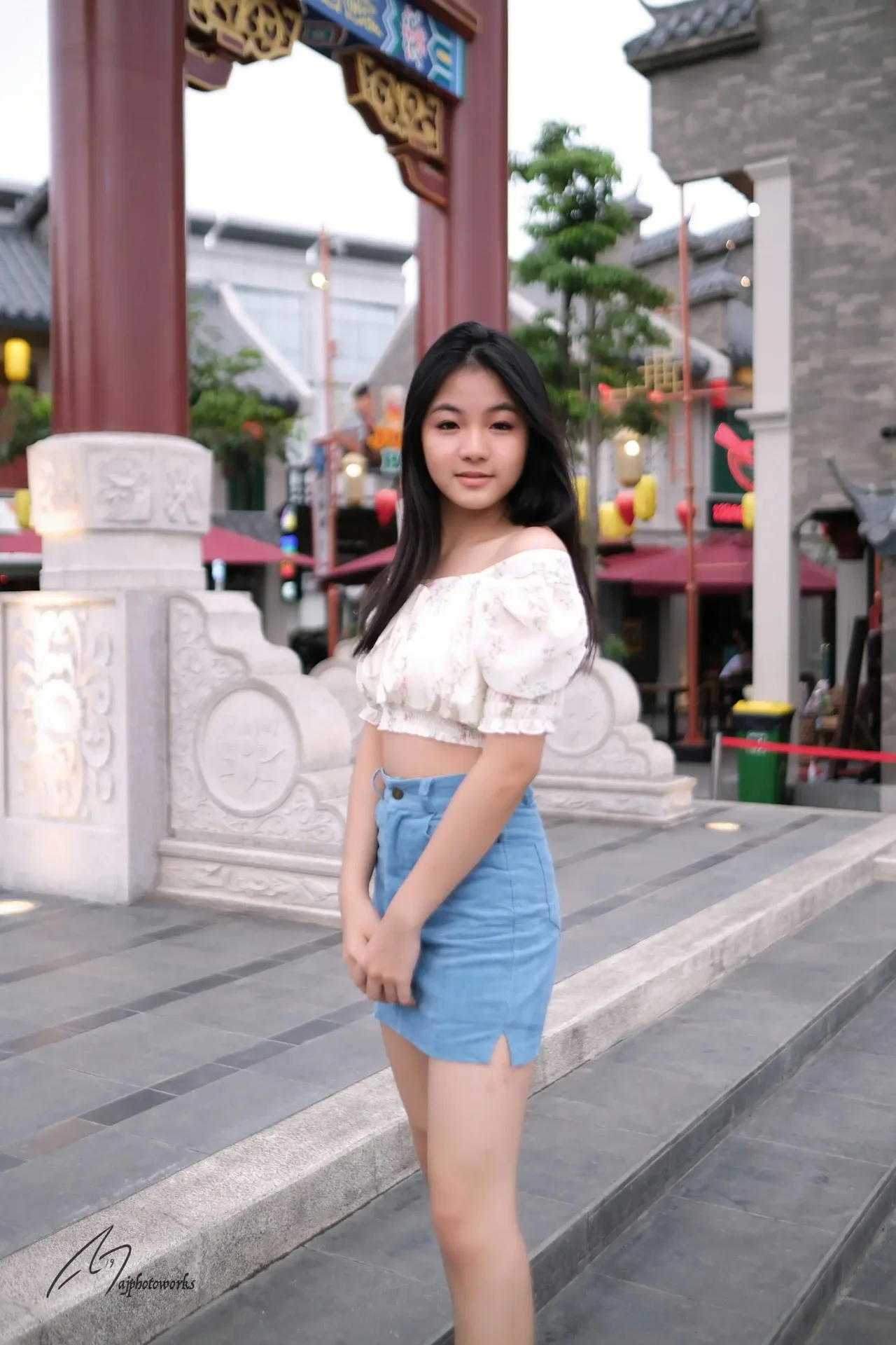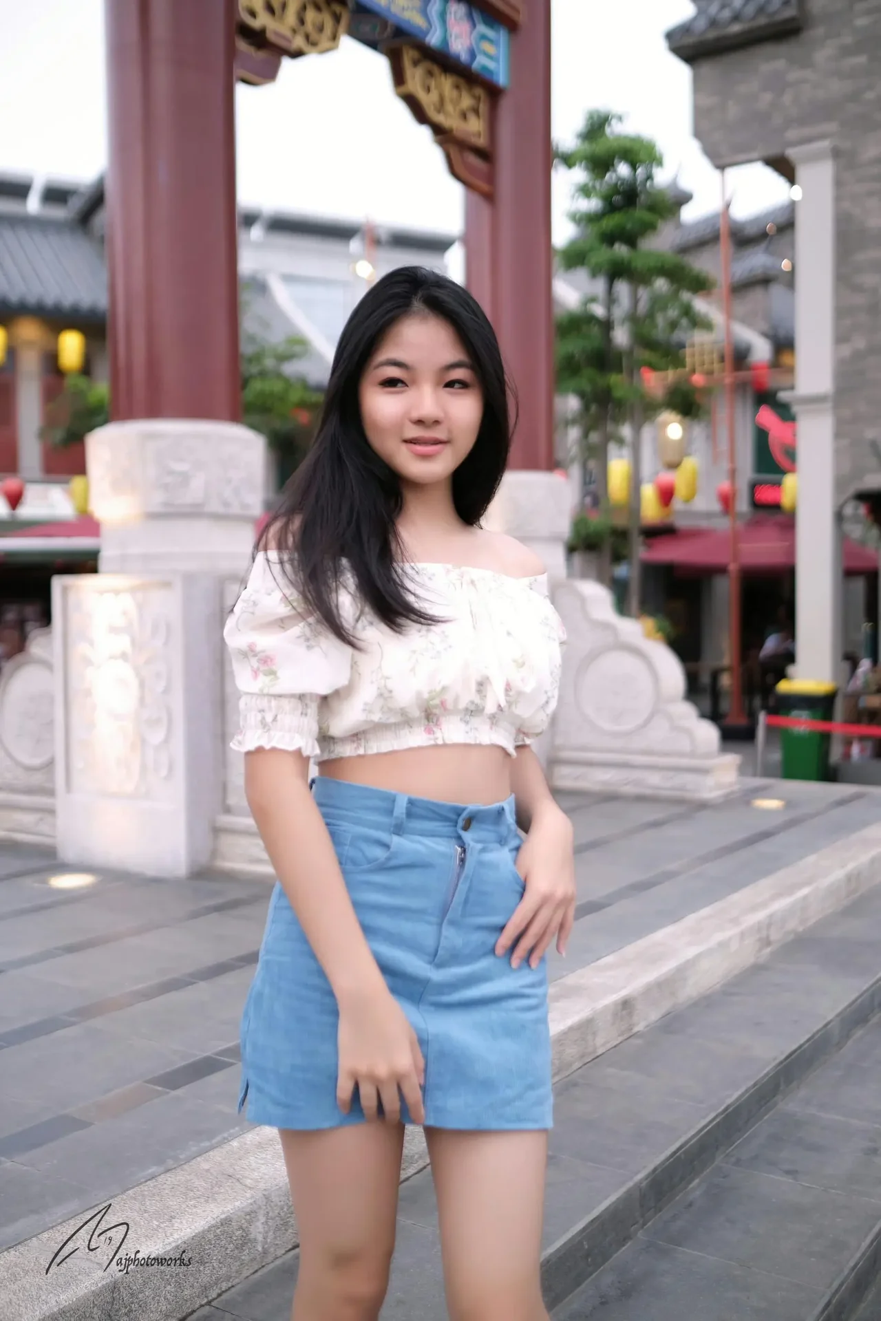 A young woman poses in vibrant urban and cultural settings, blending modern fashion with traditional Asian architectural elements.