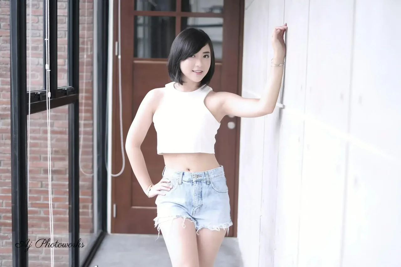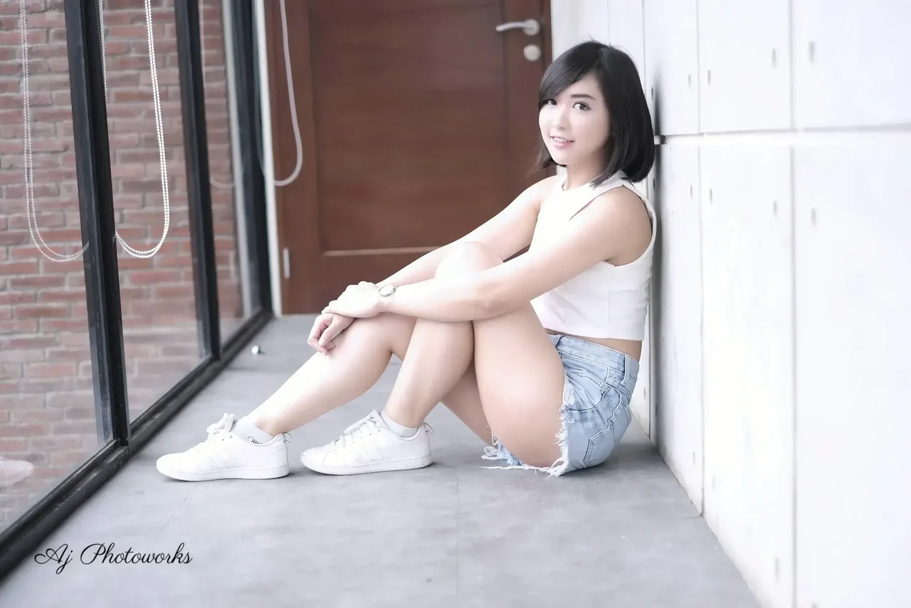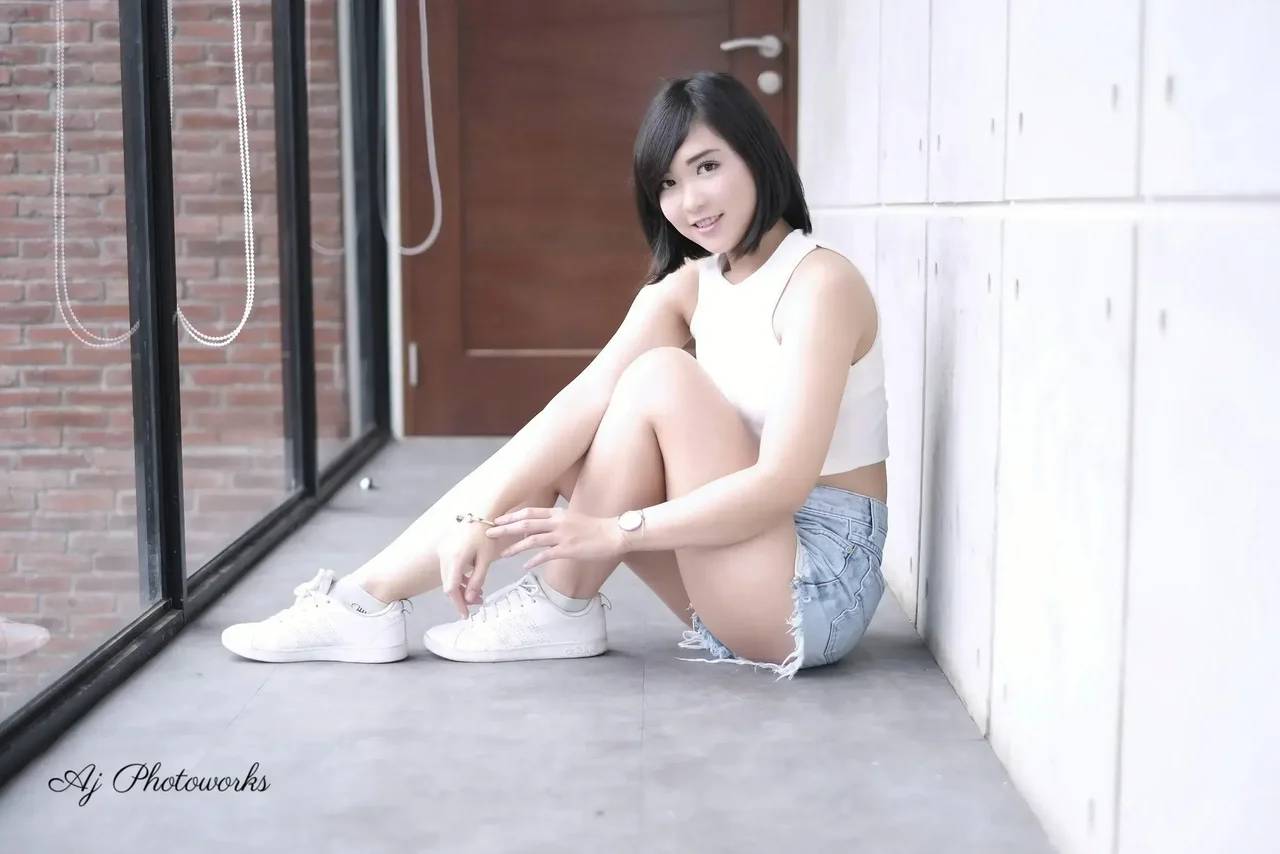 The model embodies a relaxed and confident fashion-forward vibe in a urban studio setting.